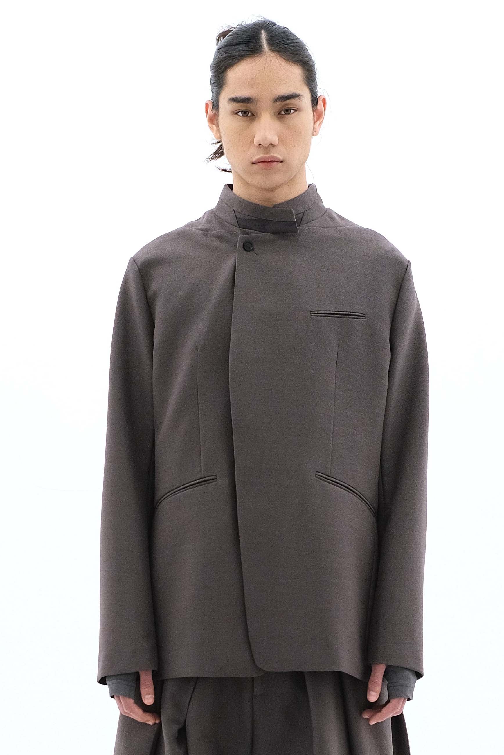 In an effort to develop a fresh visual system, ATTEMPT Project 11 reconstructs several aspects and styles. Founded by Attempt’s creator Liang Dong, ATTEMPT Project 11 is a more experimental approach to creation and production, involving knowledge of both the historical and contemporary forms of society, developing an artistic form that is both rooted in and distinct from the present. In the end, the product needs to be something that isn't easily characterised as seen with the Oriental Blazer Brown.