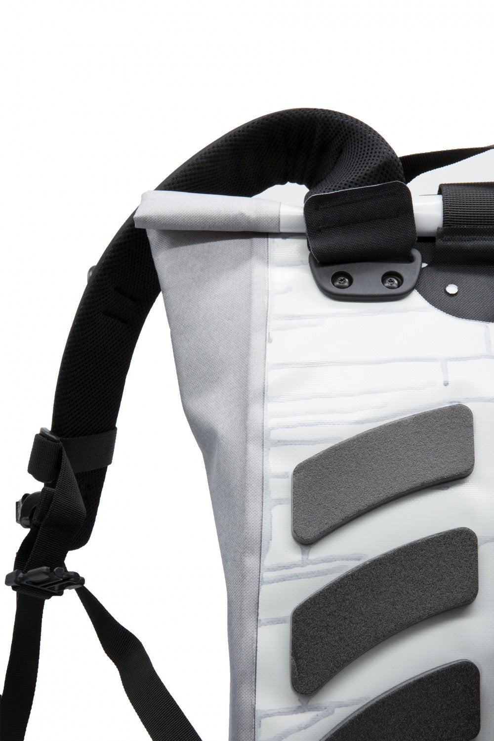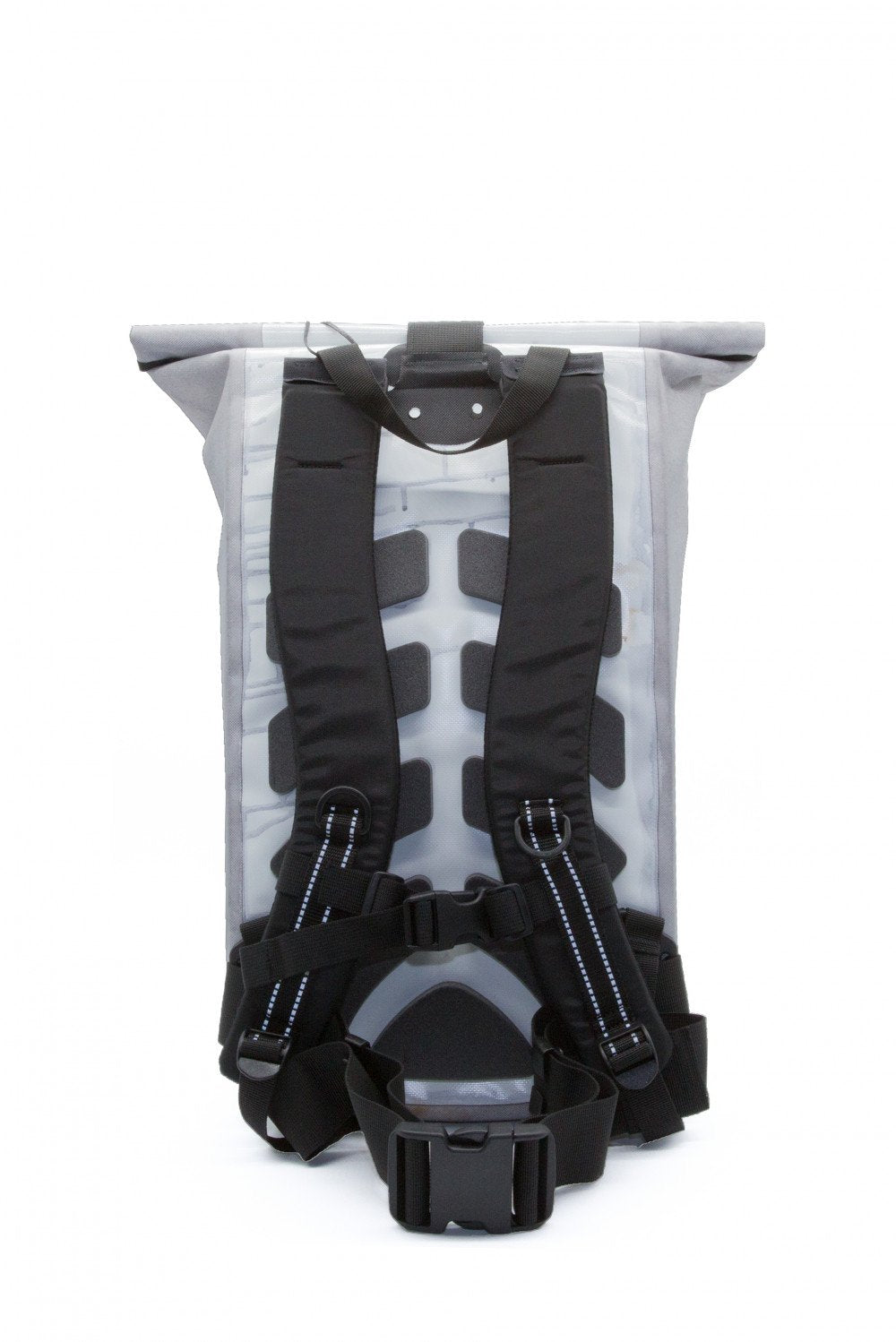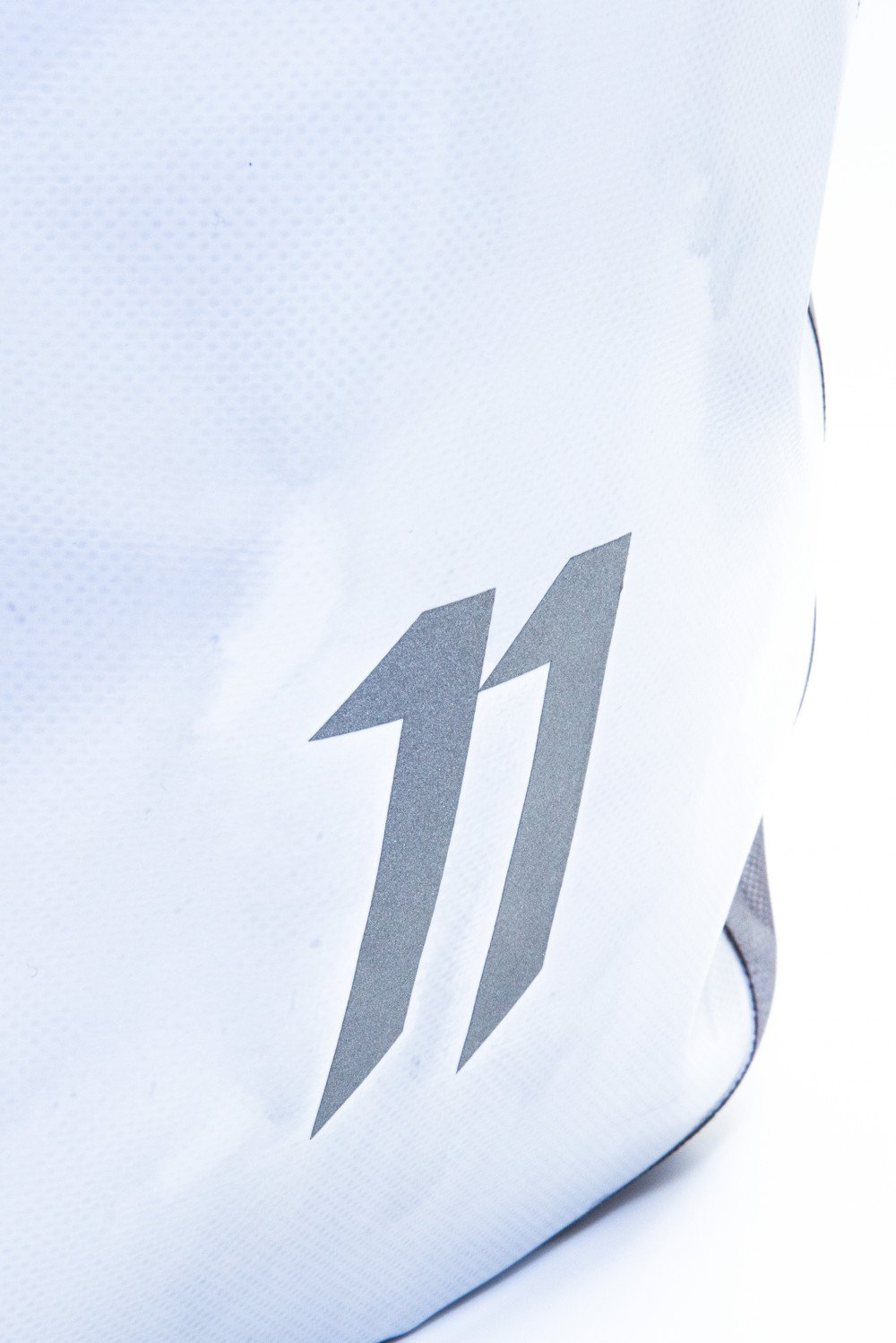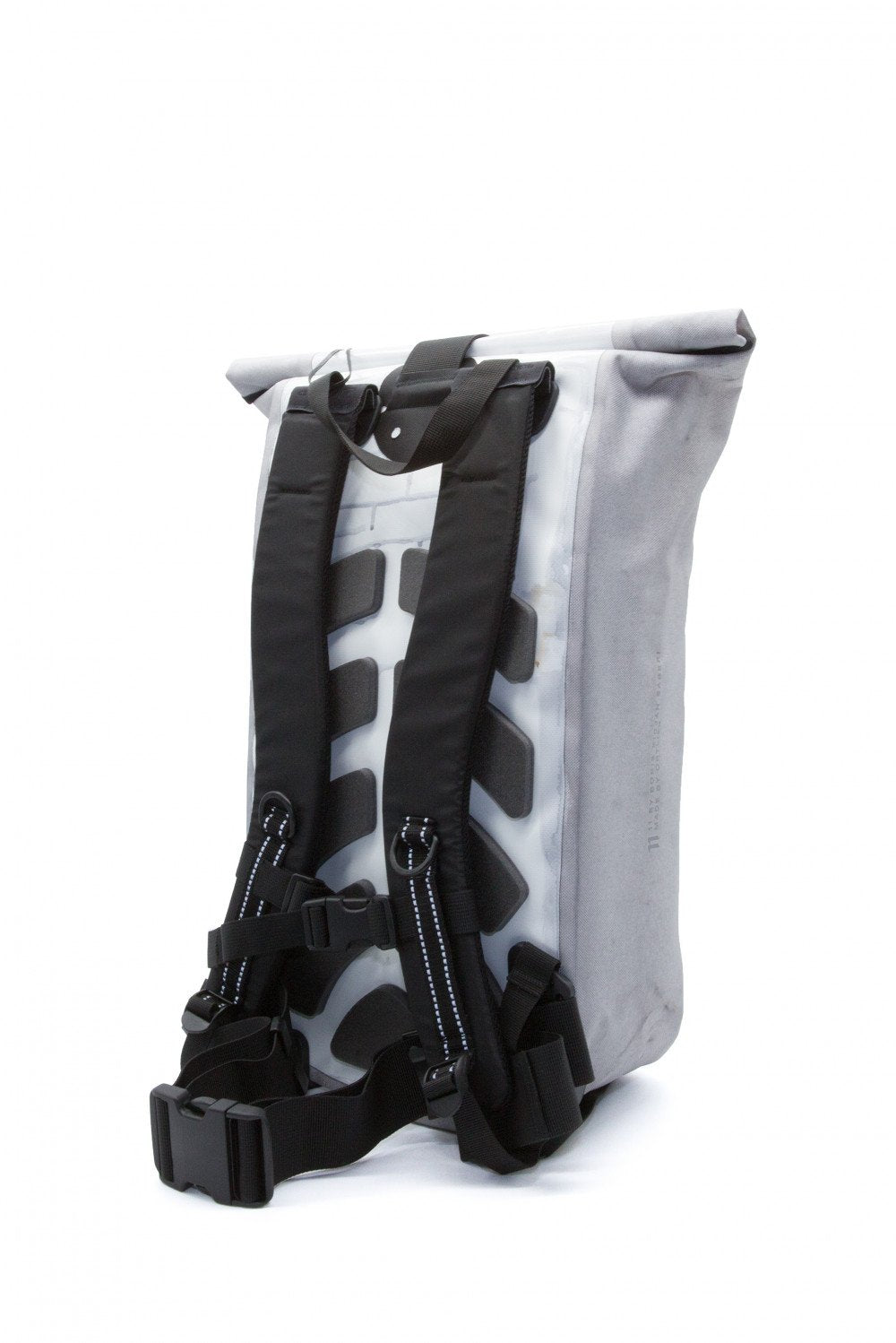 11 by Boris Bidjan Saberi Light Grey Ortlieb Velocity2 Backpack. Waterproof coated canvas backpack in tones of grey and black. Webbing carry handle at top. Adjustable padded shoulder straps featuring press-release webbing sternum strap. Webbing belt-style strap with press-release fastening. Tonal bonded panel and logo at face. Logo printed in grey at side. Tonal foam pads at back face. Watertight quick seal zip closure and Velcro fastening at foldover throat. Detachable padded zip pouch with press-stud fastening at interior. Black hardware.