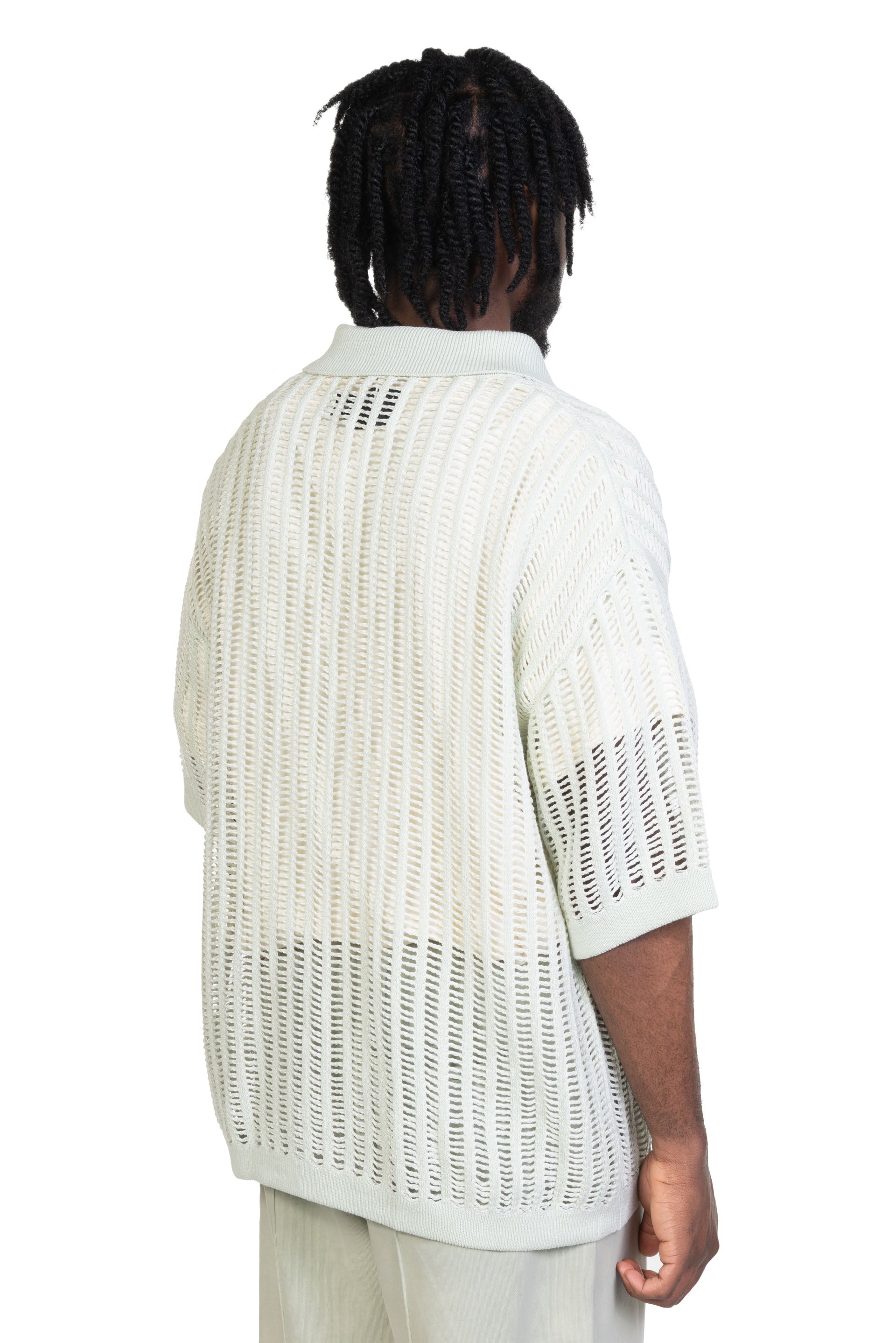 Feng Chen Wang Knitted polo is inspired by traditional Chinese Celadon. Button closure at neck. Short sleeves. Relaxed fit. Oversized.