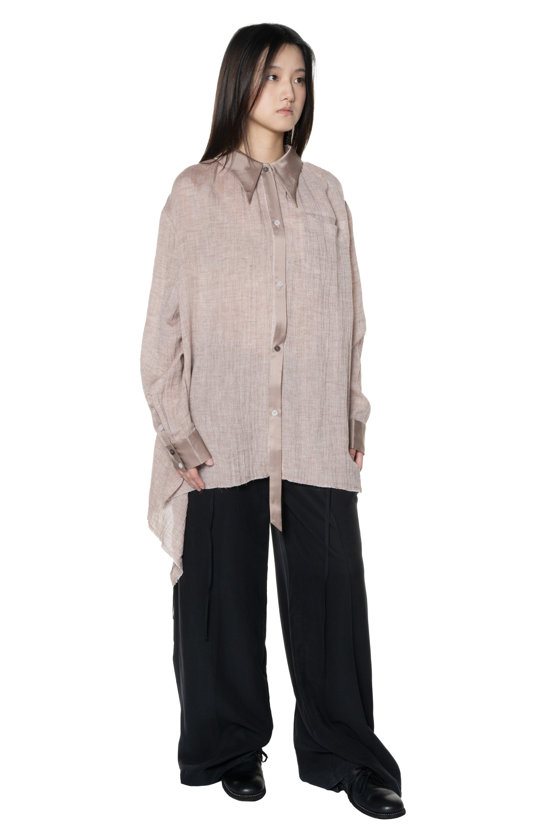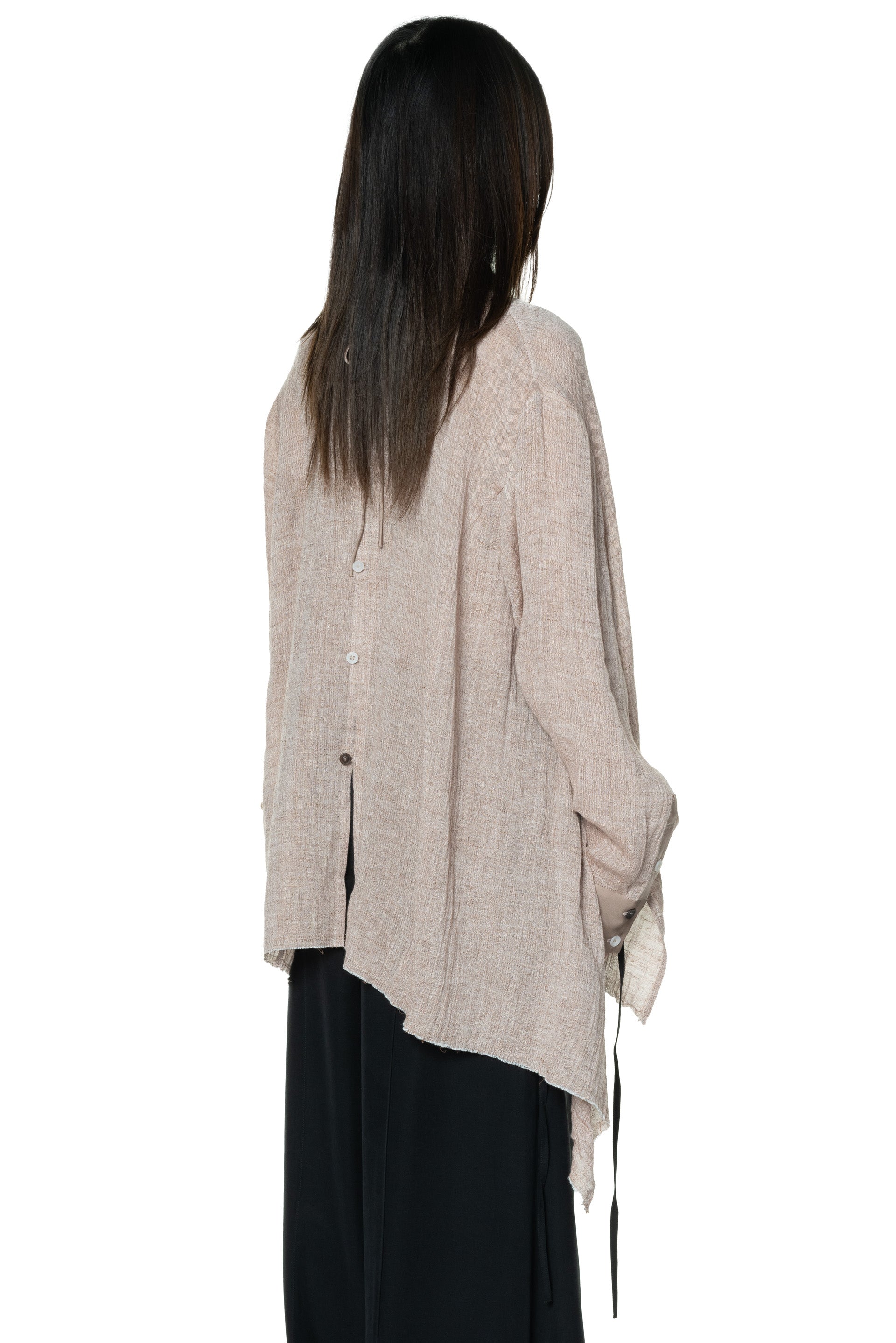Professor. E understands the time of aesthetics from the use of cotton, hemp and wool. Fabric stitching, patching, designs without edge trimming, deconstruction, and reproduction are all Professor. E's signature elements creating classic immortal designs that can be viewed with the Oversized Button Back Shirt.