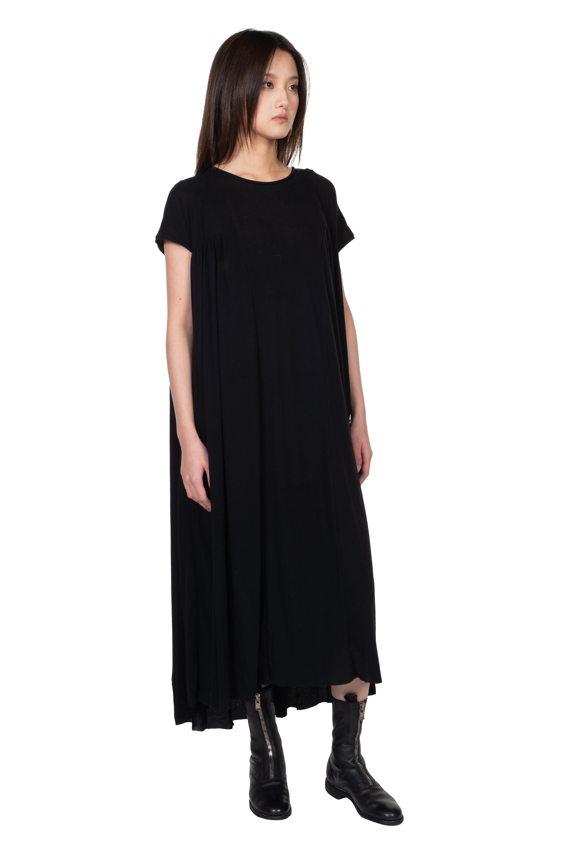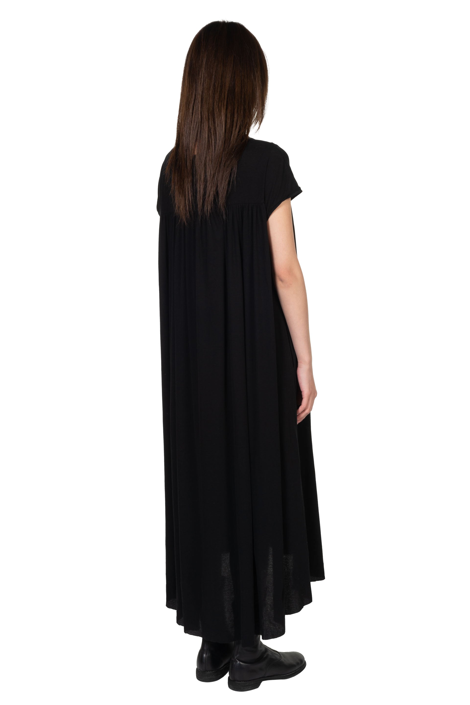 A Tentative Atelier aims to explore artistic handicraft elements and innovative forms and silhouettes on garments combining with neo-vintage effect. The label does not only focus on fashion, it is a platform to encourage and sustain the spirit and tradition in craftsmanship to create new form as seen with the Oversized Drapey Gathers Jersey Dress.