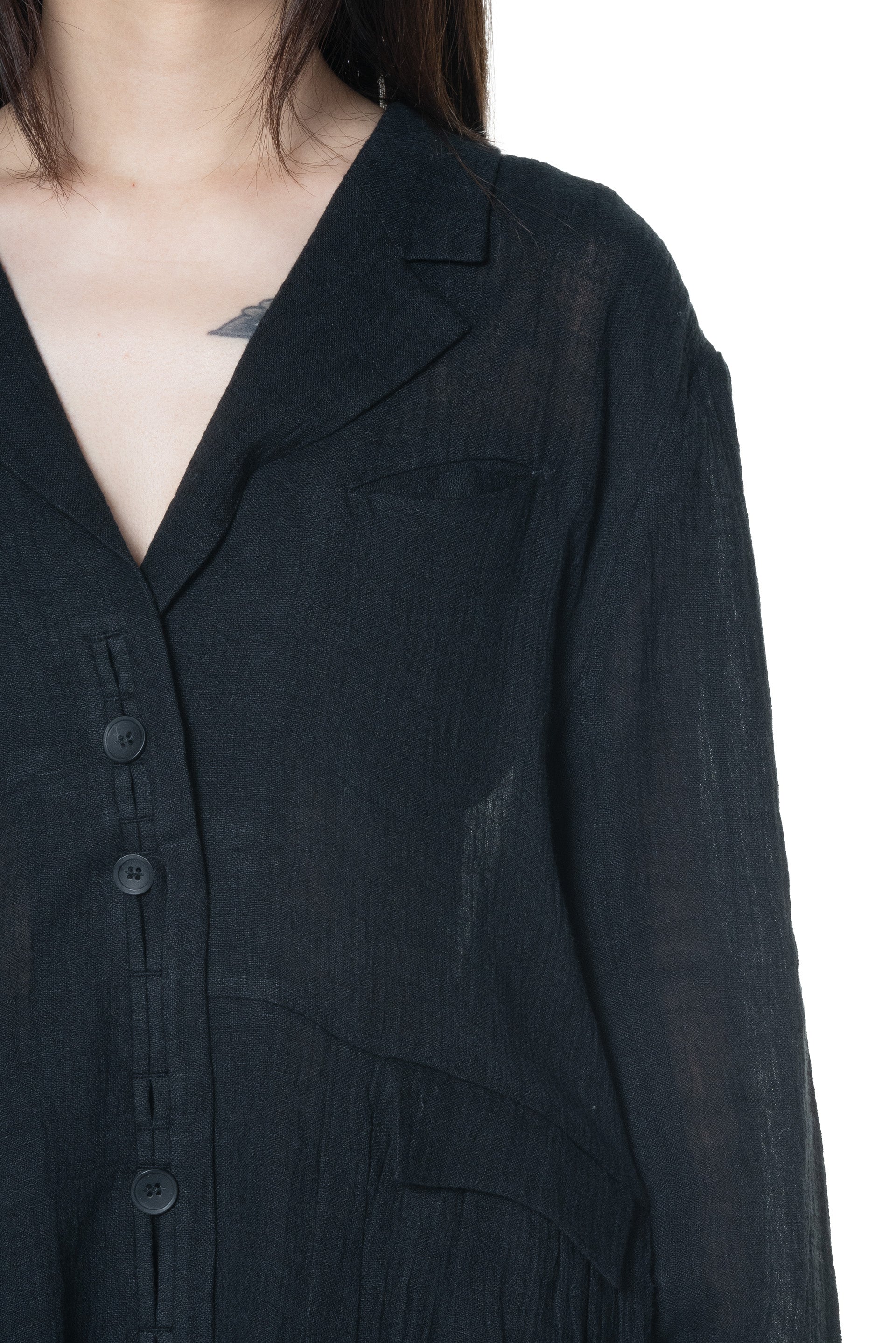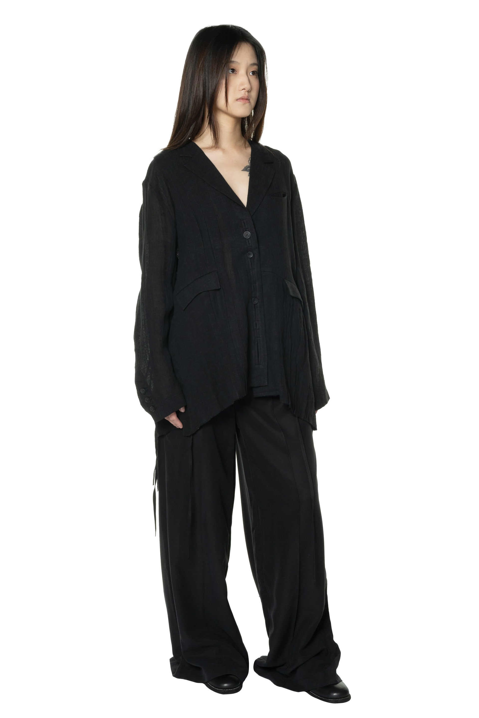 Professor. E understands the time of aesthetics from the use of cotton, hemp and wool. Fabric stitching, patching, designs without edge trimming, deconstruction, and reproduction are all Professor. E's signature elements creating classic immortal designs that can be viewed with the Oversized Pleated Blazer.