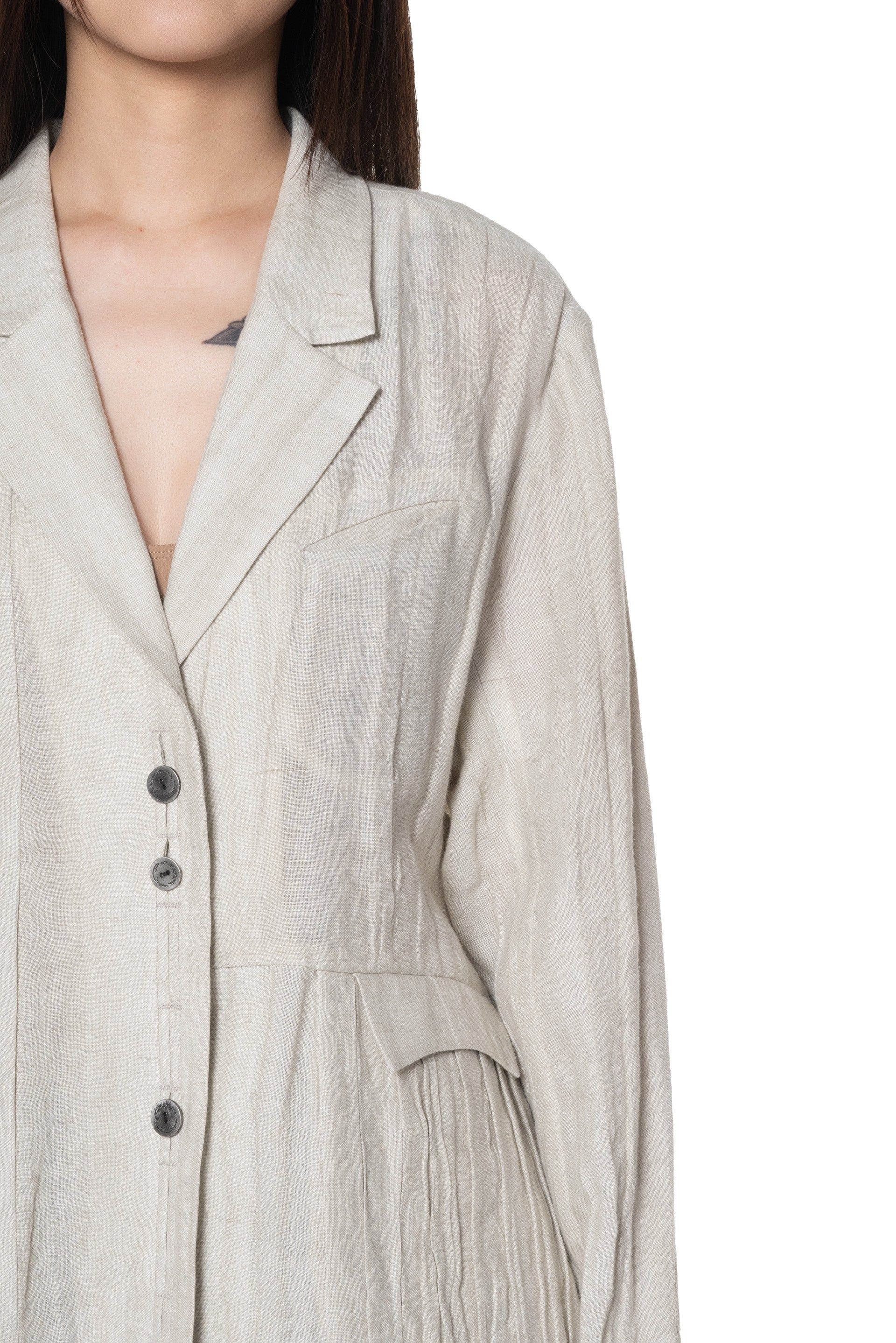 Professor. E Oversized Pleated Blazer Natural Dyed Beige. Forgotten Material blazer. Long sleeves. Button closure at front. Button at cuffs. Pleats throughout. Drawstring closure at side. Two pockets at side. Lined. Oversized fit. One size.