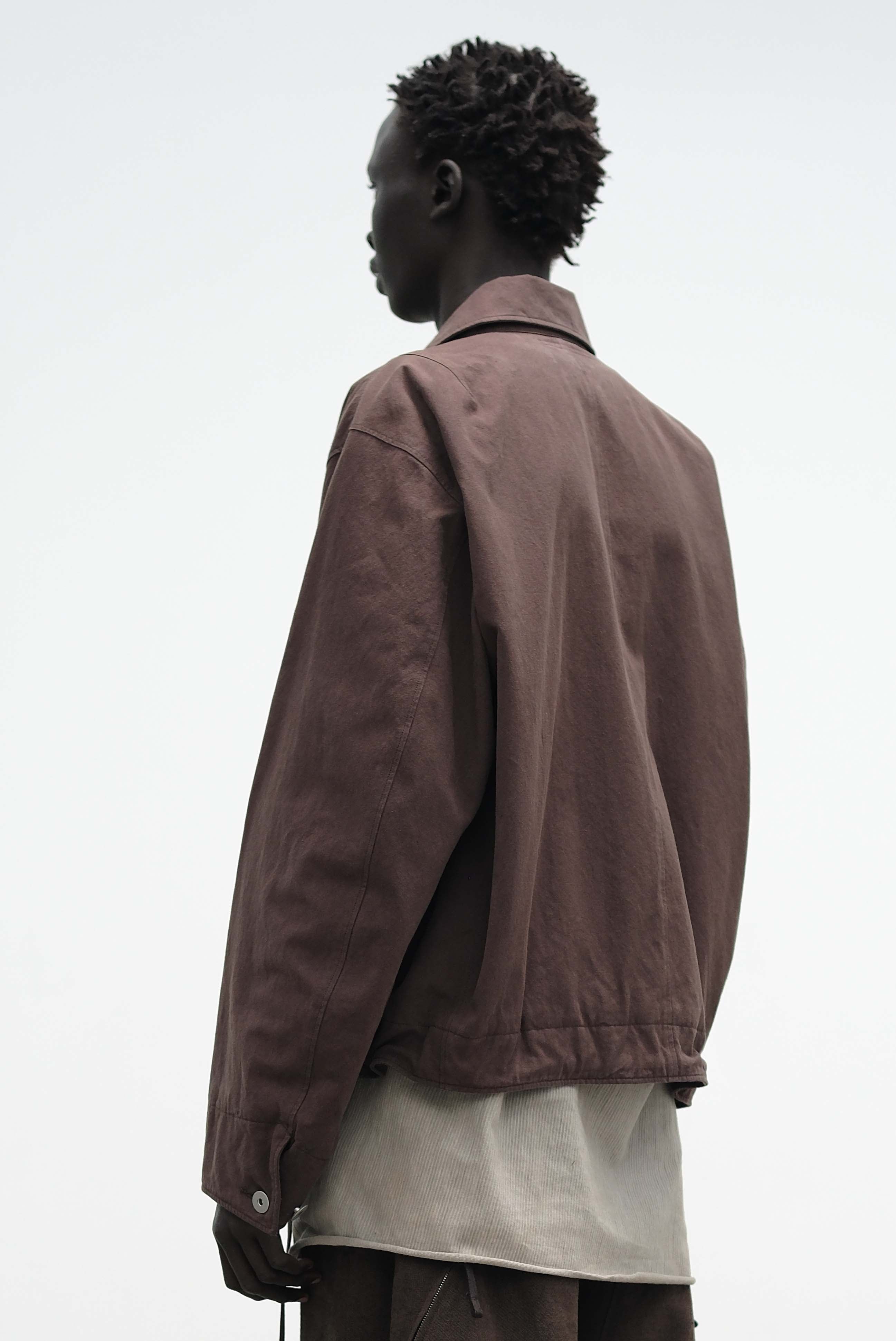 Attempt Knight Jacket Dark Brown. Cotton Coach jacket. Padded. Long sleeves. Regular collar. Two side pocket. Elasticated details at bottom. Double zip closure with long puller detail. Drawstring details at bottom. Soft textural cotton fabric.