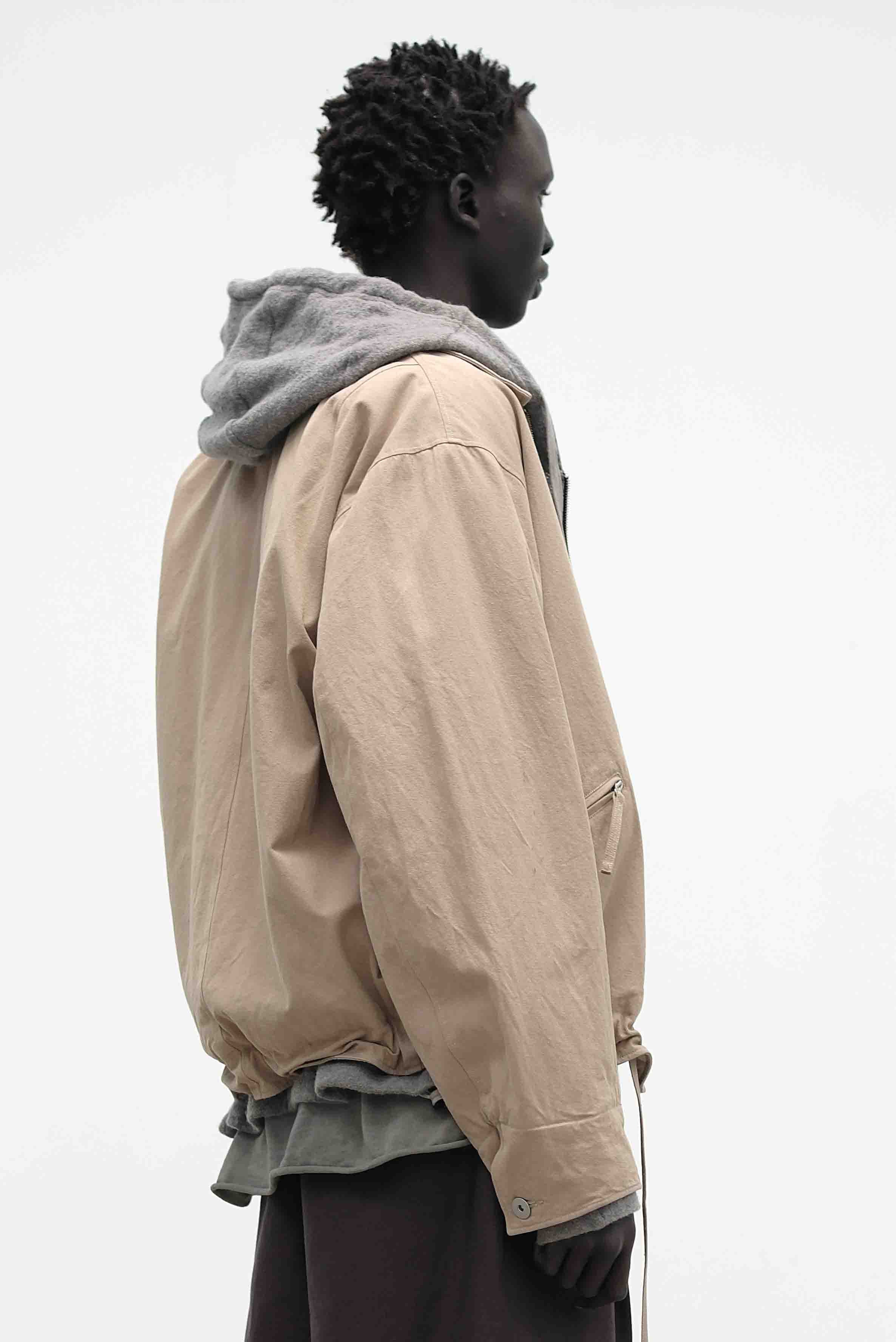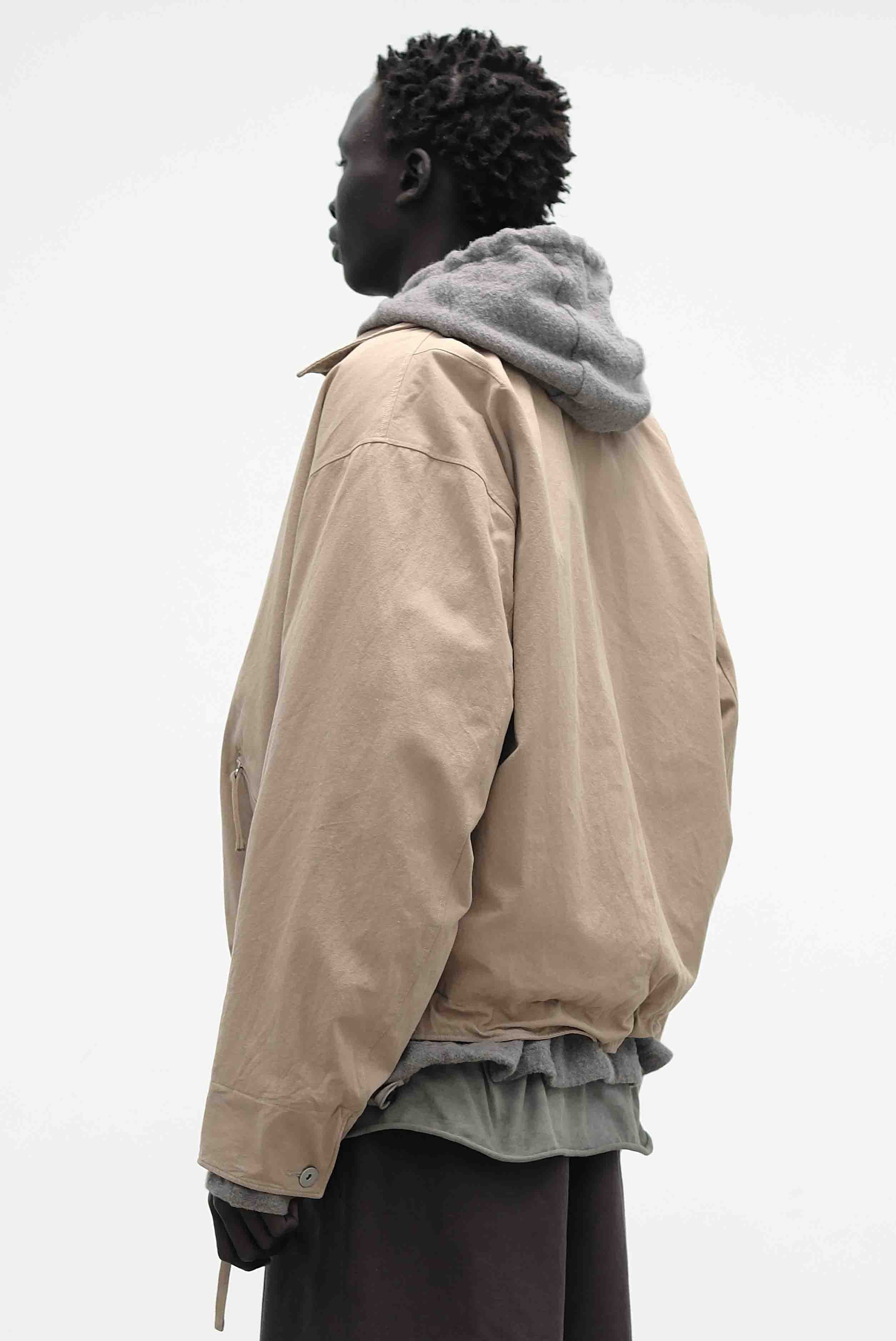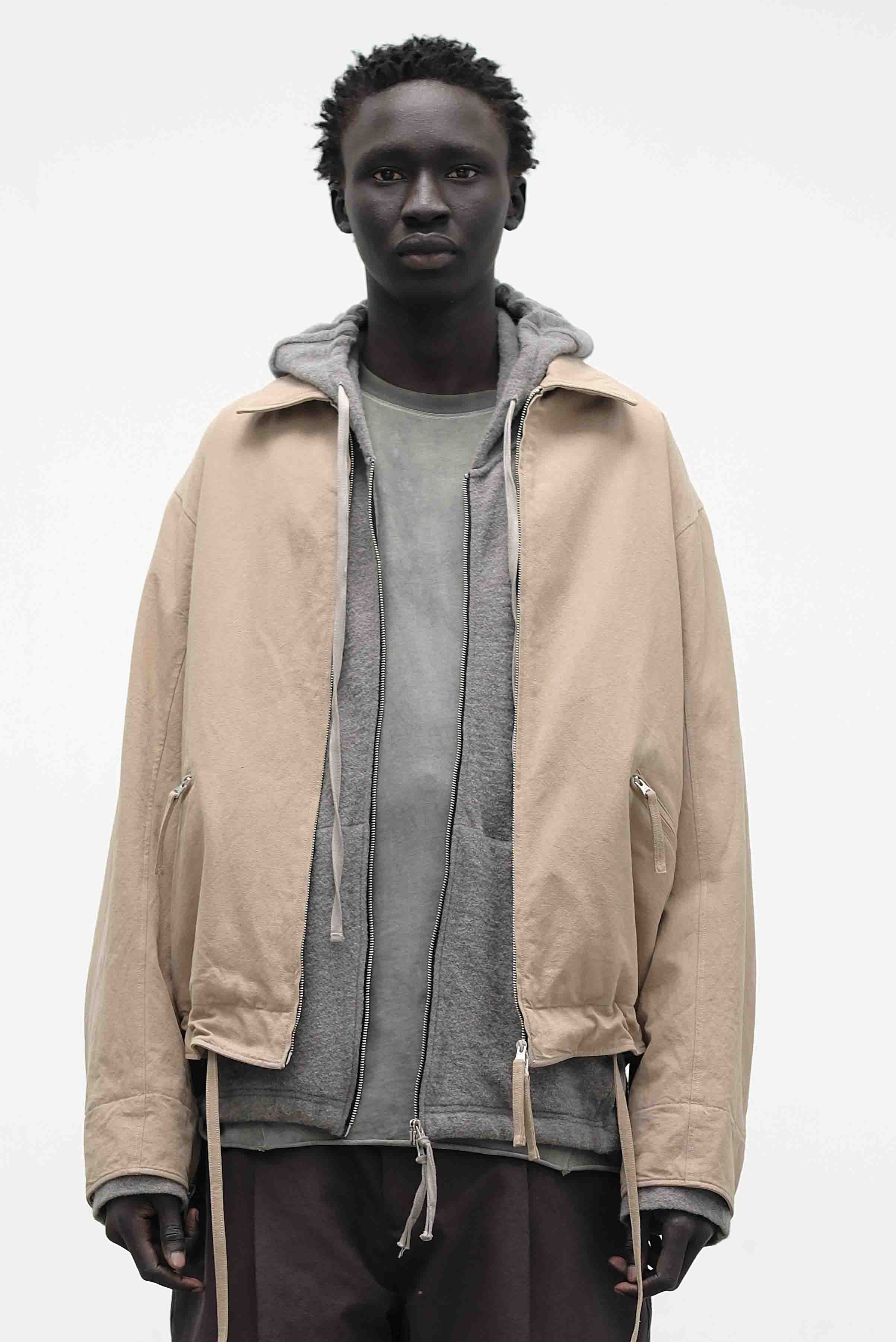 Attempt Padded Work Jacket Khaki. Cotton coach jacket. Padded. Long sleeves. Regular collar. Two side pocket. Elasticated details at bottom. Double zip closure with long puller detail. Drawstrings detail at bottom. Soft textural cotton fabric.