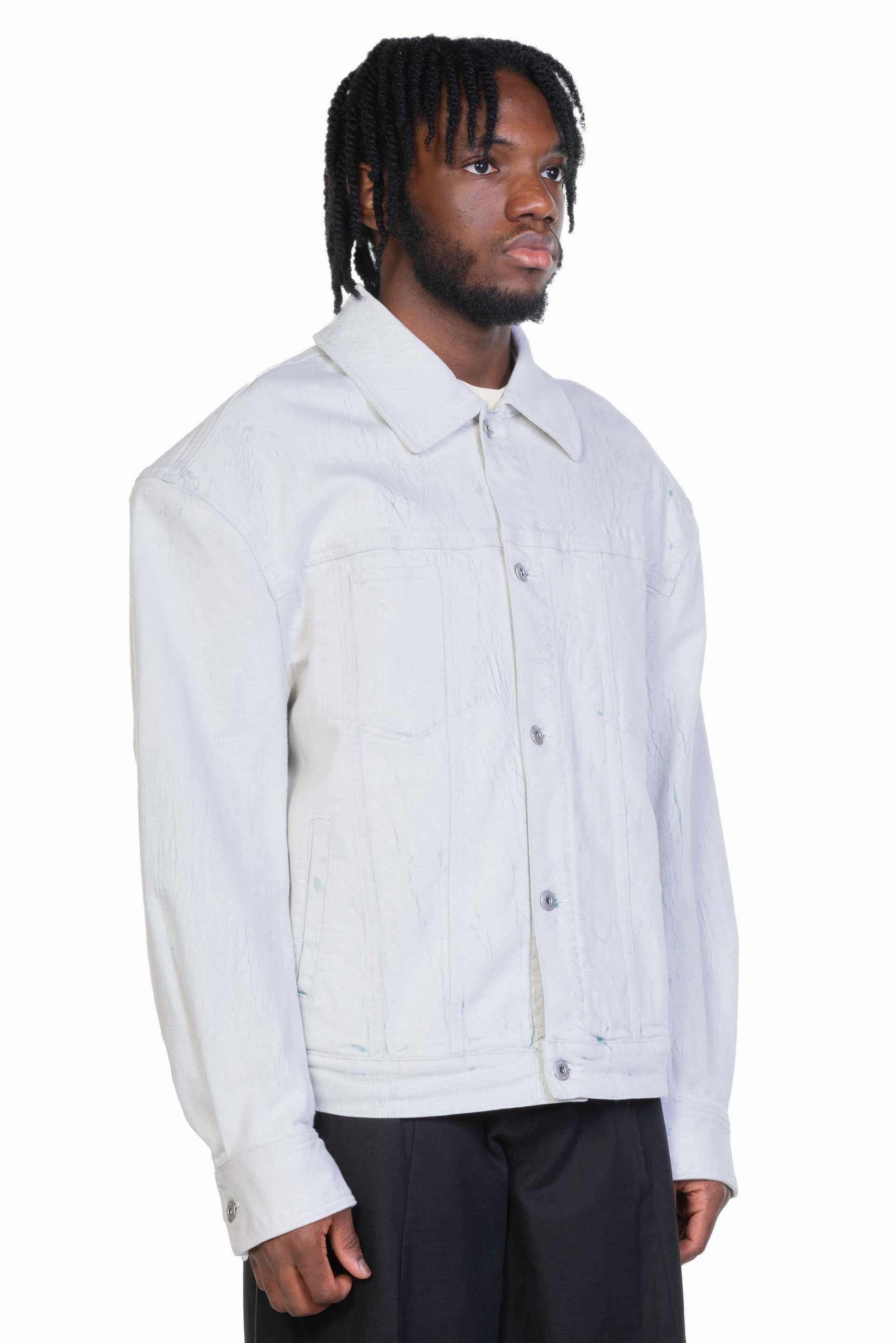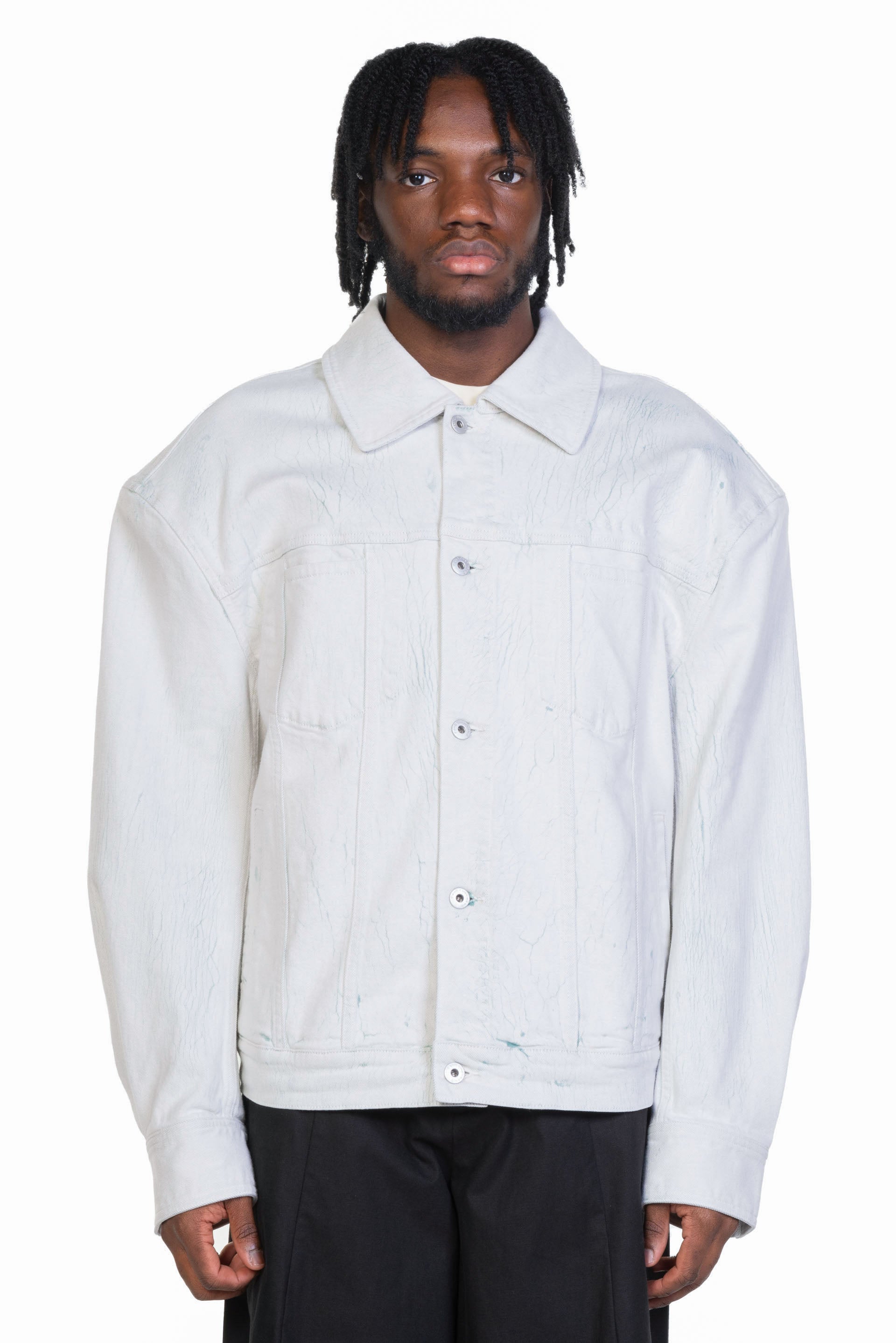 Feng Chen Wang Oversized denim Jacket. Long sleeves. Button closure at front. Painted details throughout. Oversized fit. Padded shoulders. Two side pockets. Two front pockets.
