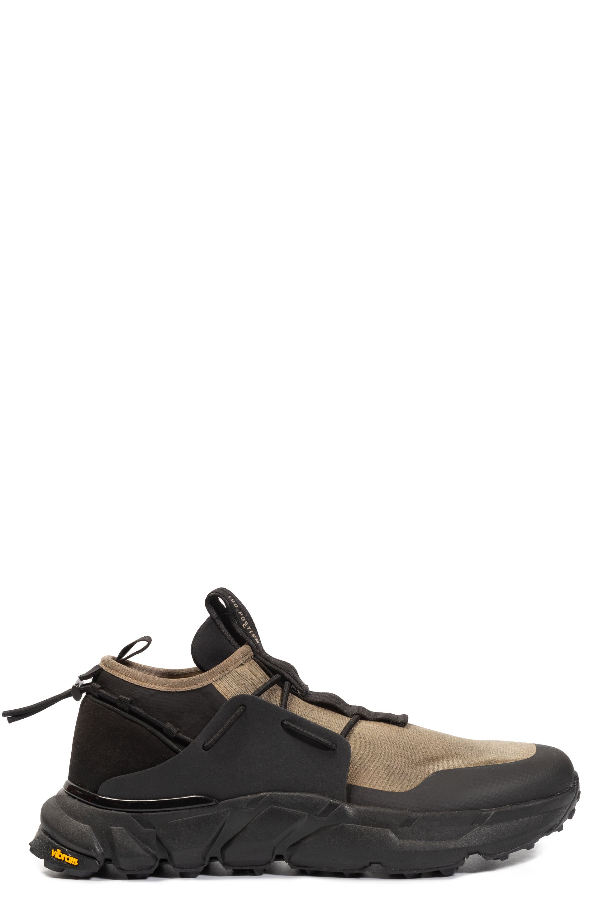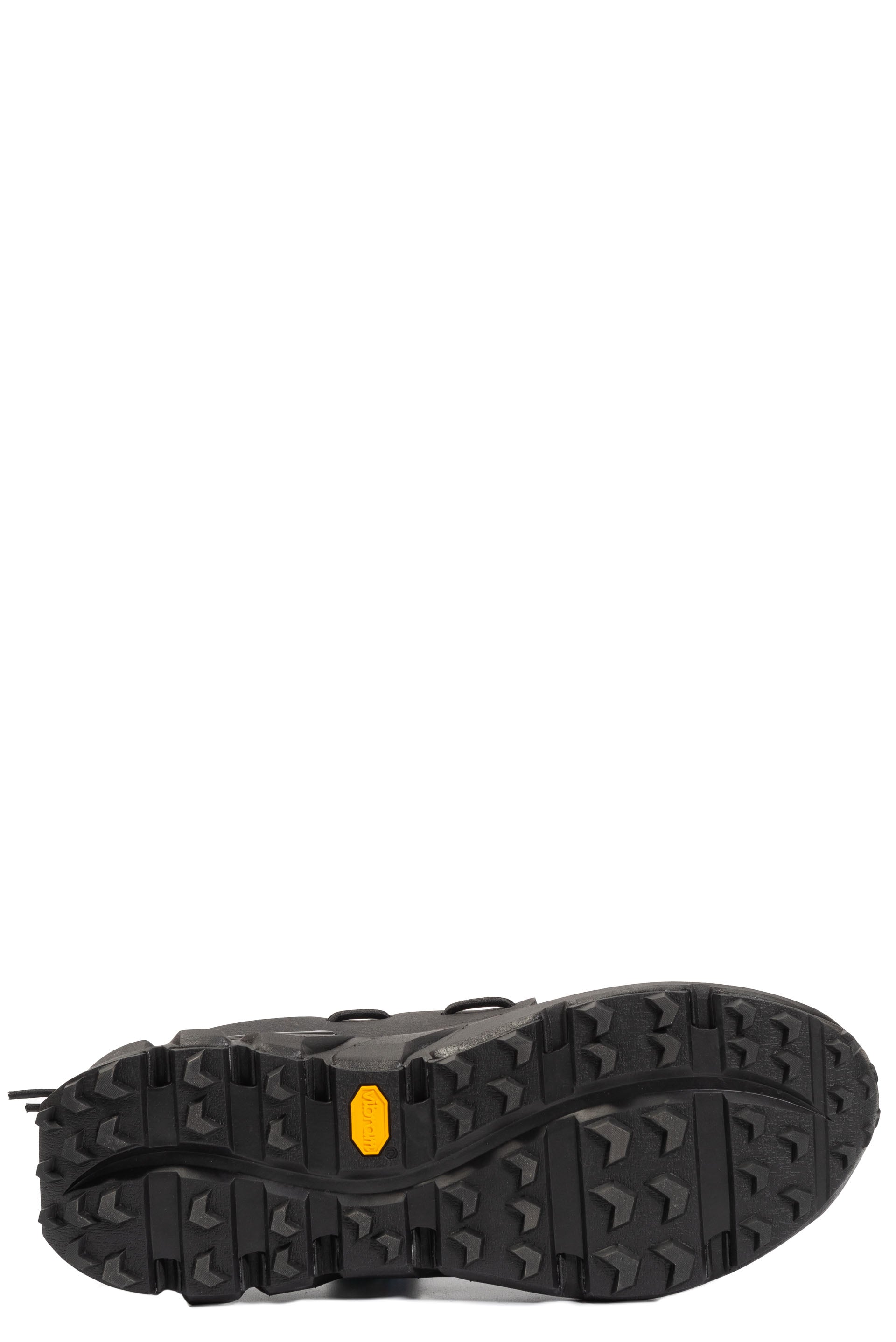 Lightweight. Breathable knit mesh. Black leather panels. Hefty Vibram sole units. Slim laces that weave across the upper. Waterproof PU coating that shields the shoe’s front.