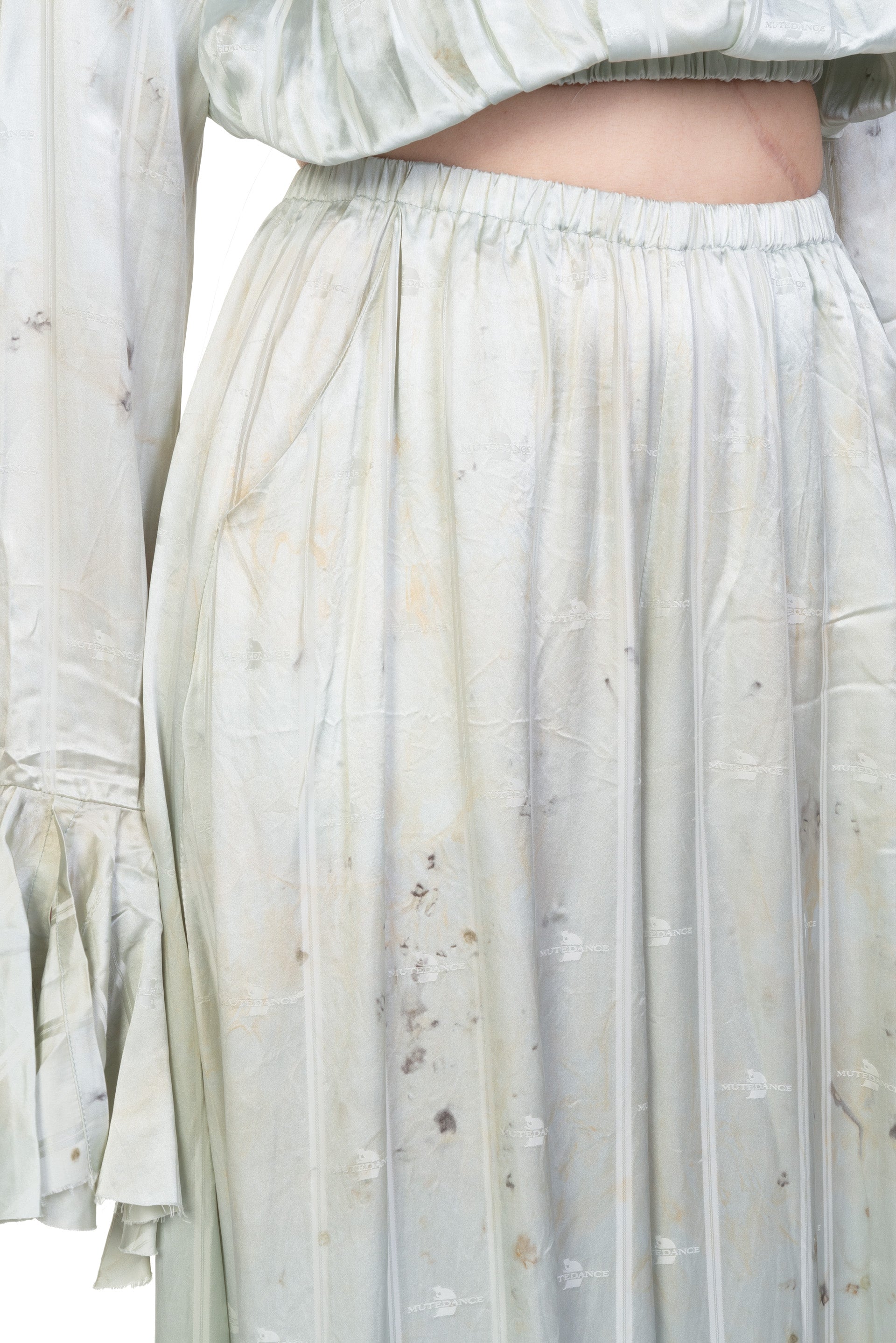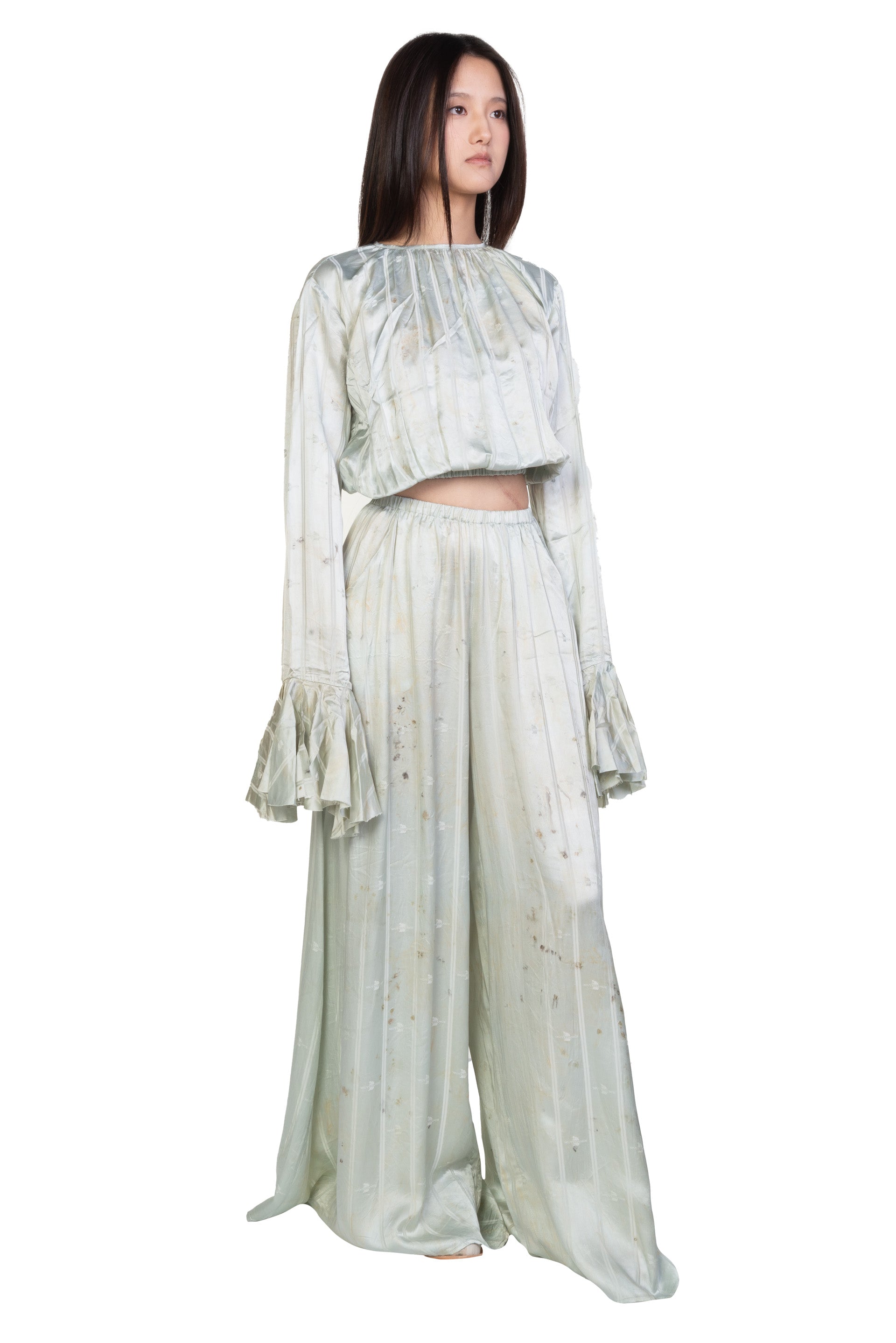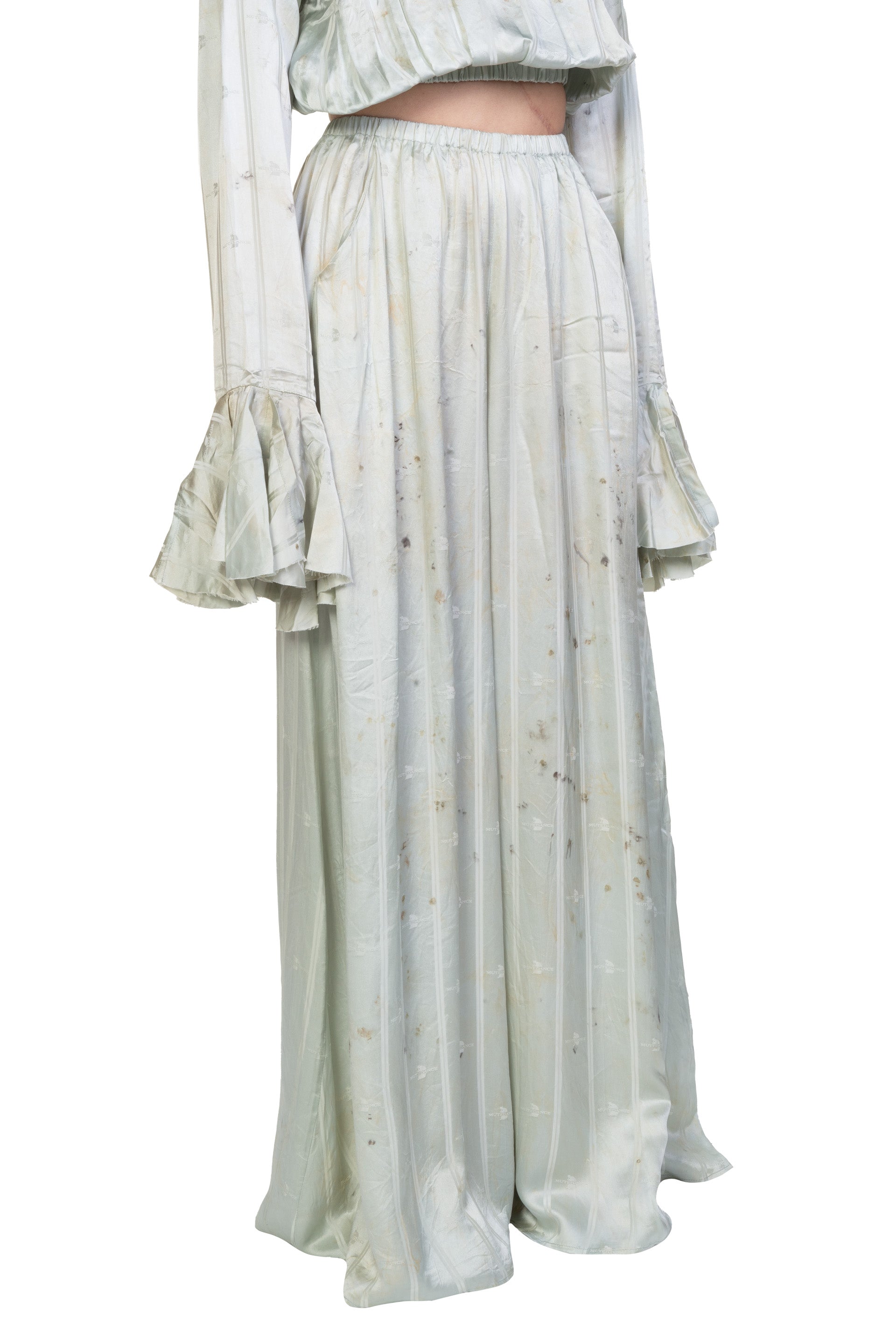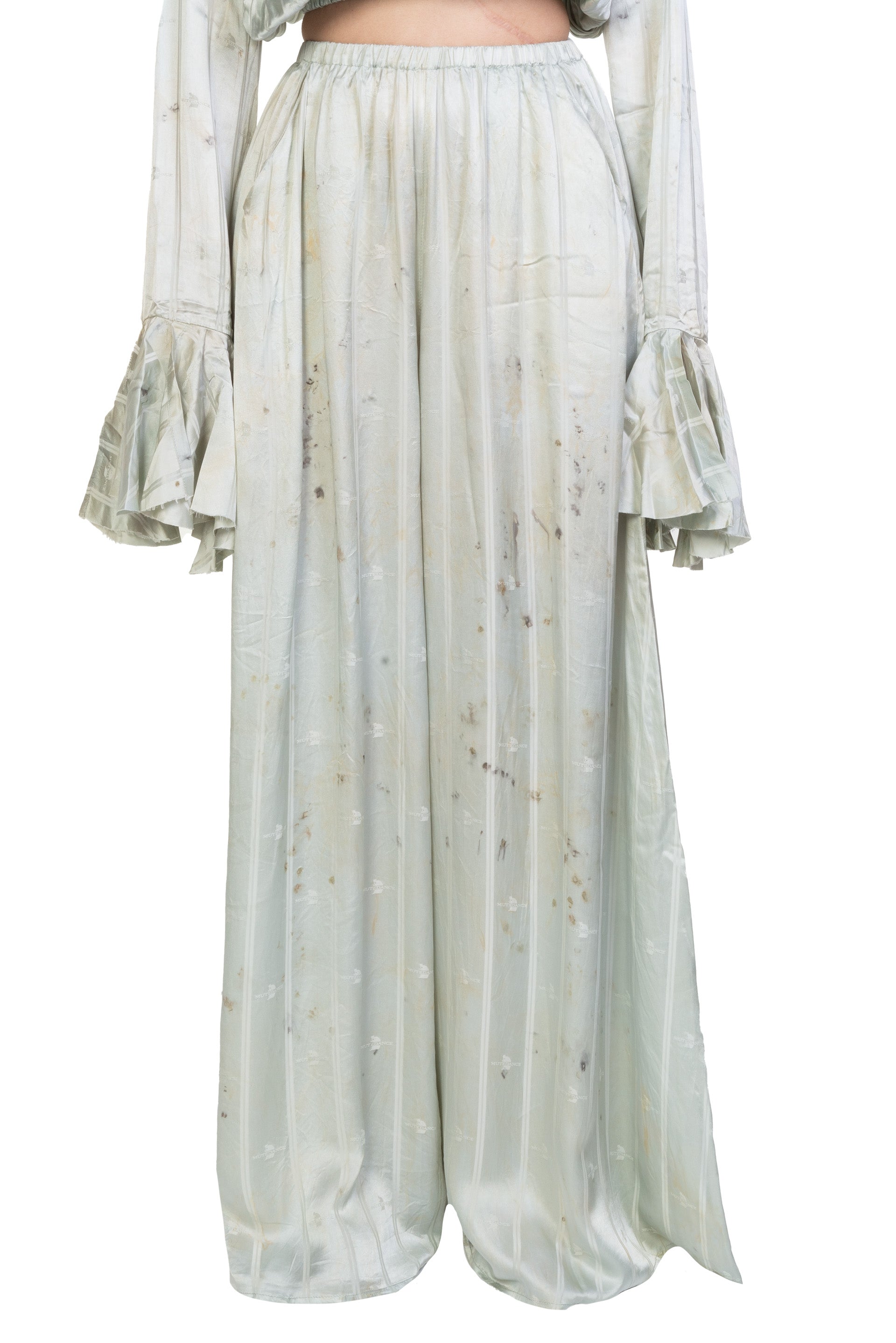 Yu Qun believes that everyone's character is multi-faceted and expressing spiritual independence. Fine hand-stitched threads, old mottled colours and patterns, and unconventional cuts are what Mute Dance has been exploring. The leaves and stems of fresh plants and berries, dried medicinal materials, old metals and so on are combined with the ancient and traditional dyeing technology to dye fabrics and paper as seen with the Pale Blue Stripe Dyed Trousers.
