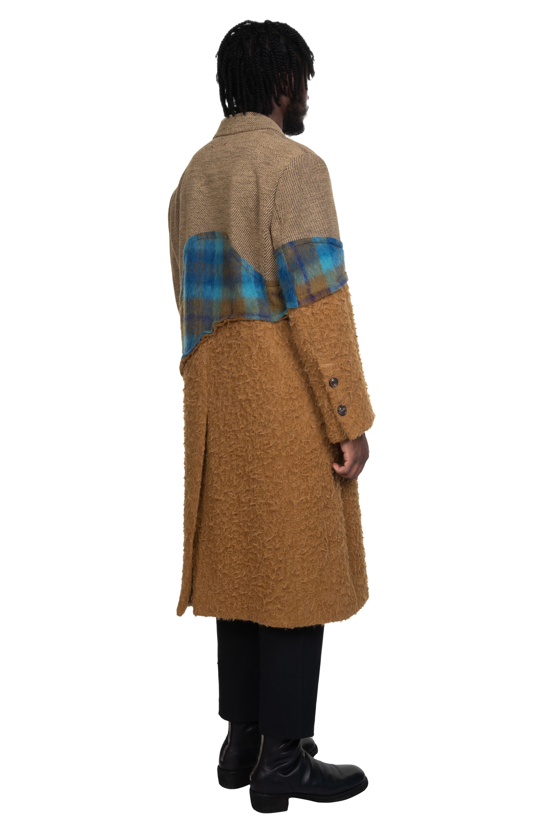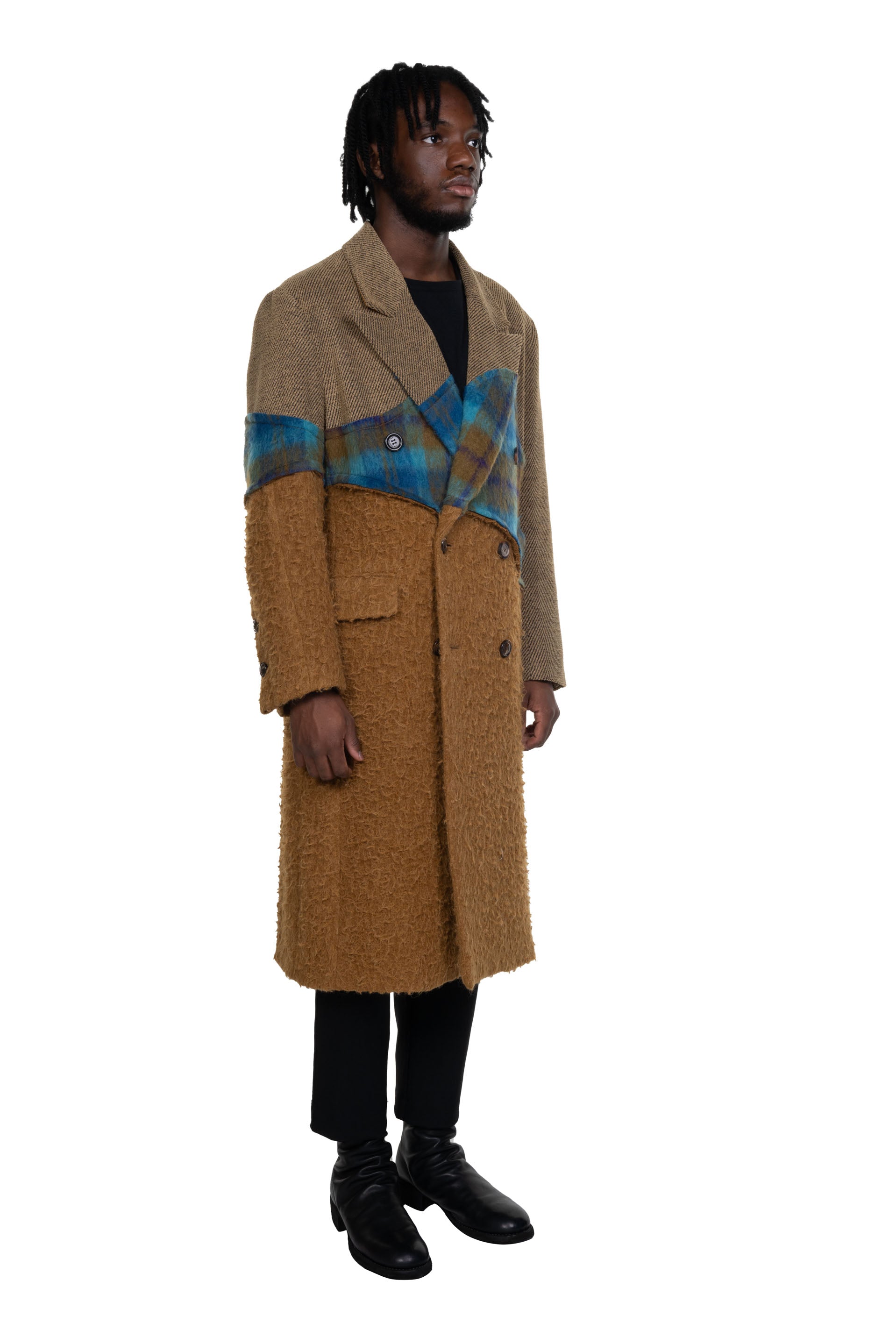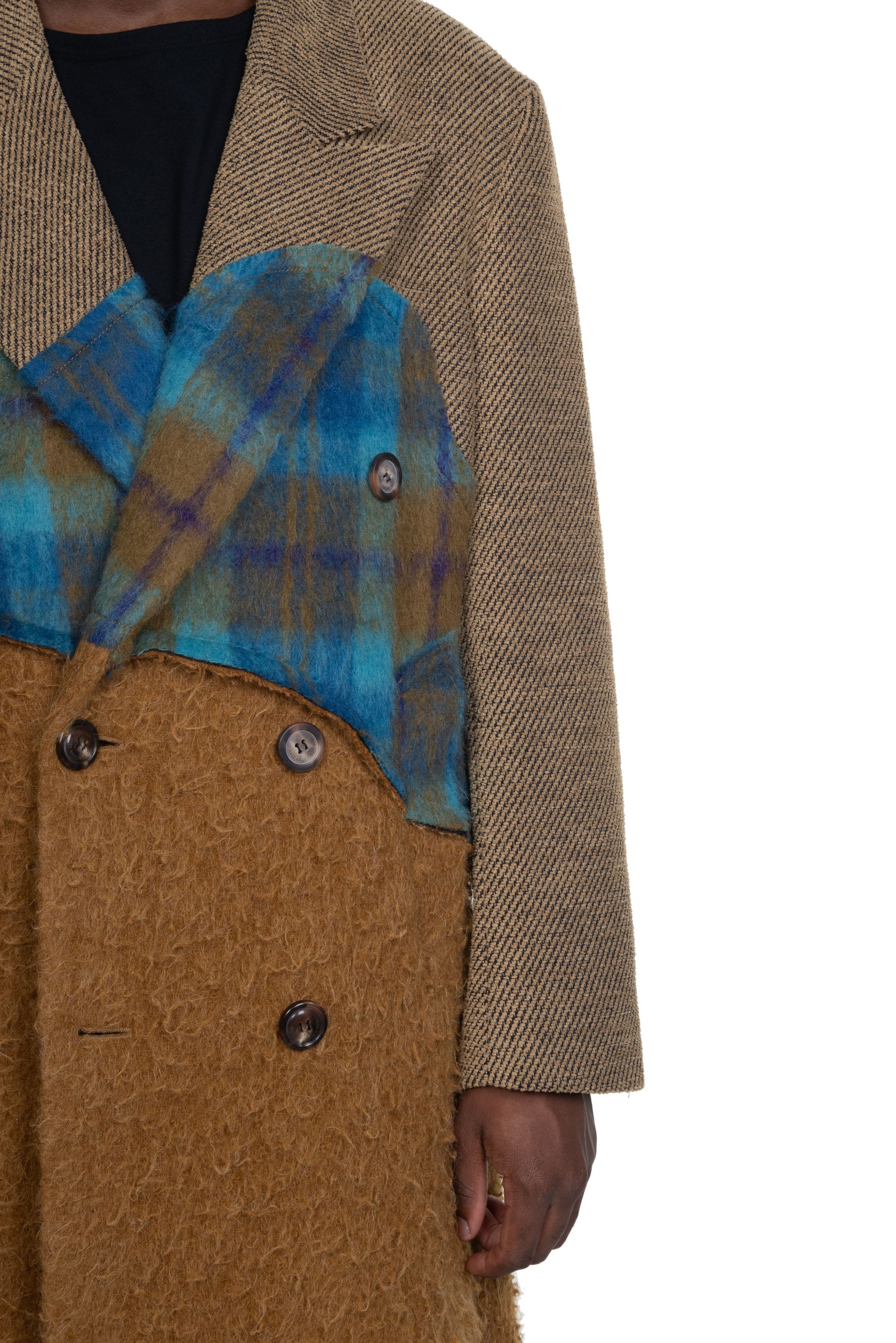 Long sleeves. Double Breasted. Button closure at front. Two side pockets. Inside pocket. Button at cuffs. Multi fabric patchwork throughout. Slightly padded shoulders. Signature details throughout. Regular fit. Lightweight.