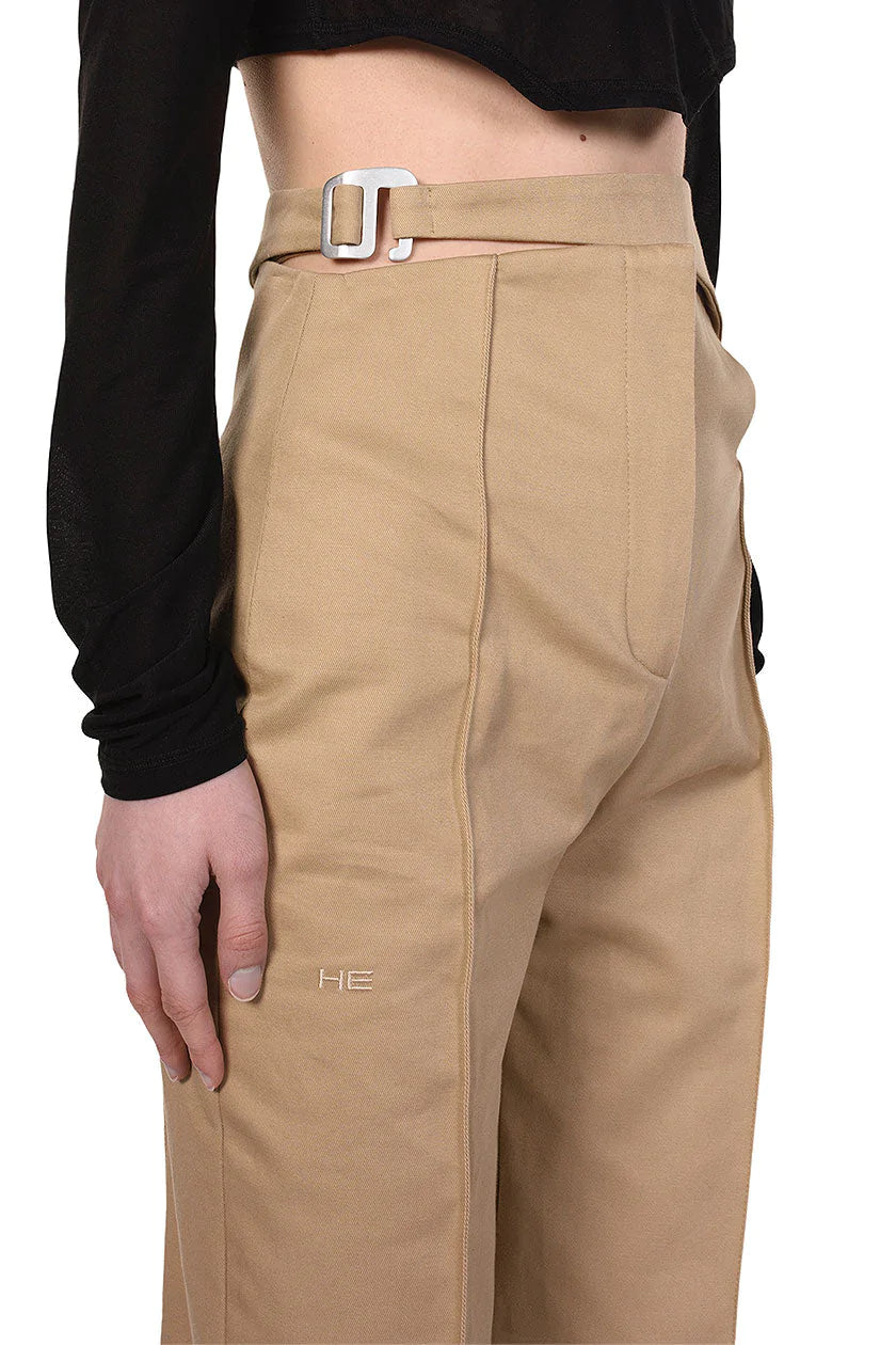 Twill cotton fabric. Fabric made in Japan. Shaped seam details. Zip closure. HE embroidery detail on leg. Metal signature belt detail at waist. HE™ metal press button closure