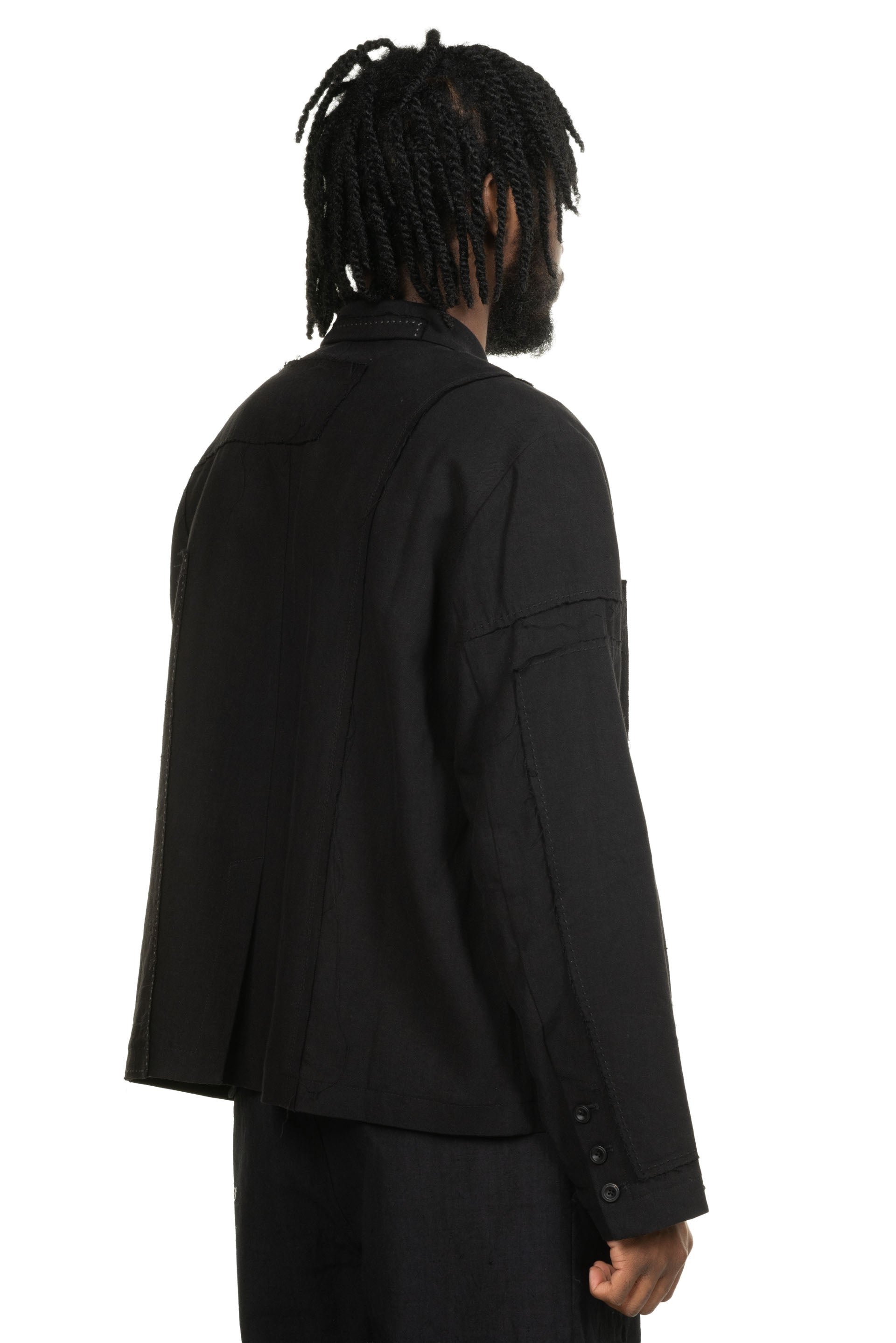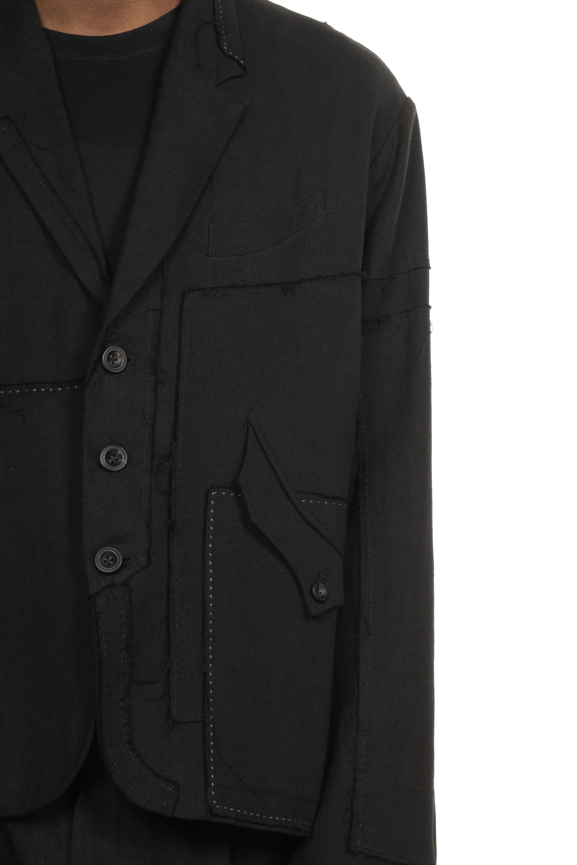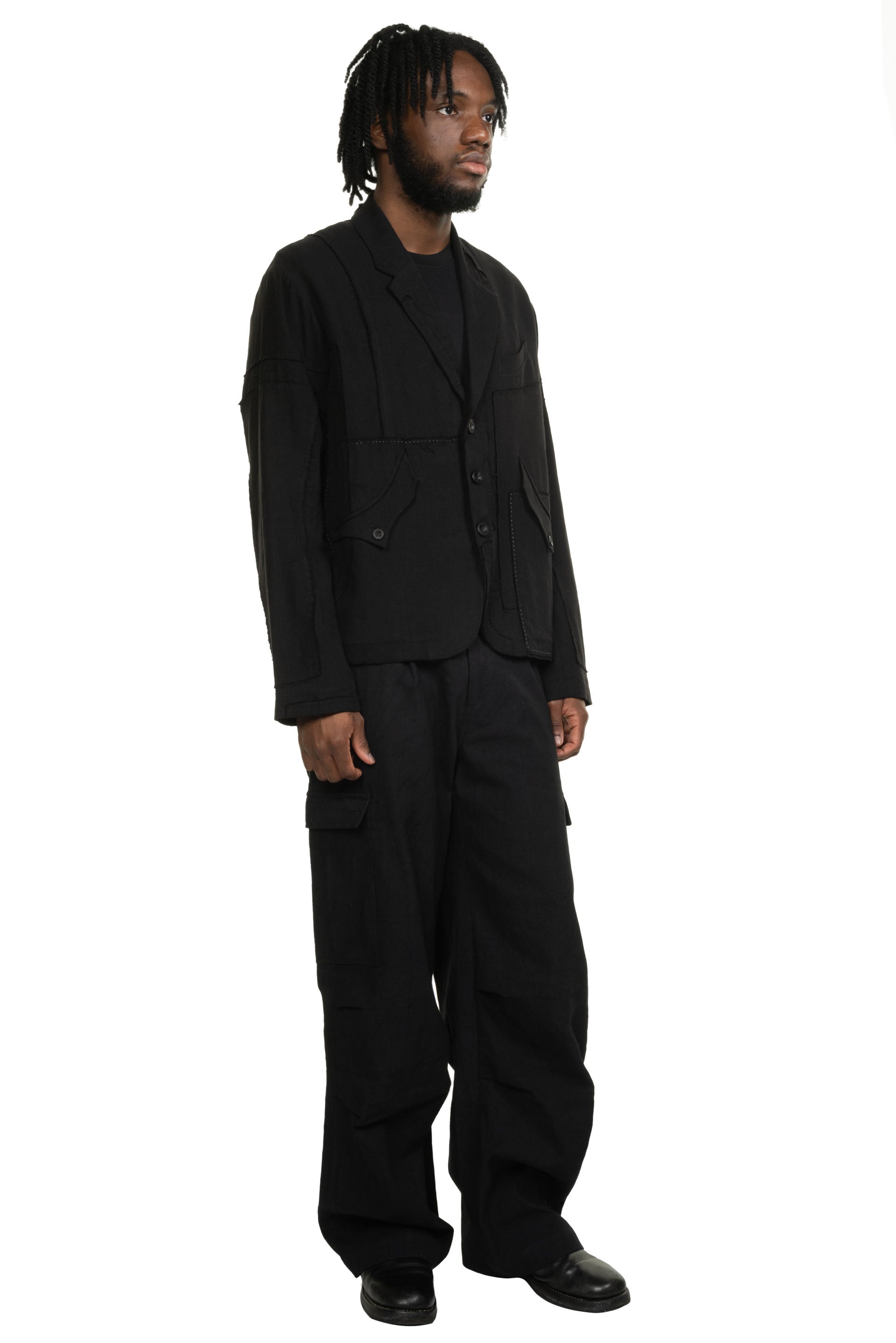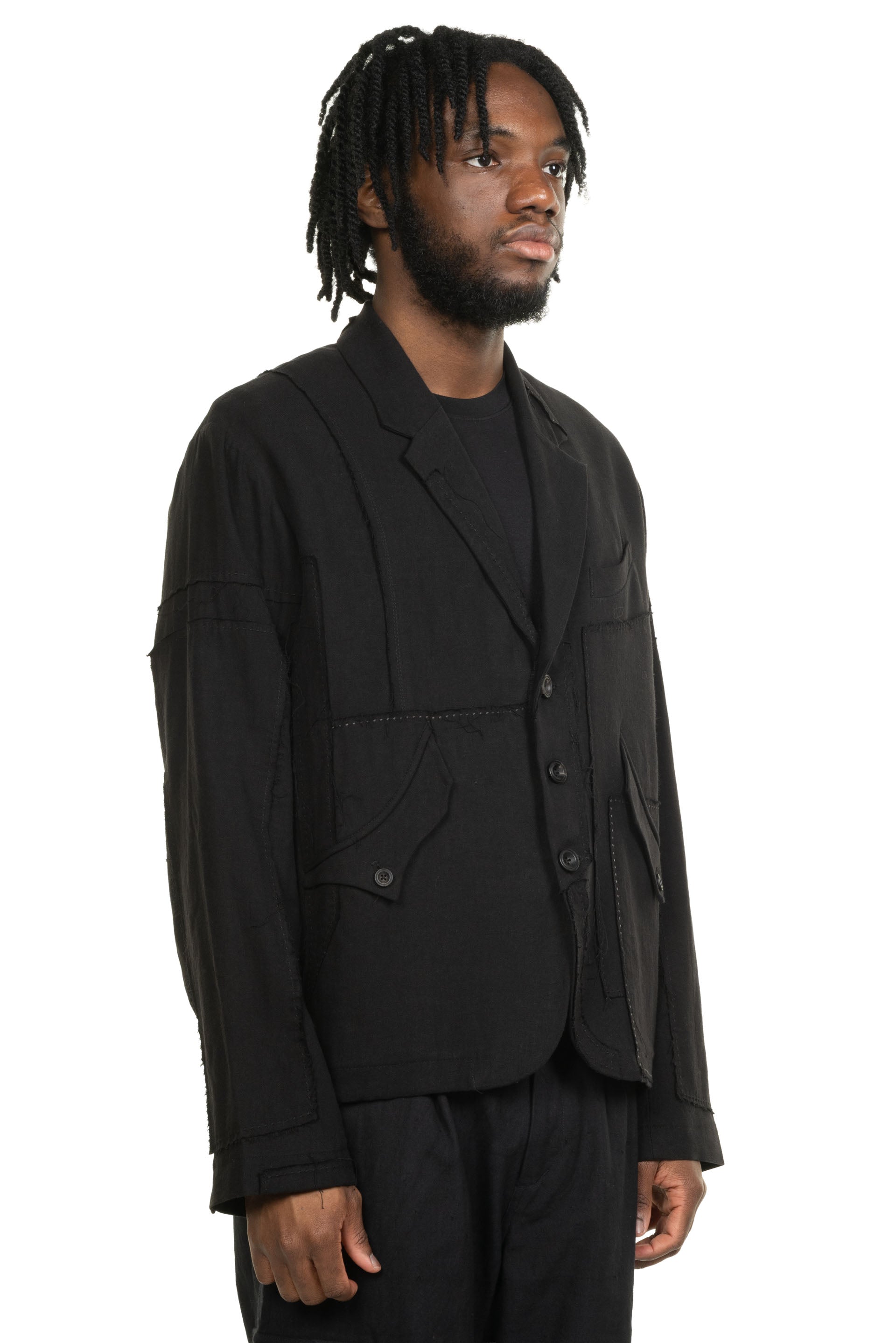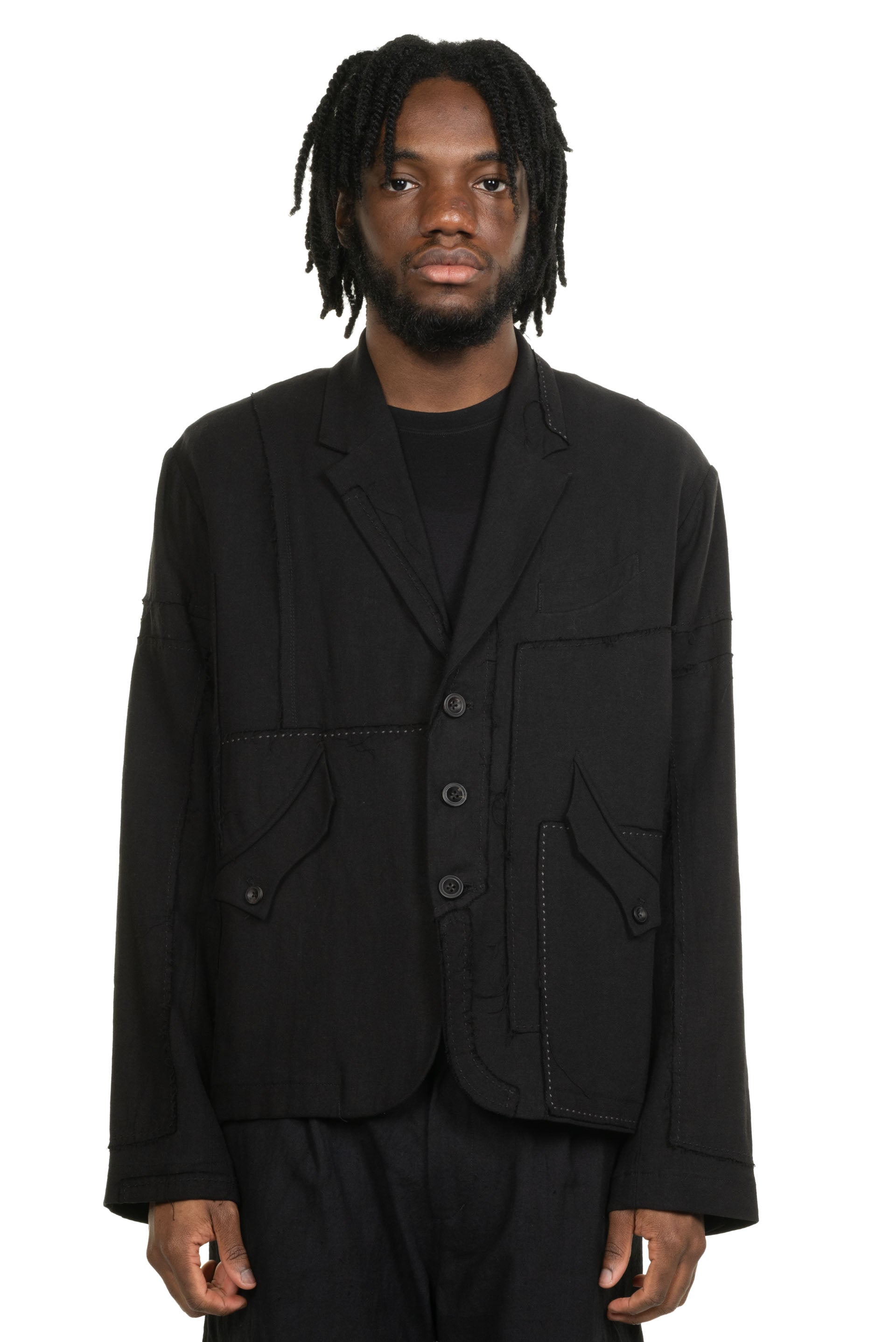 Professor. E understands the time of aesthetics from the use of cotton, hemp and wool. Fabric stitching, patching, designs without edge trimming, deconstruction, and reproduction are all Professor. E's signature elements creating classic immortal designs that can be viewed with the Patchwork Blazer Black