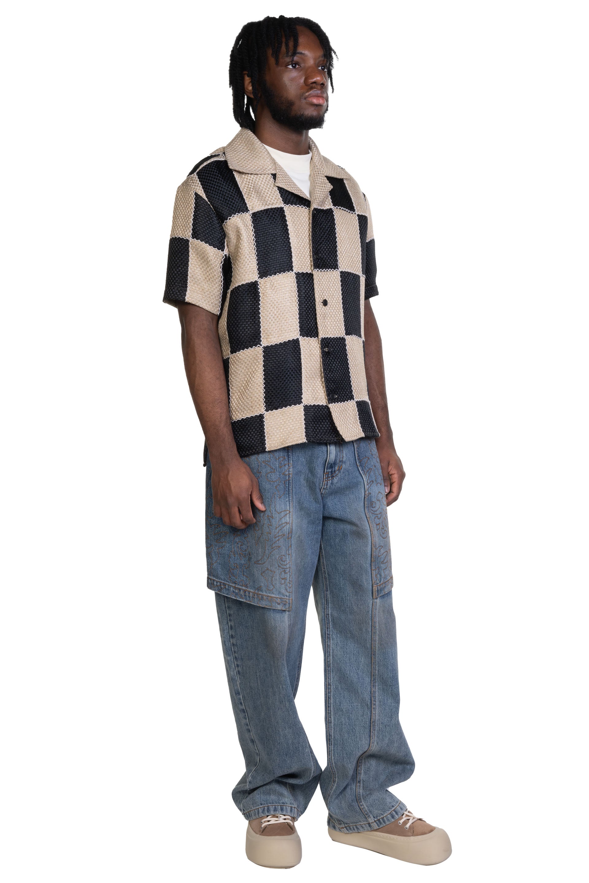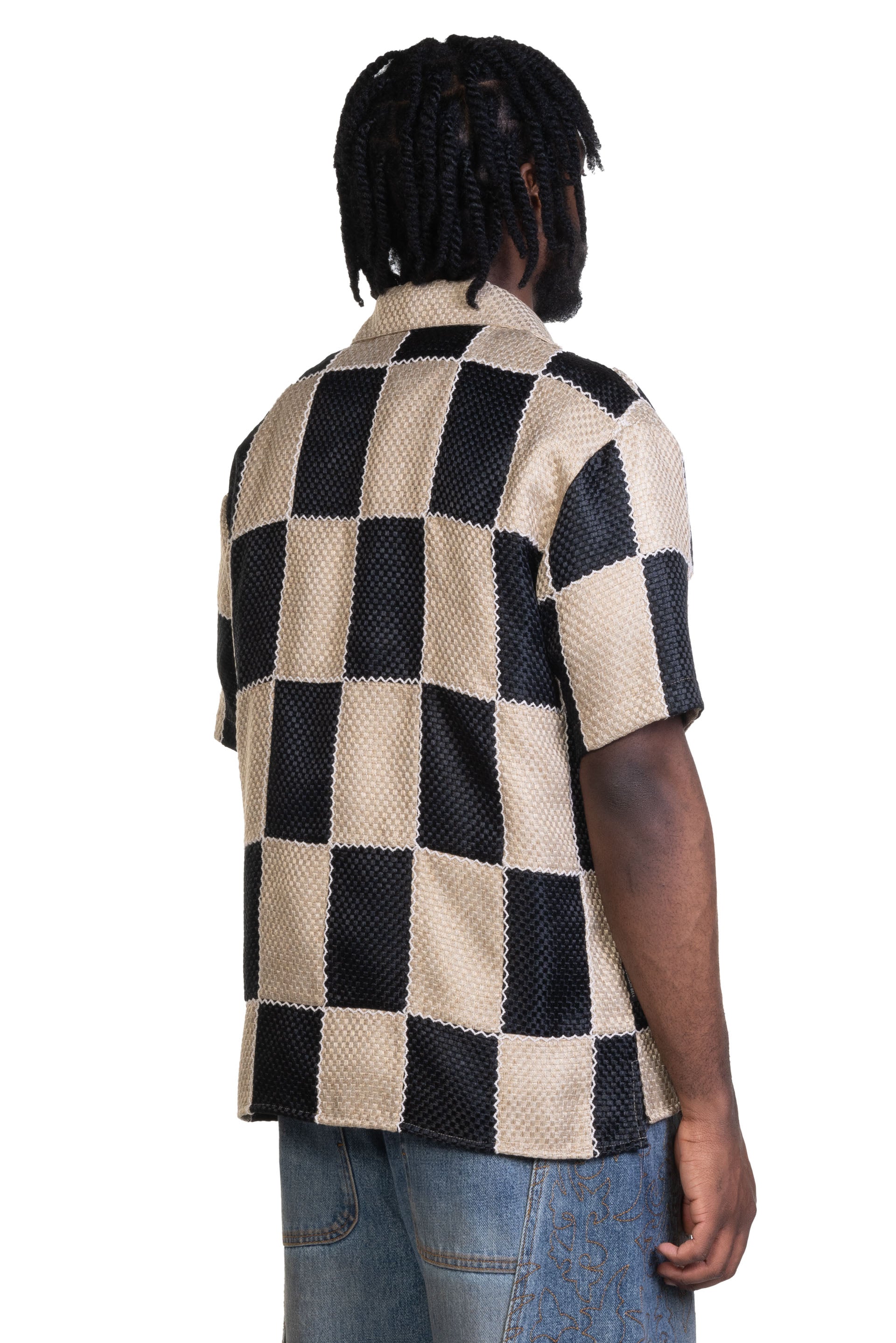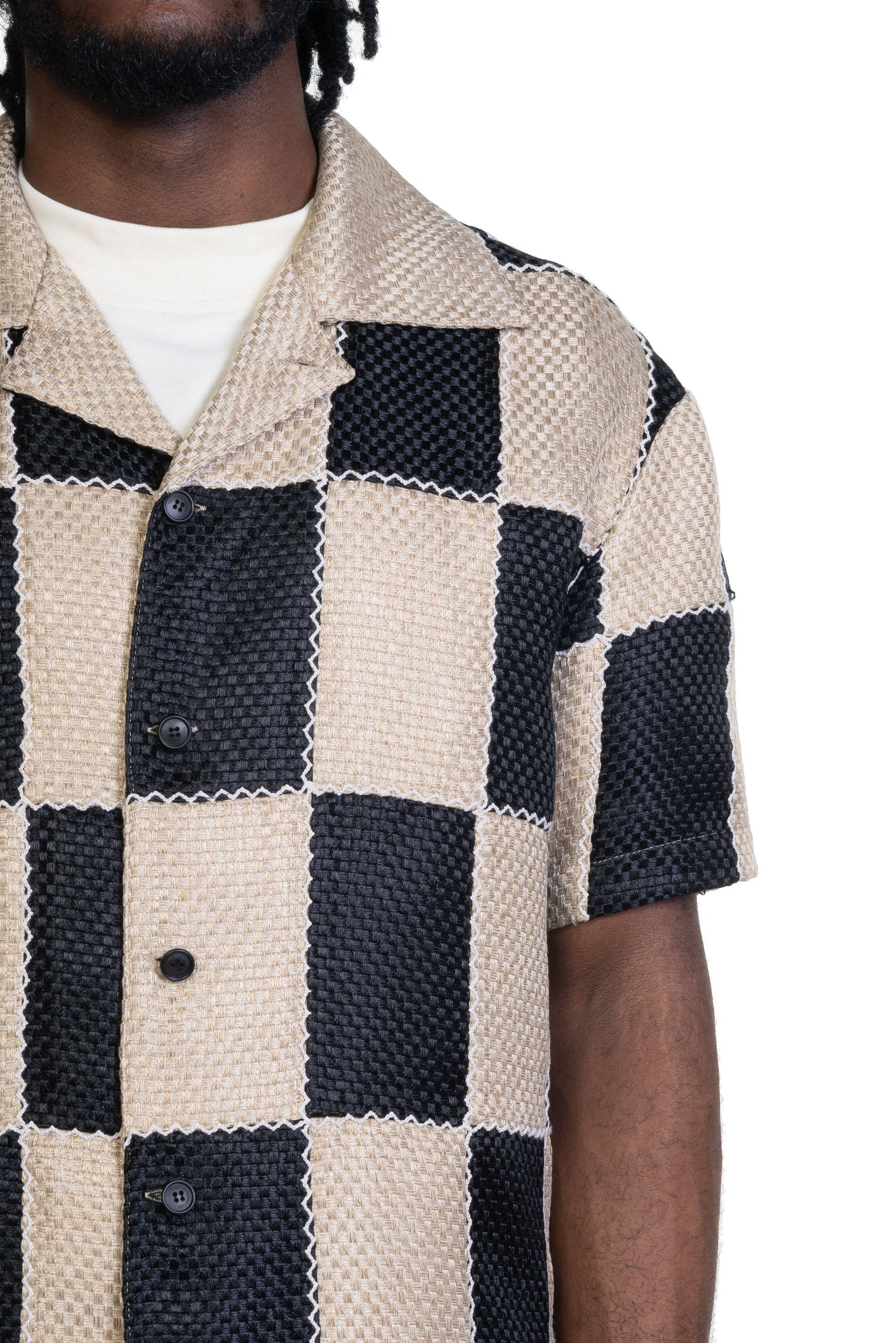 Andersson Bell Patchwork Open Collar Shirt. Short sleeves. Button closure at front. Open collar. Boxy fit.