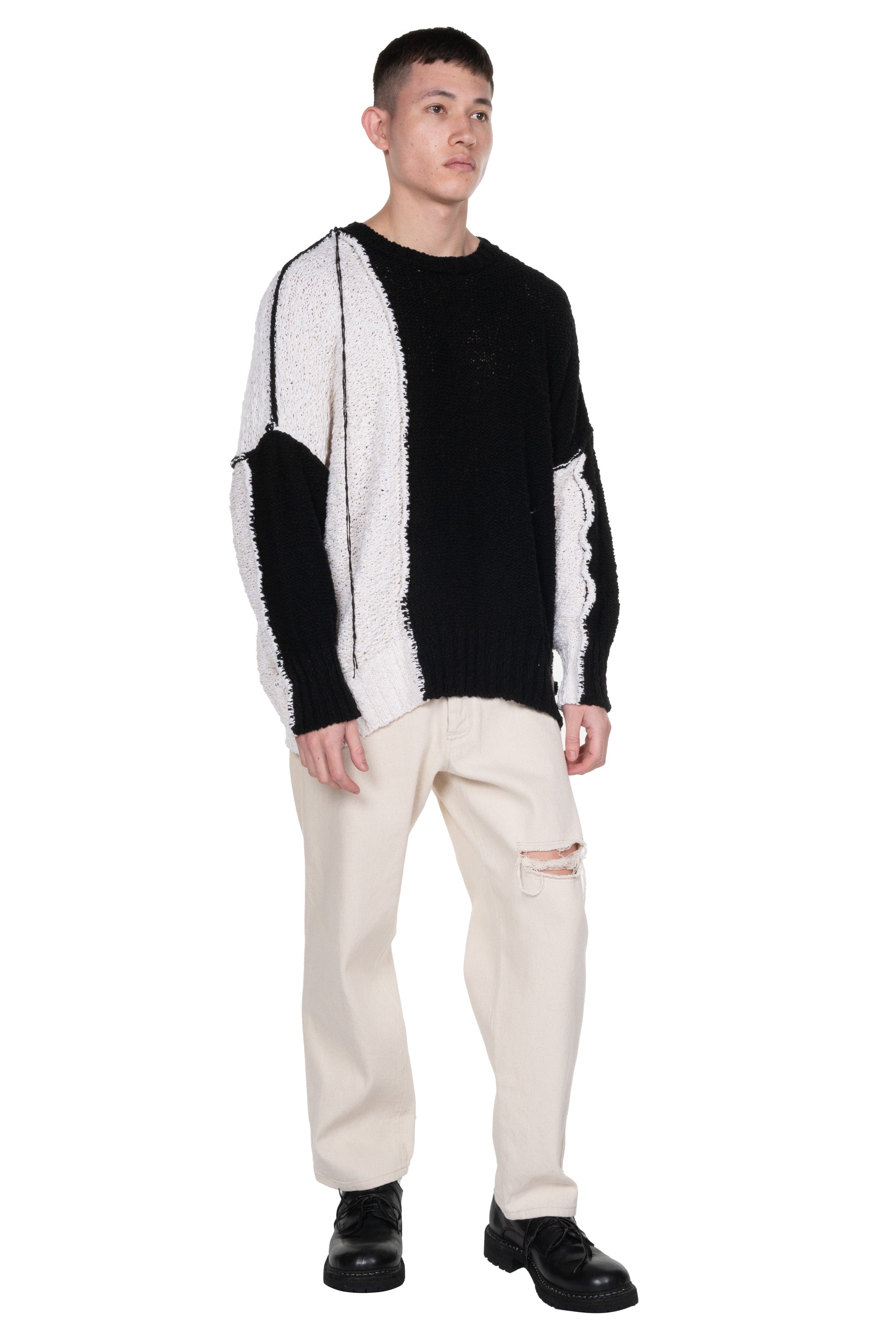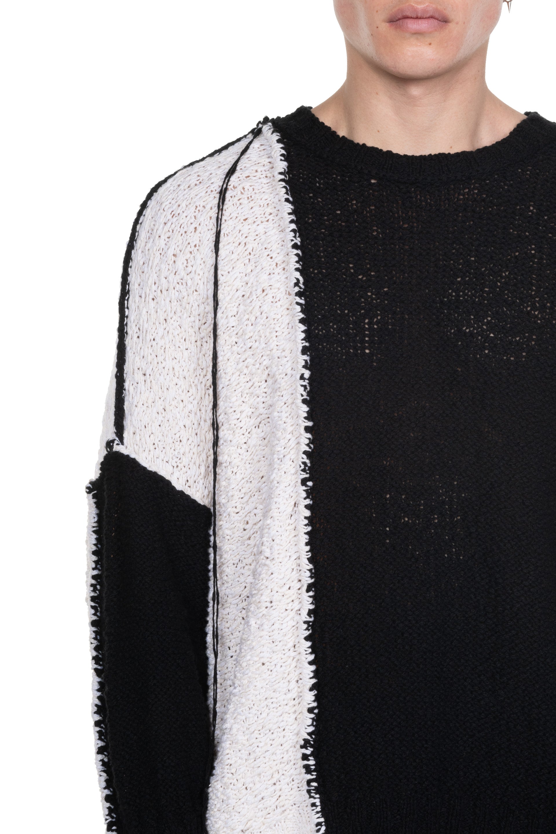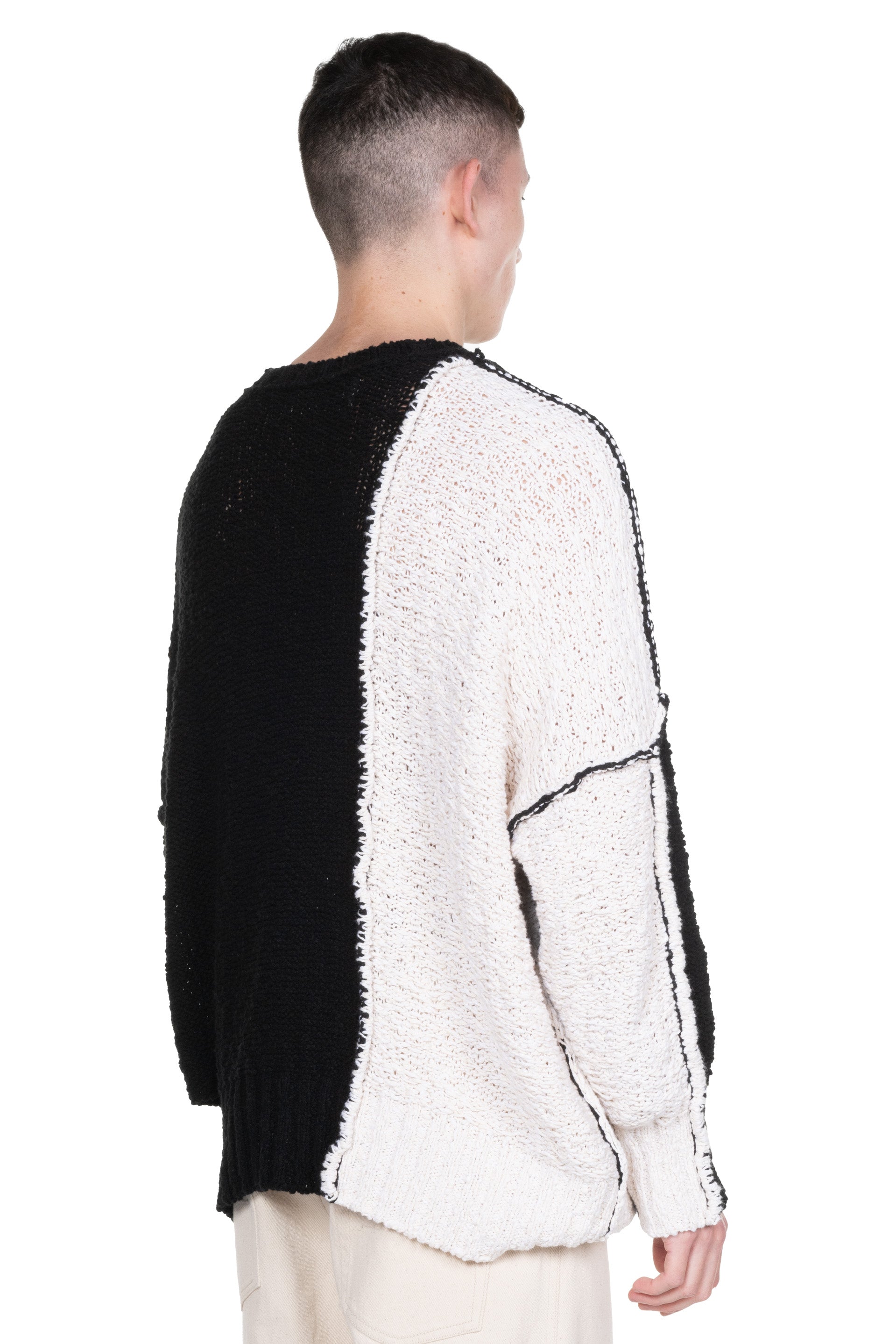 Long sleeves. Round neck. Boxy fit. Thick knit. Patchwork. Signature thread detailing throughout. Slit at side.