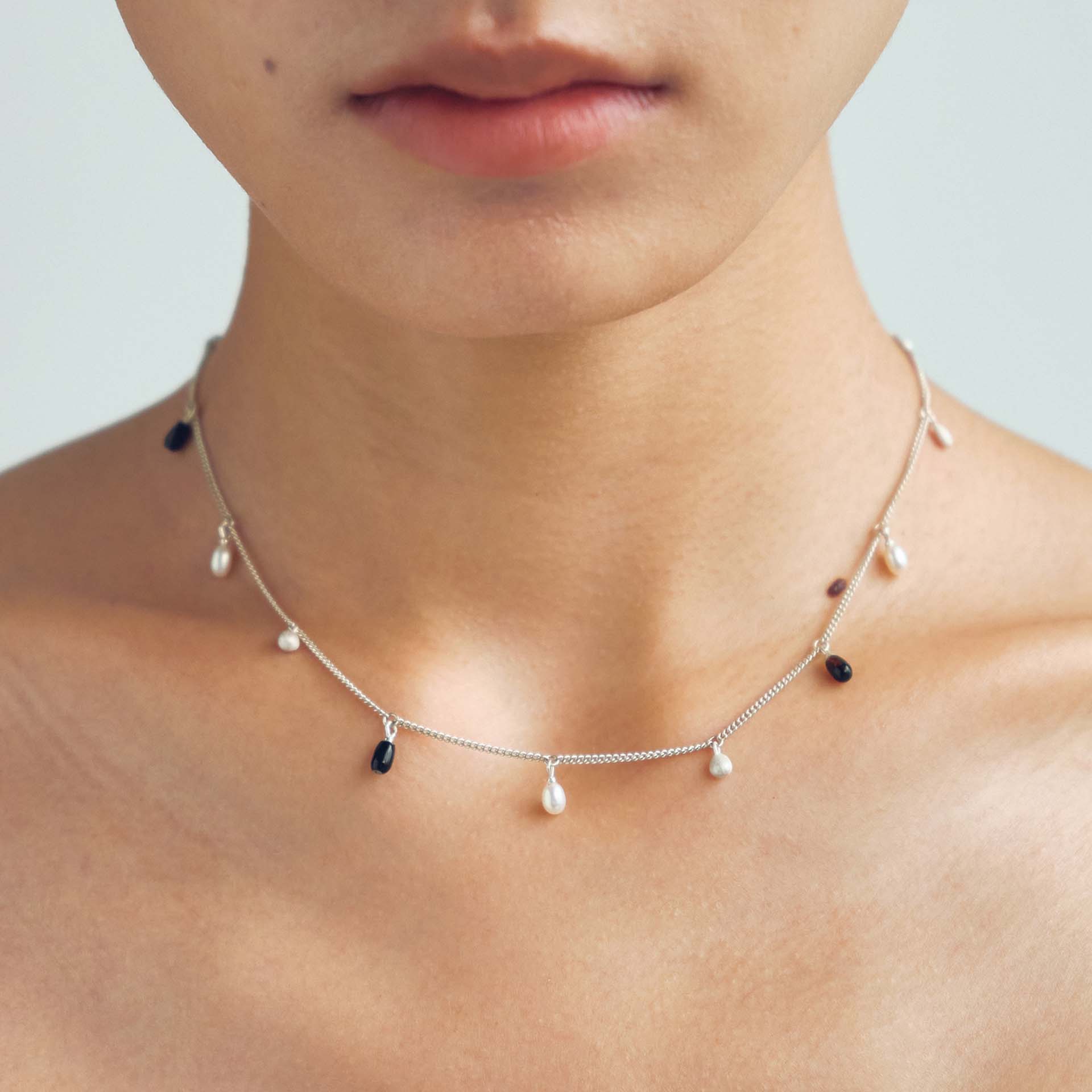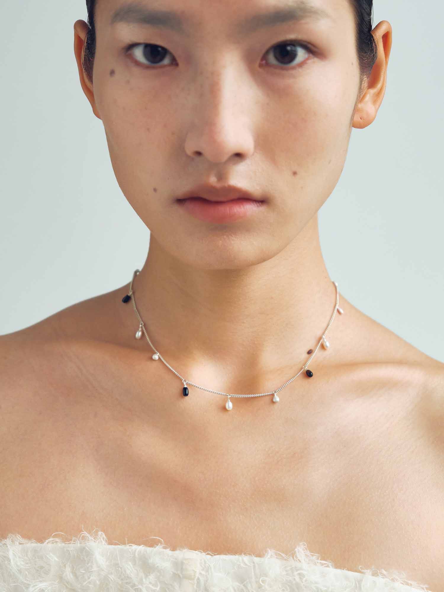 OLIO E ACETO is raw and authentic. It is about the companionship between people, and objects like the matte white surface becoming a blank canvas to be filled by the wearer as seen with the Pearl Black Agate Wind Chime Necklace.