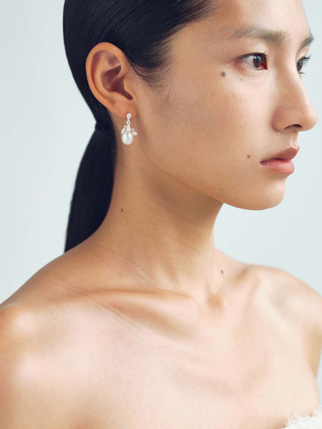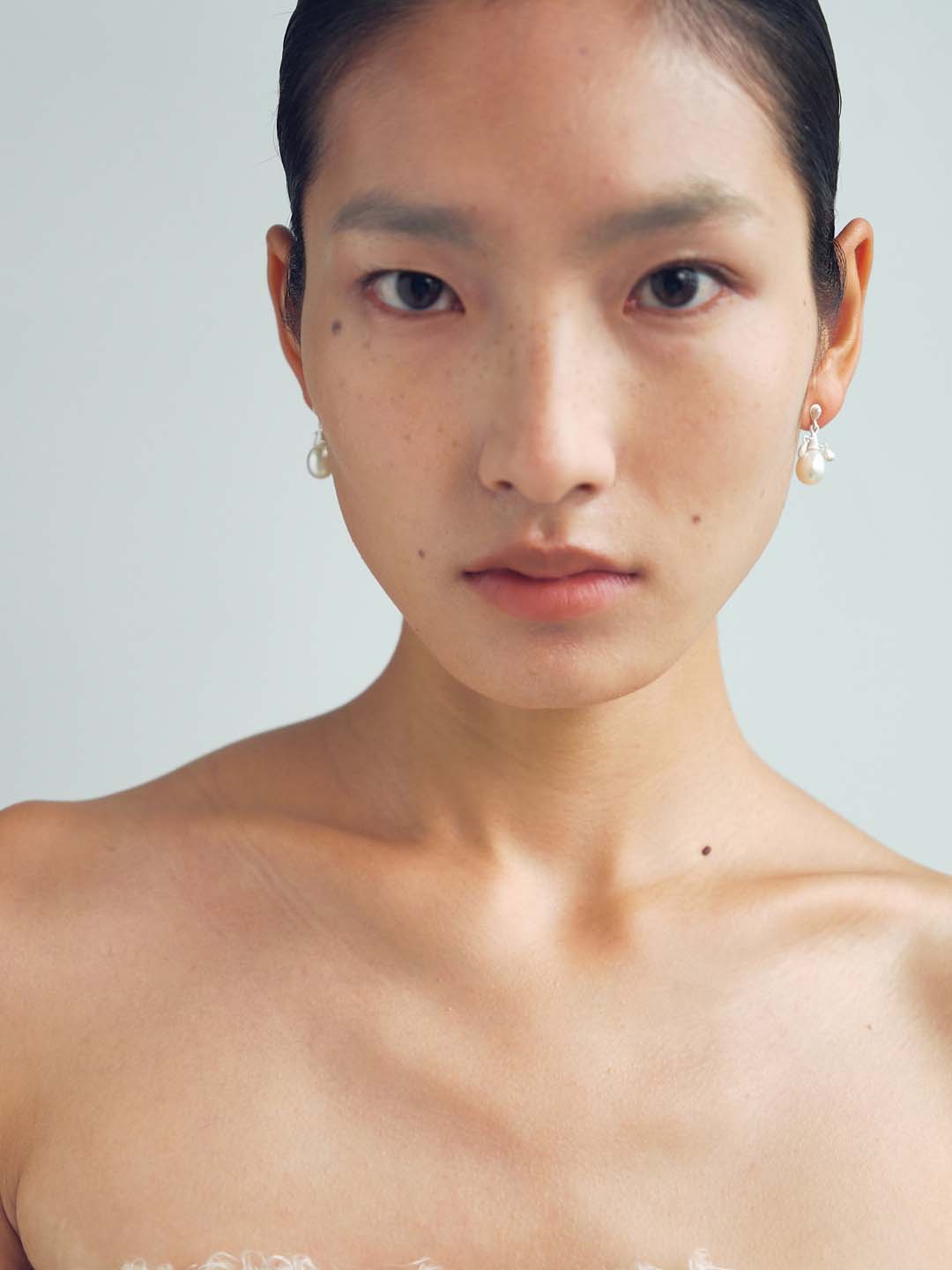 OLIO E ACETO is raw and authentic. It is about the companionship between people, and objects like the matte white surface becoming a blank canvas to be filled by the wearer as seen with the Pearl Round Earring.