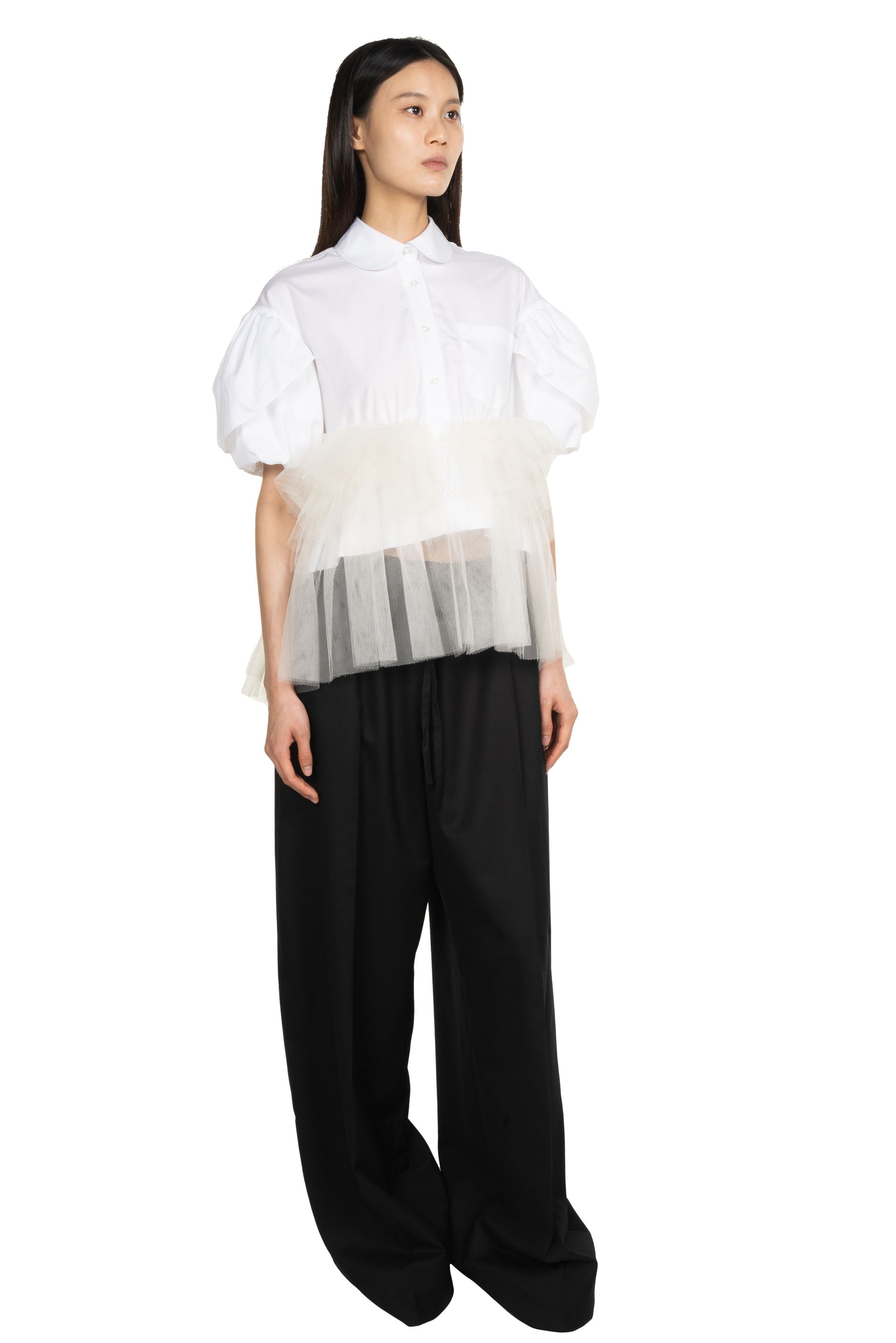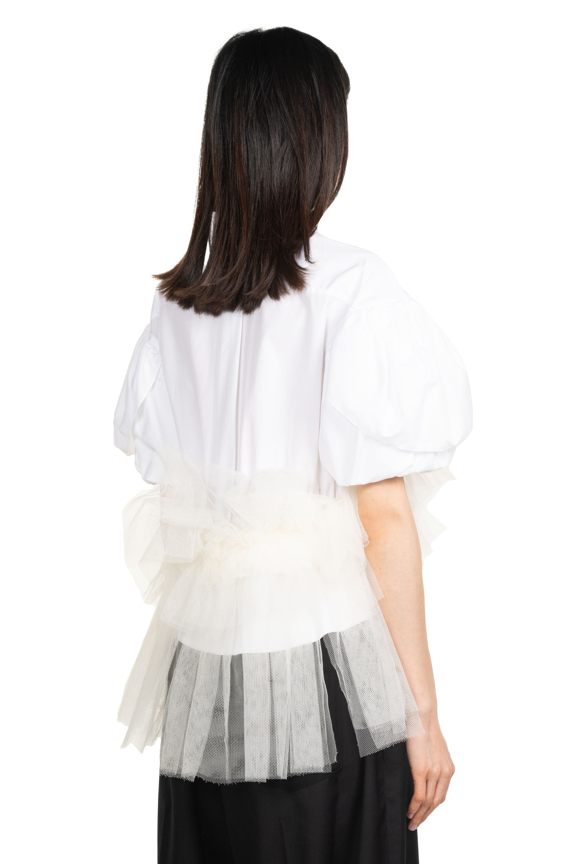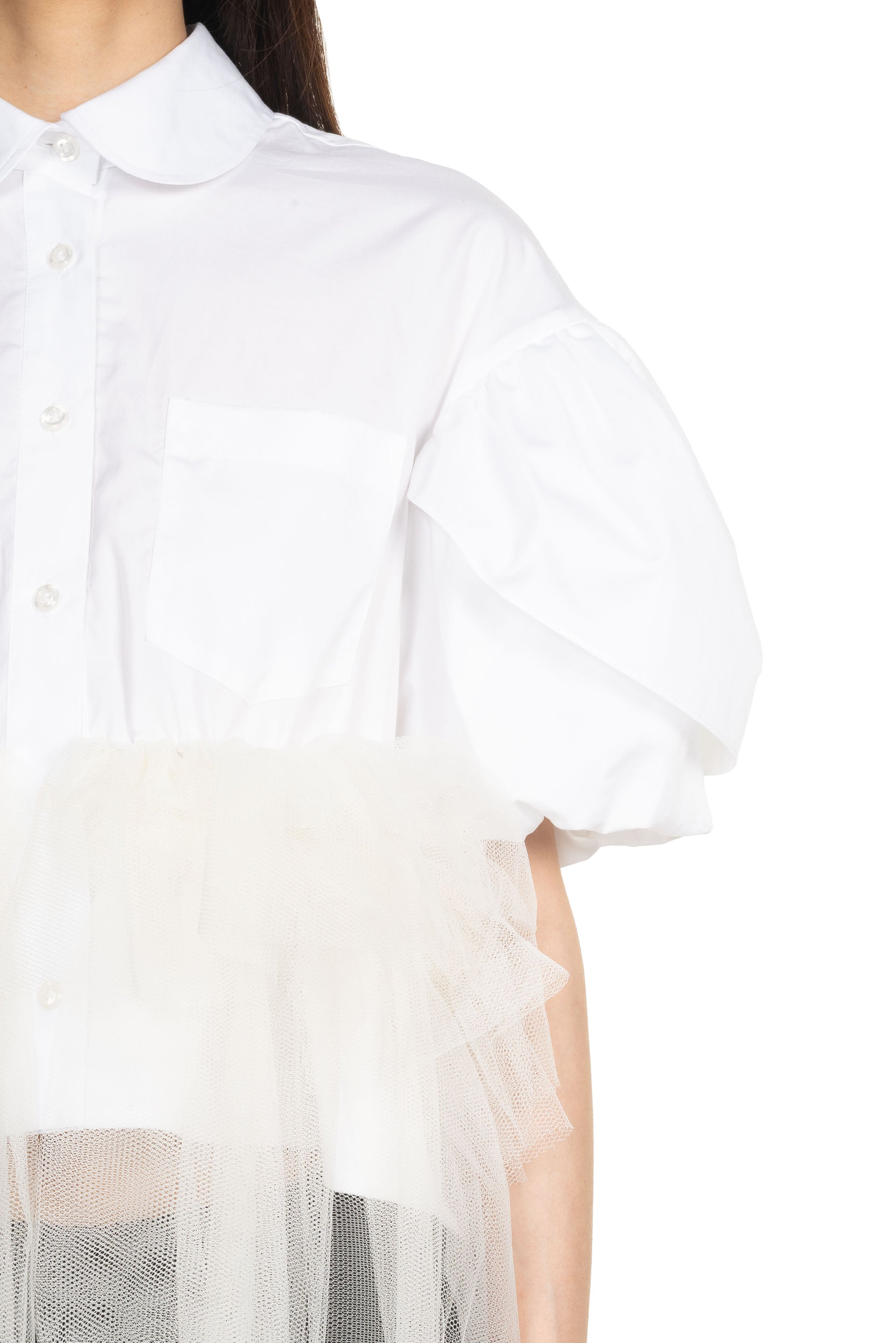 Simone Rocha White Puff Sleeve Shirt. Cotton poplin shirt. Rounded collar. Button closure. Patch pocket. Cropped hem with Tutu finish. Puff sleeves. Box-pleat at back yoke.