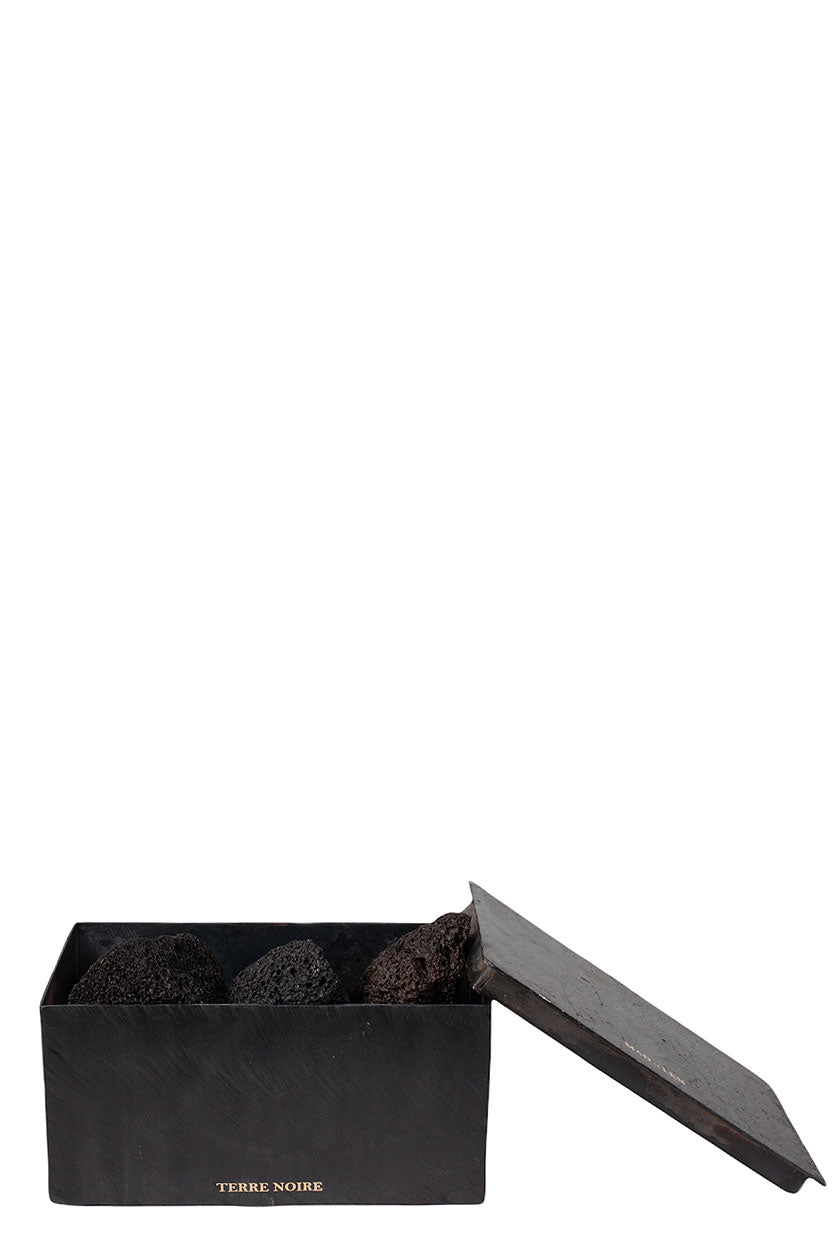 Pot Pourri Lava Rock Terre Noire in a rectangular shape.  Stored in  Hand hammered iron case with a black fumé finish and a black paper box. Fragrance scent of  Black Soil, Earthy, Mineral Note, Ancient woods of Petrified Pine, Rare Aged, Oakwood and Black Land. This pot pourri d’Apothicaire is served with a Terre noire Perfume Recharge 15ml.