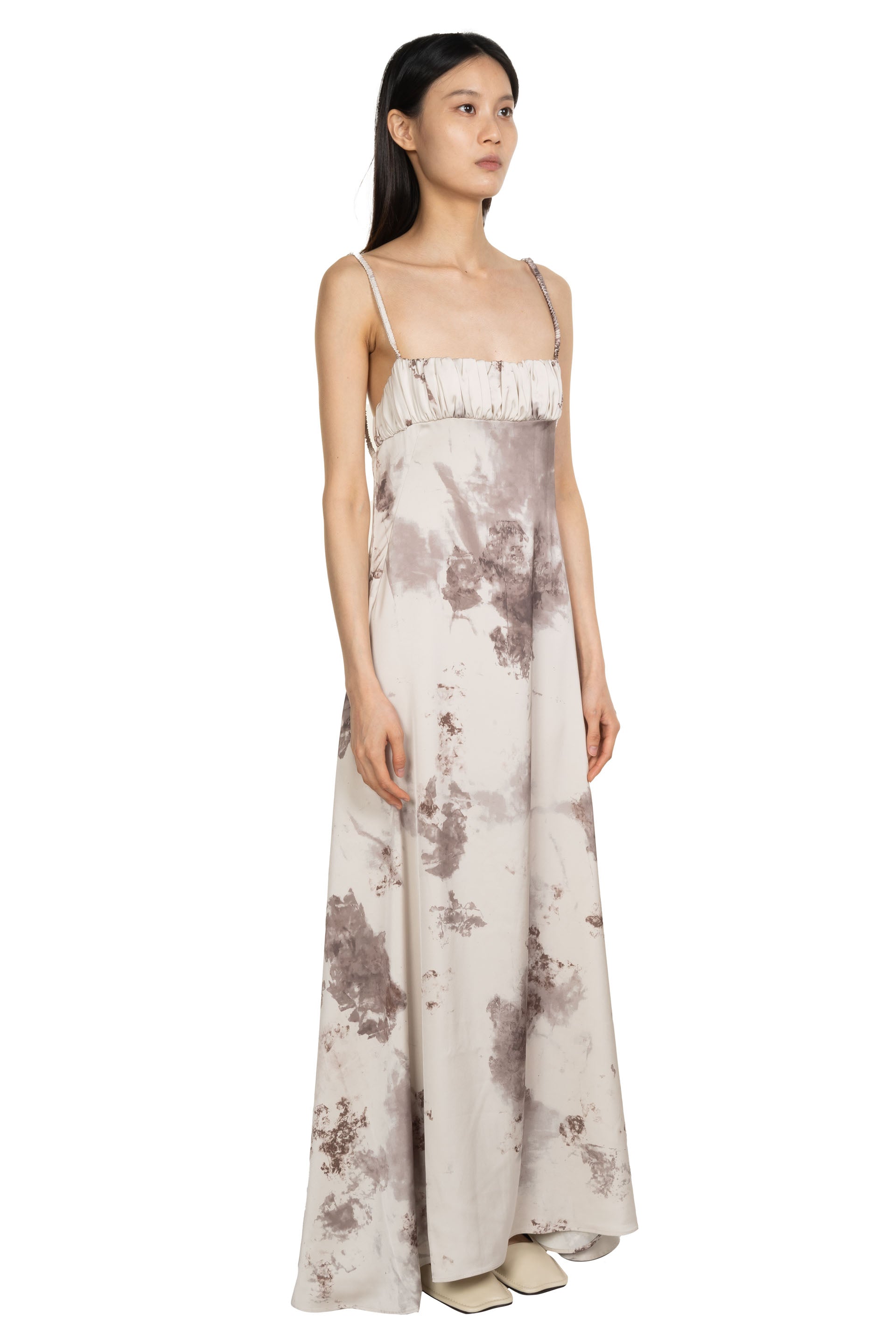 Peng Tai creates modern silhouette with traditional chinese philosophy. Inspired by how Chinese herbal medicine regulates the body from the inside out, Peng Tai aims to research and develop a way to boil Chinese herbal medicine with fabrics, to create clothes that feel like a second skin as seen with the Printed Gathered A Cut Maxi Dress.