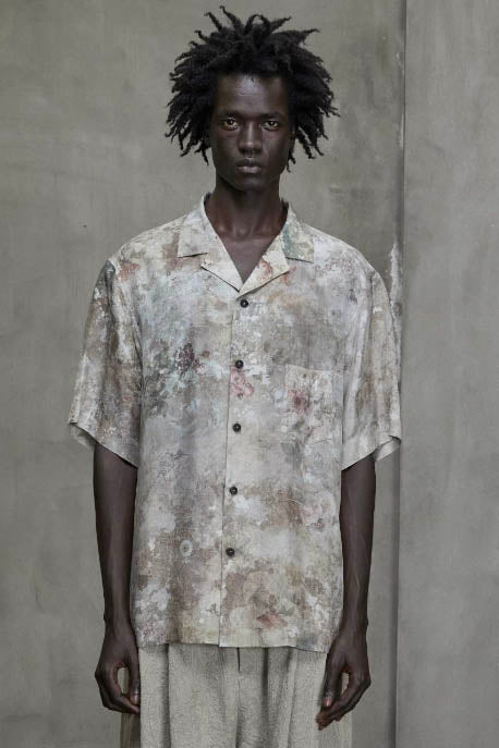 Ziggy Chen Interlude II capsule collection offers in between seasons fabric inspired by Ziggy Chen personal archives. Short sleeves. Open collar shirt. Dropped shoulder. Boxy fit. Button closure at front. Signature slit at sides. Ziggy Chen seasonal print.