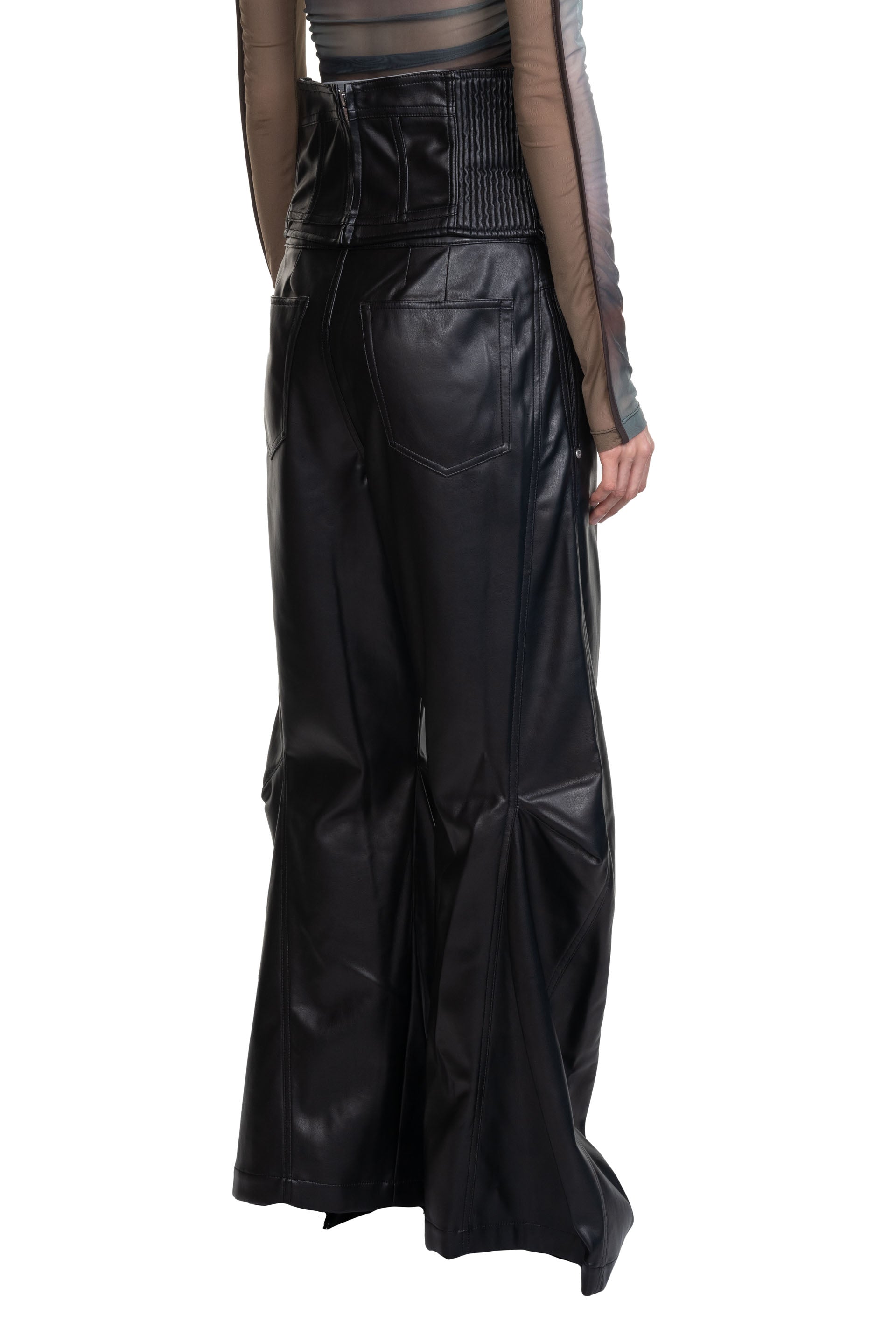Cargo trousers in faux leather material. Multi pocket throughout. Button closure at waist. Detachable extra waist band. Two pockets at sides. Wide leg.