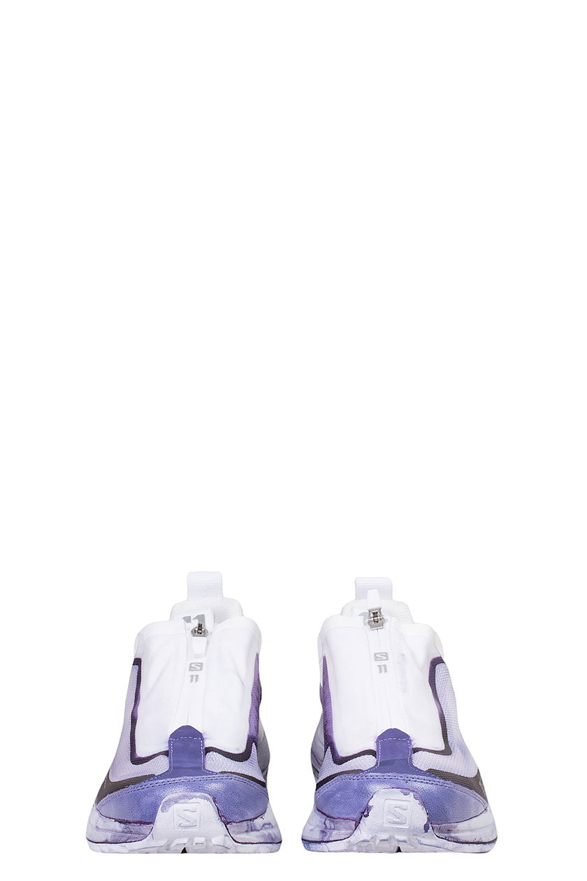 Low-top panelled stretch bonded jersey, mesh, and faux-leather sneakers in Purple & Black. Over-died detailing and smudging throughout. Round toe. Zip closure in black featuring tonal logo printed at vamp. Tonal concealed lace-up closure. Tonal bonded logo at tongue. Webbing pull loop featuring tonal bonded logo at back collar. Tonal bonded logo at heel counter. Logo and text printed in grey at outer sides. Tonal foam rubber midsole. Tonal treaded Contagrip® rubber outsole.