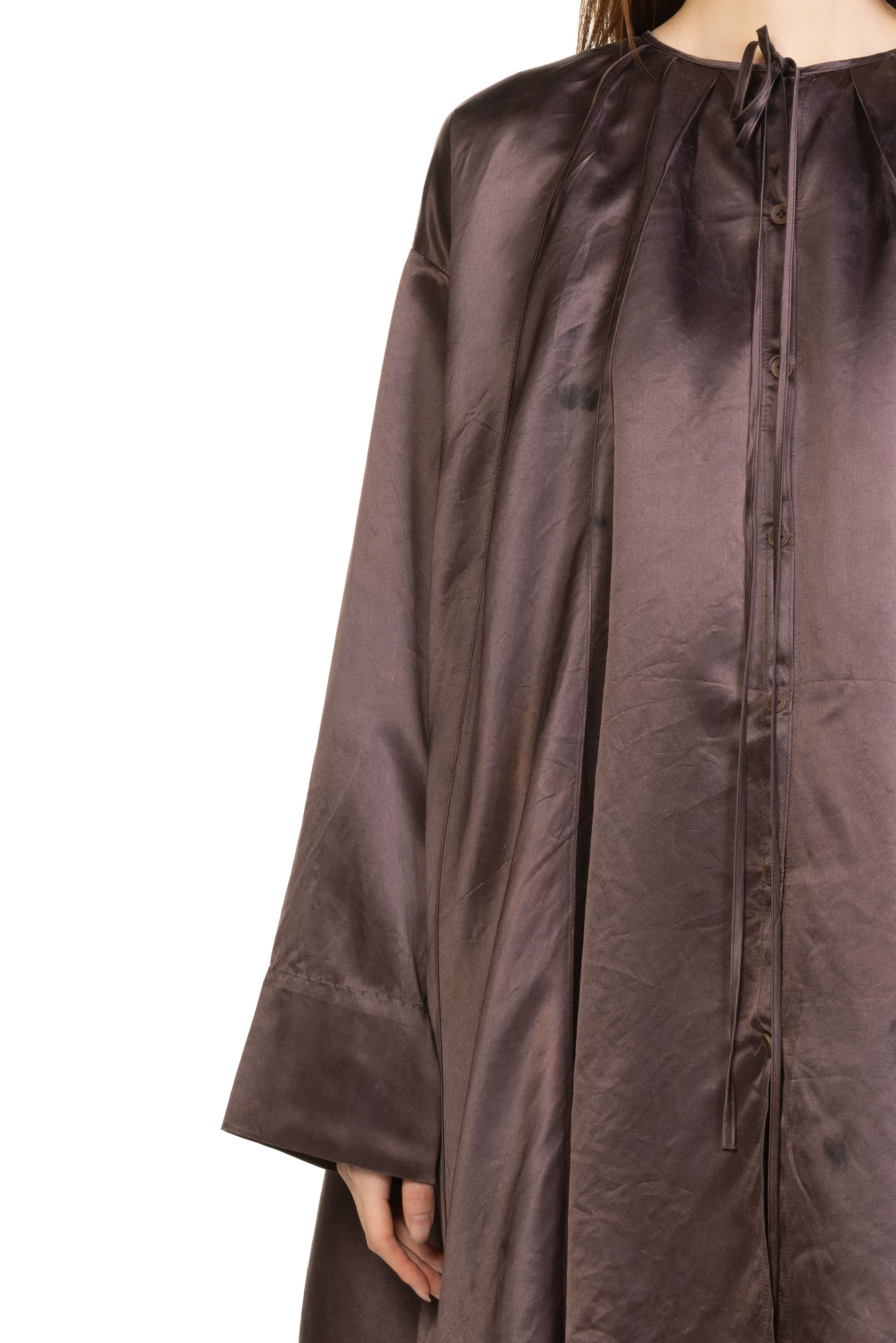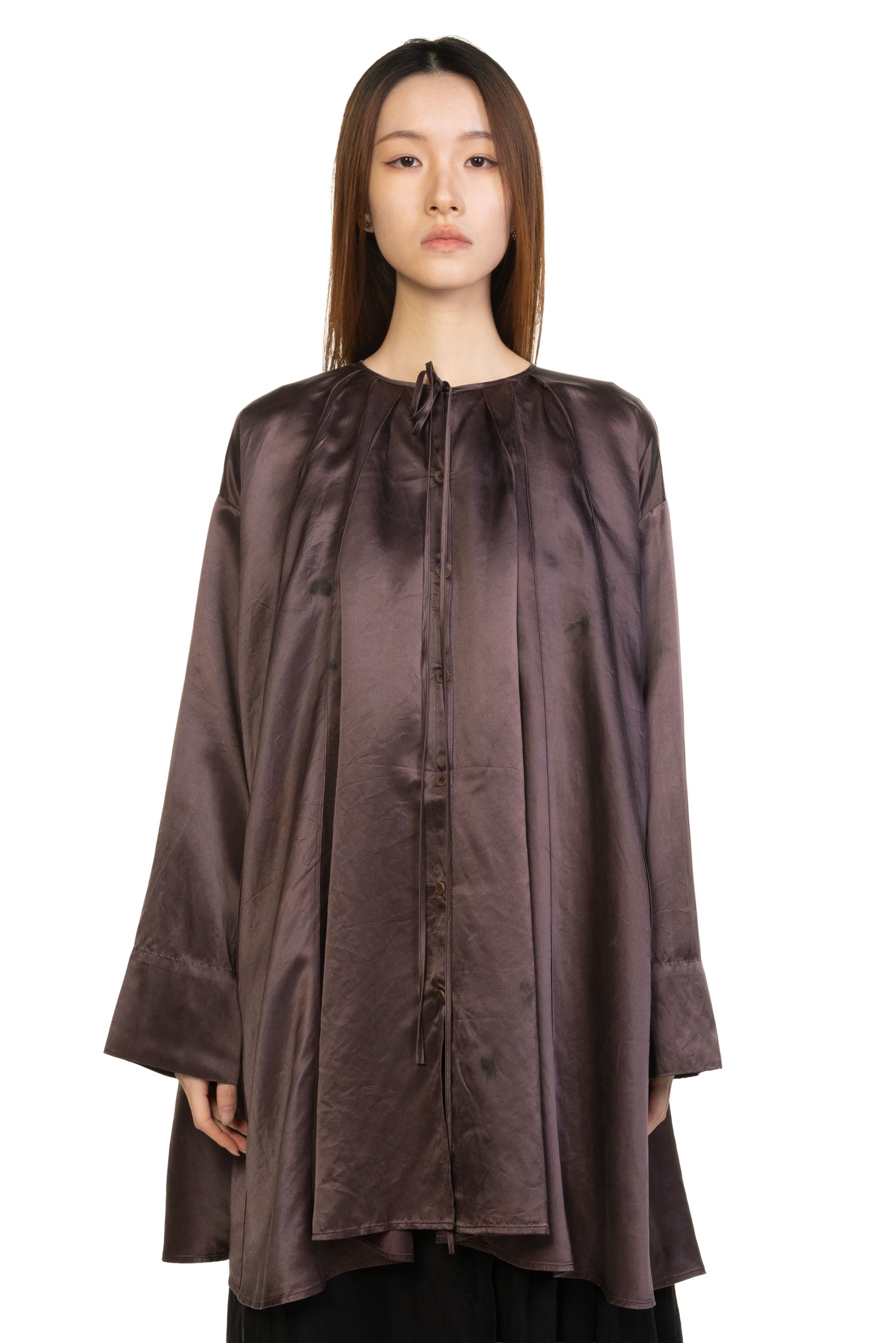 Mute Dance Purple Blouse in Silk. Long sleeves. Button closure at front. Round neck. Drawstring closure at neck. Pleated at back and front. Signature silk fabric.