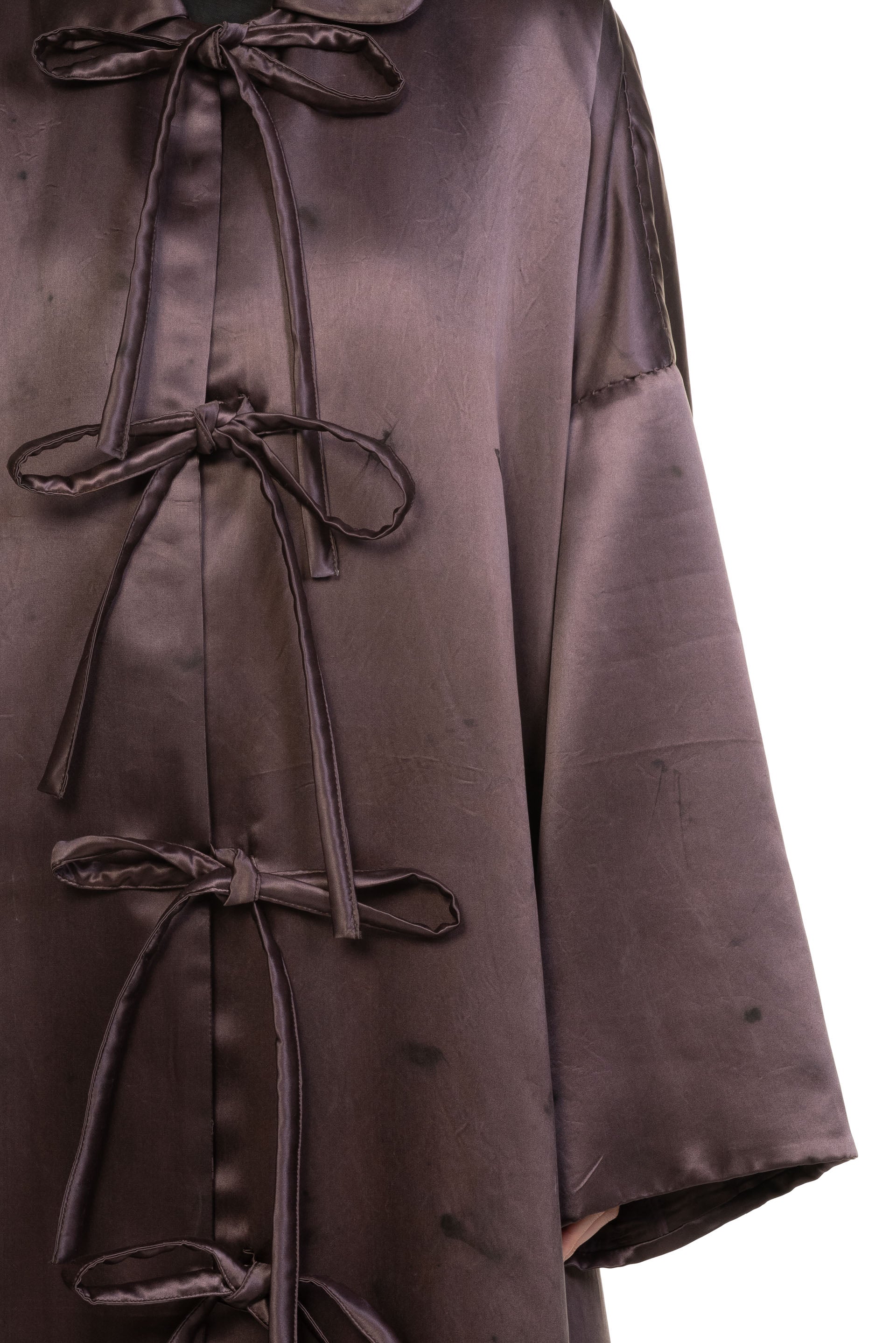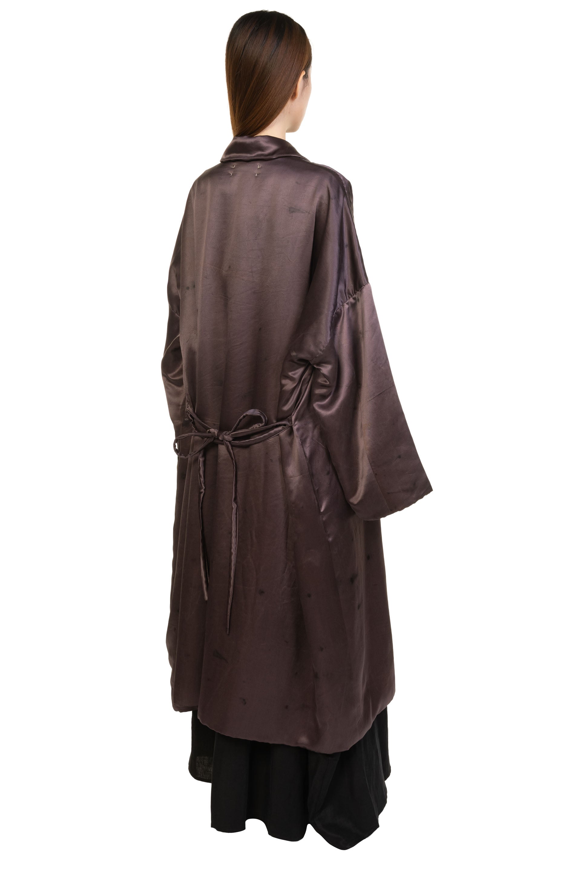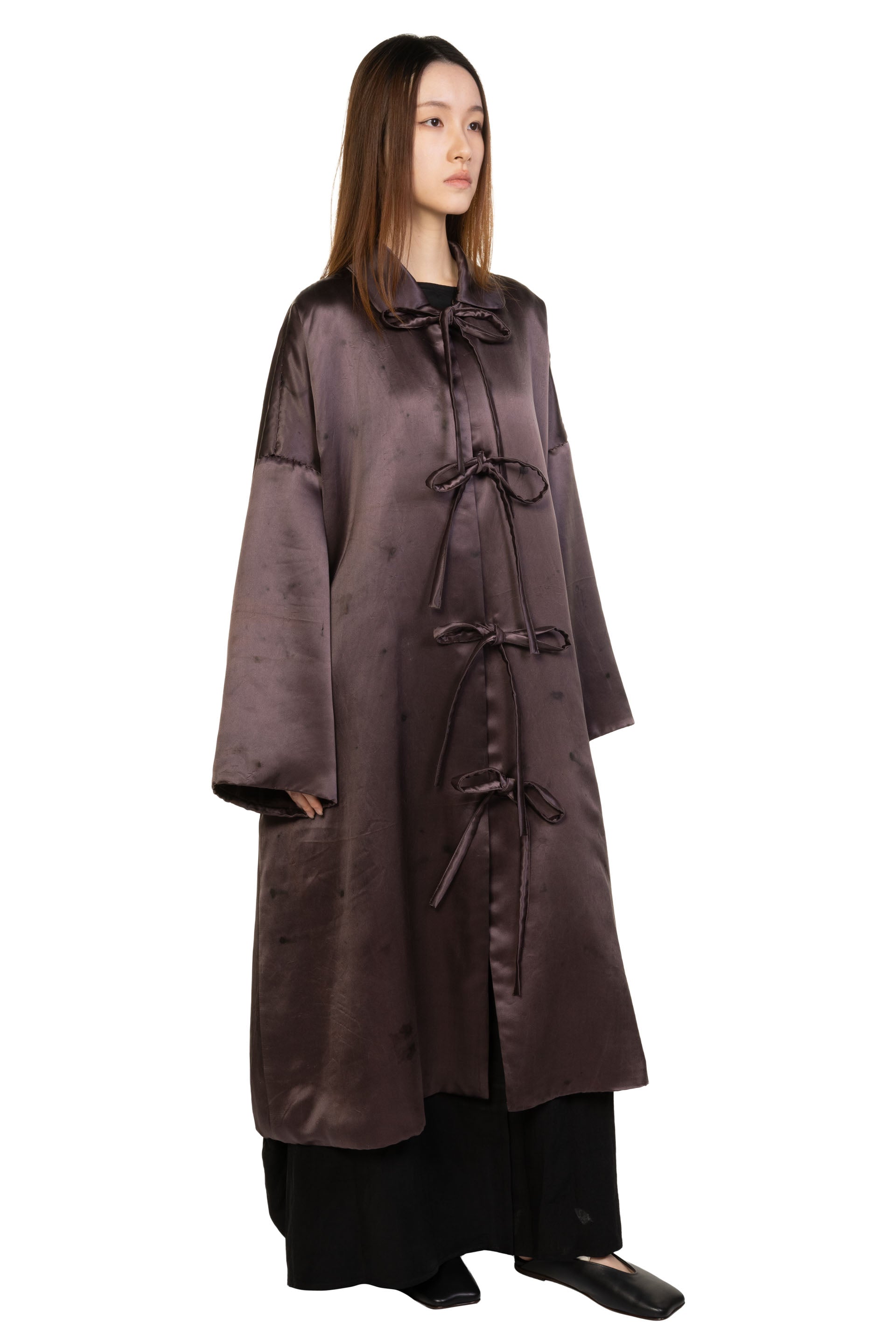 Mute Dance Purple Coat. Long sleeves. Drawstring closure at front. Padded and lightweight. Two side pockets. Dropped shoulders. Signature silk fabric throughout.