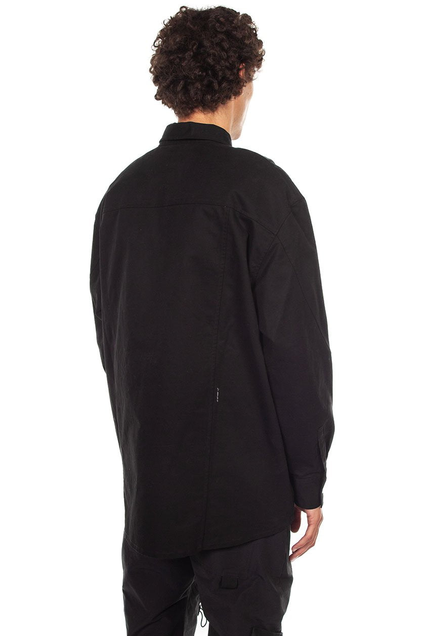 Long sleeve cotton shirt in black. Button closure. Spread collar. Padded Vest with metal detailing. Zip closure at front. Magnetic buttons. Zippered utility pocket featuring pen slots at upper sleeve. Logo embroidered. Fully lined. Silver-tone hardware.