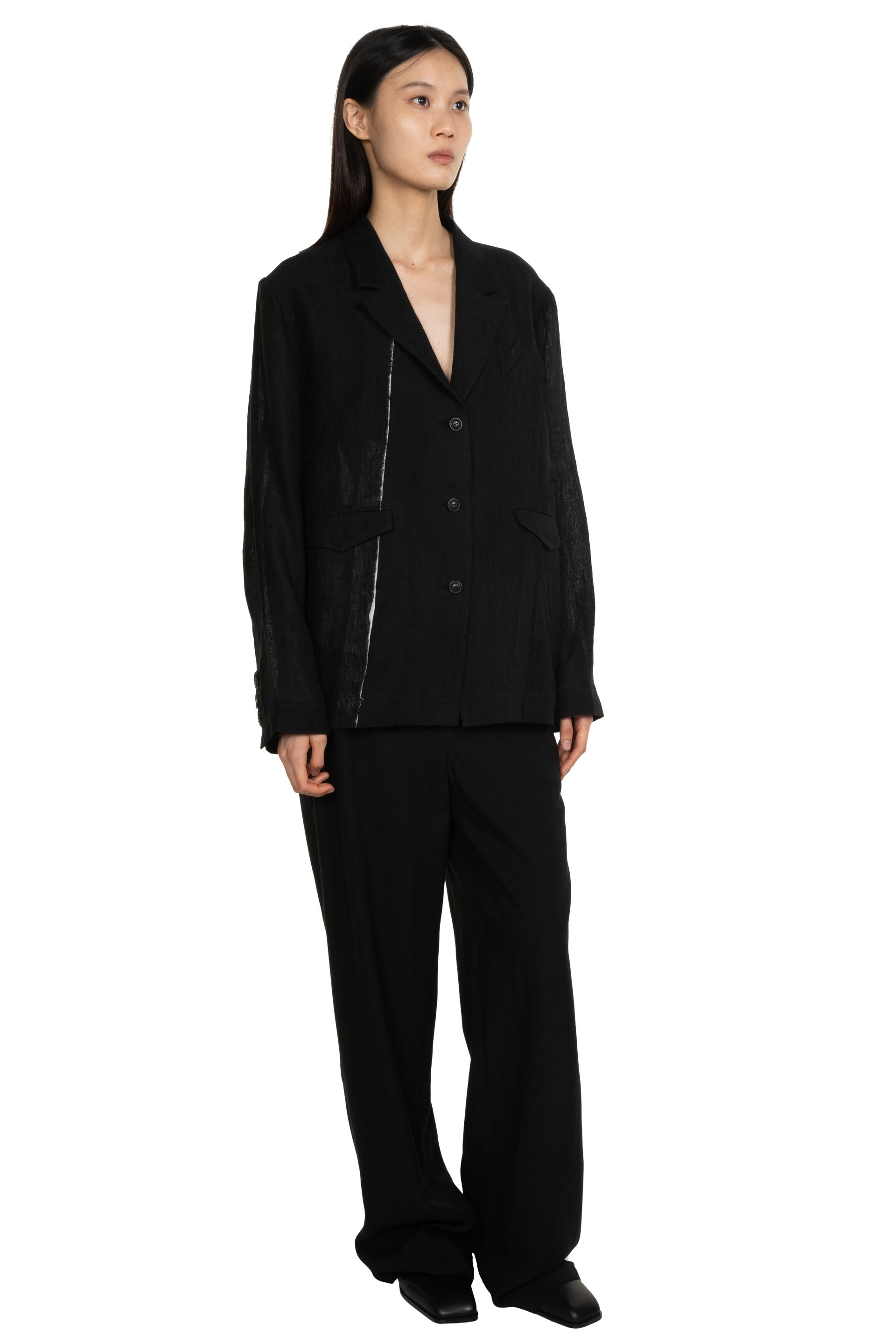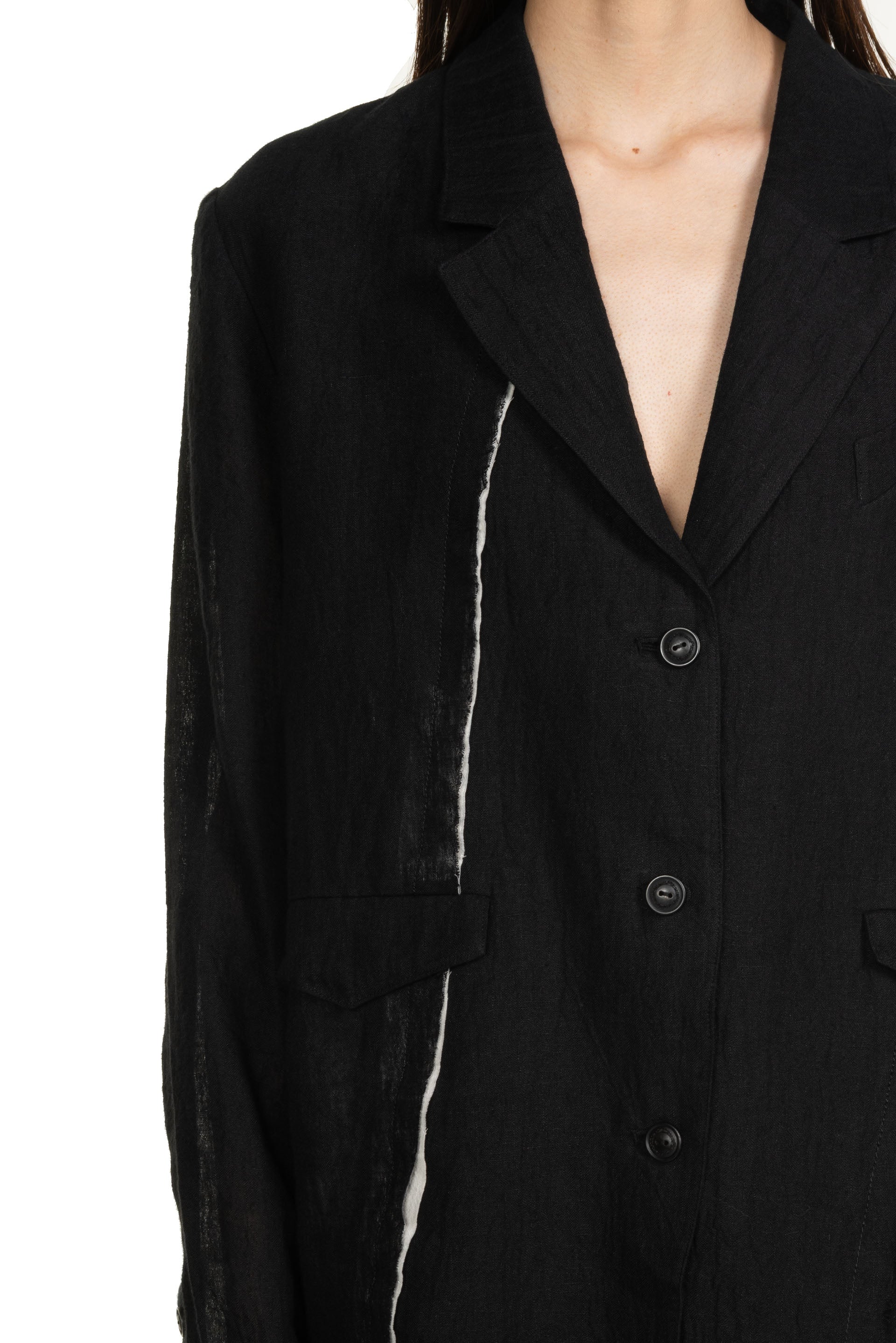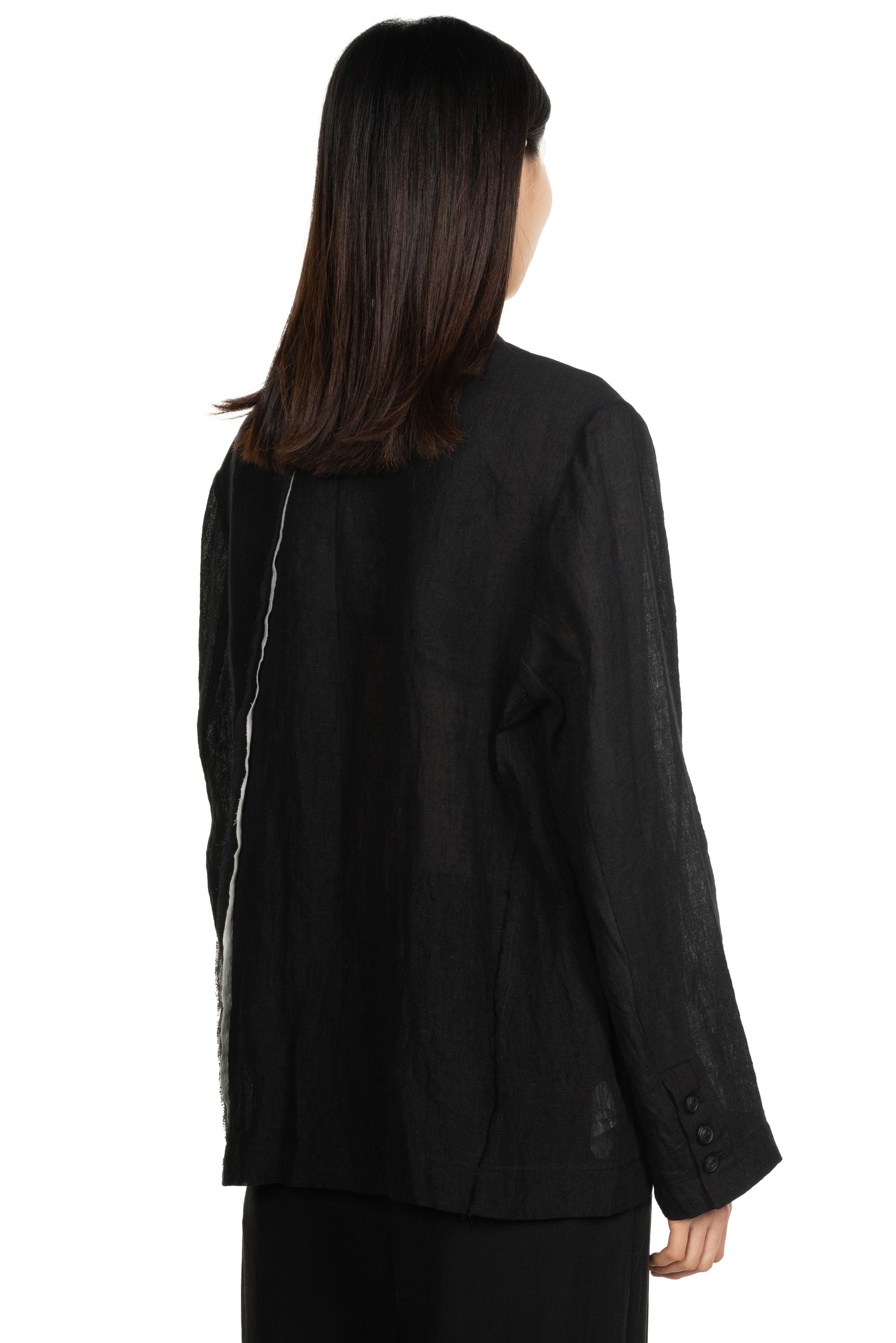 Professor. E understands the time of aesthetics from the use of cotton, hemp and wool. Fabric stitching, patching, designs without edge trimming, deconstruction, and reproduction are all Professor. E's signature elements creating classic immortal designs that can be viewed with the Radial Lined Blazer Black.