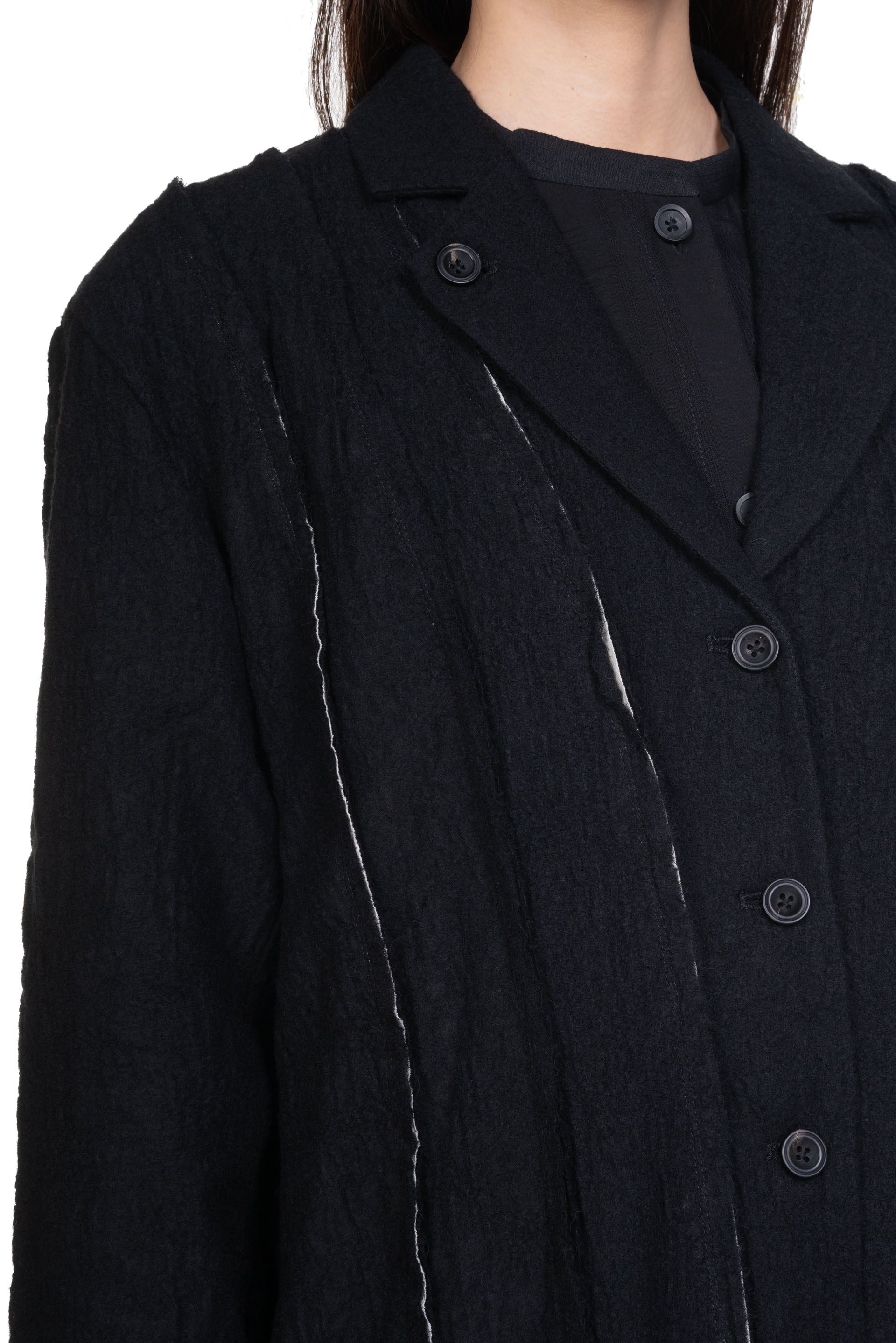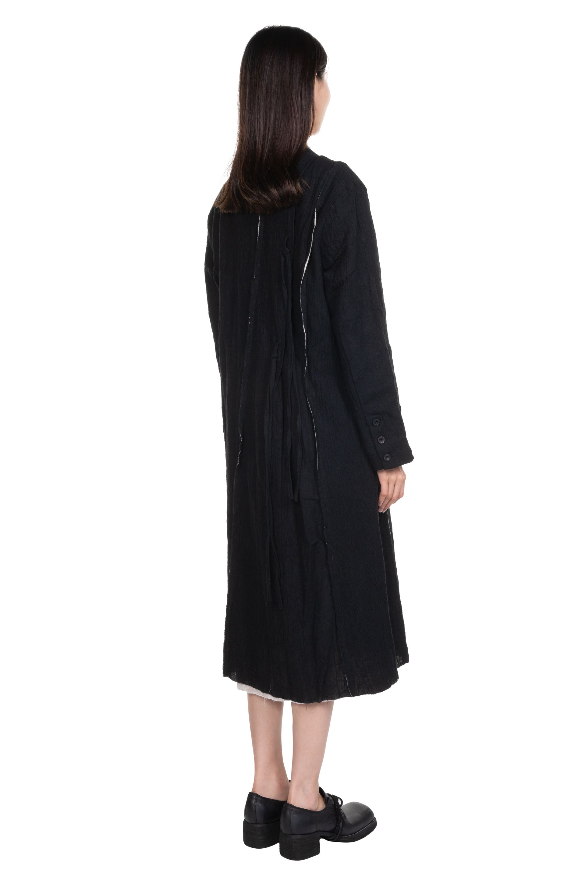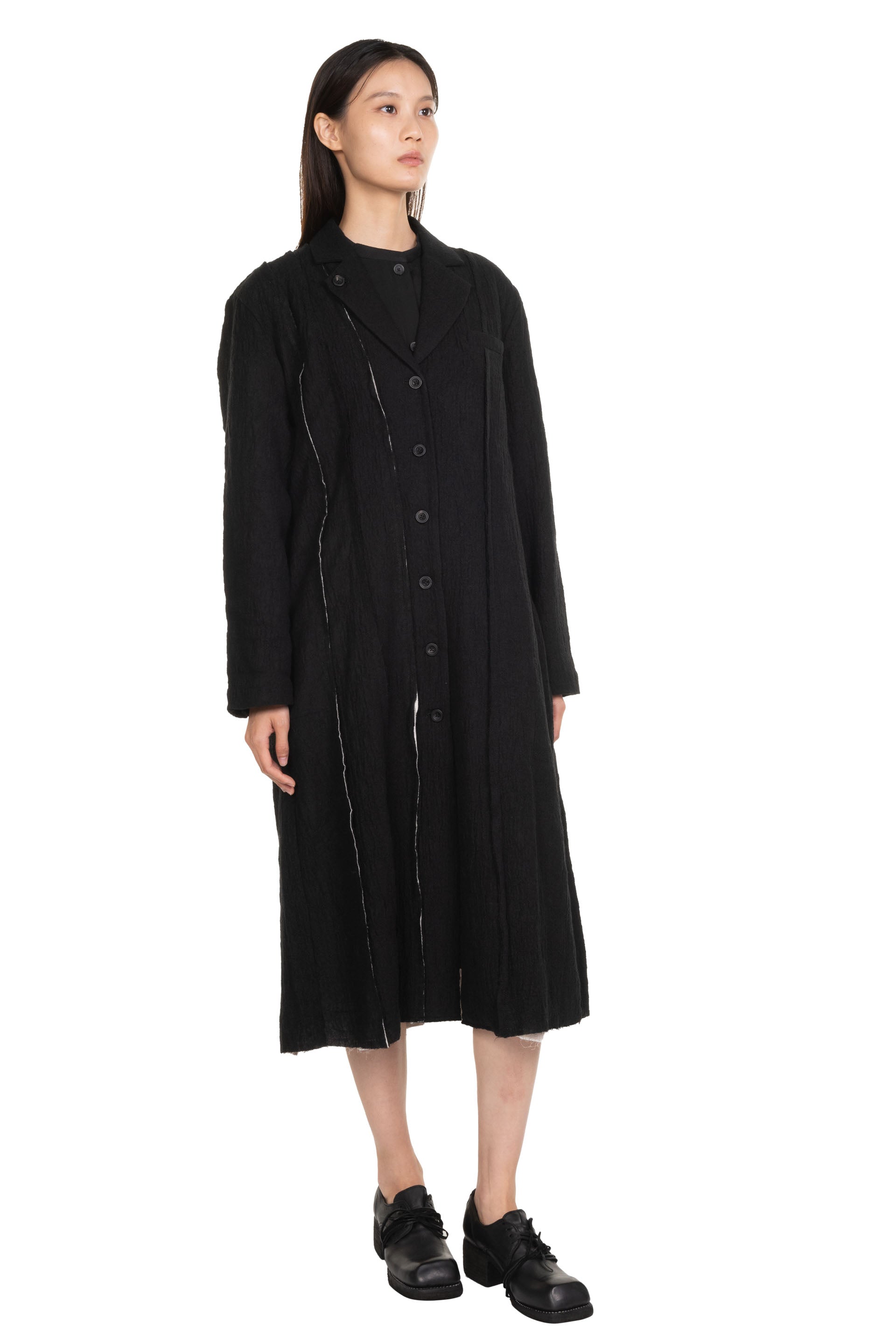 Professor. E understands the time of aesthetics from the use of cotton, hemp and wool. Fabric stitching, patching, designs without edge trimming, deconstruction, and reproduction are all Professor. E's signature elements creating classic immortal designs that can be viewed with the Radial Lined Coat Black.