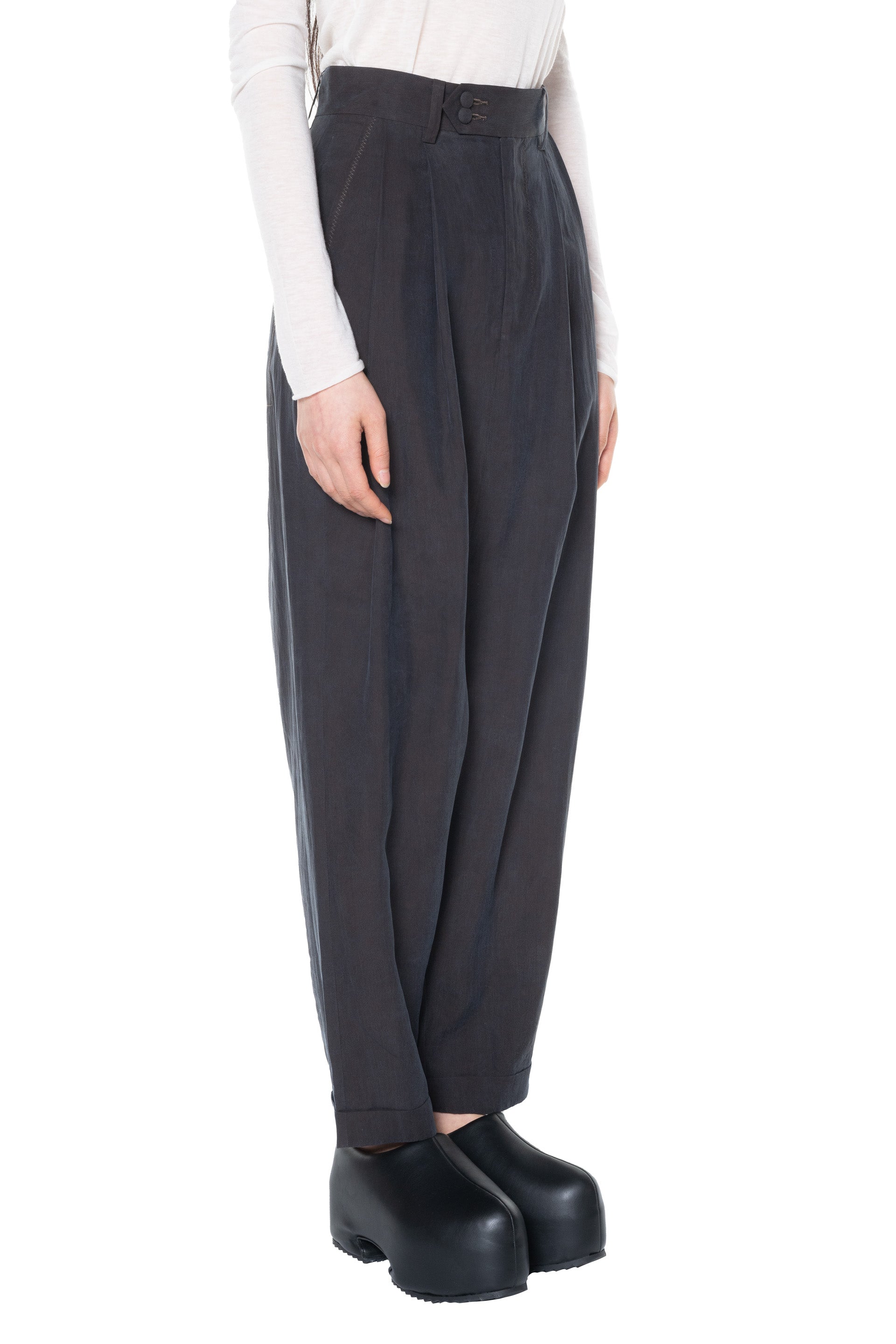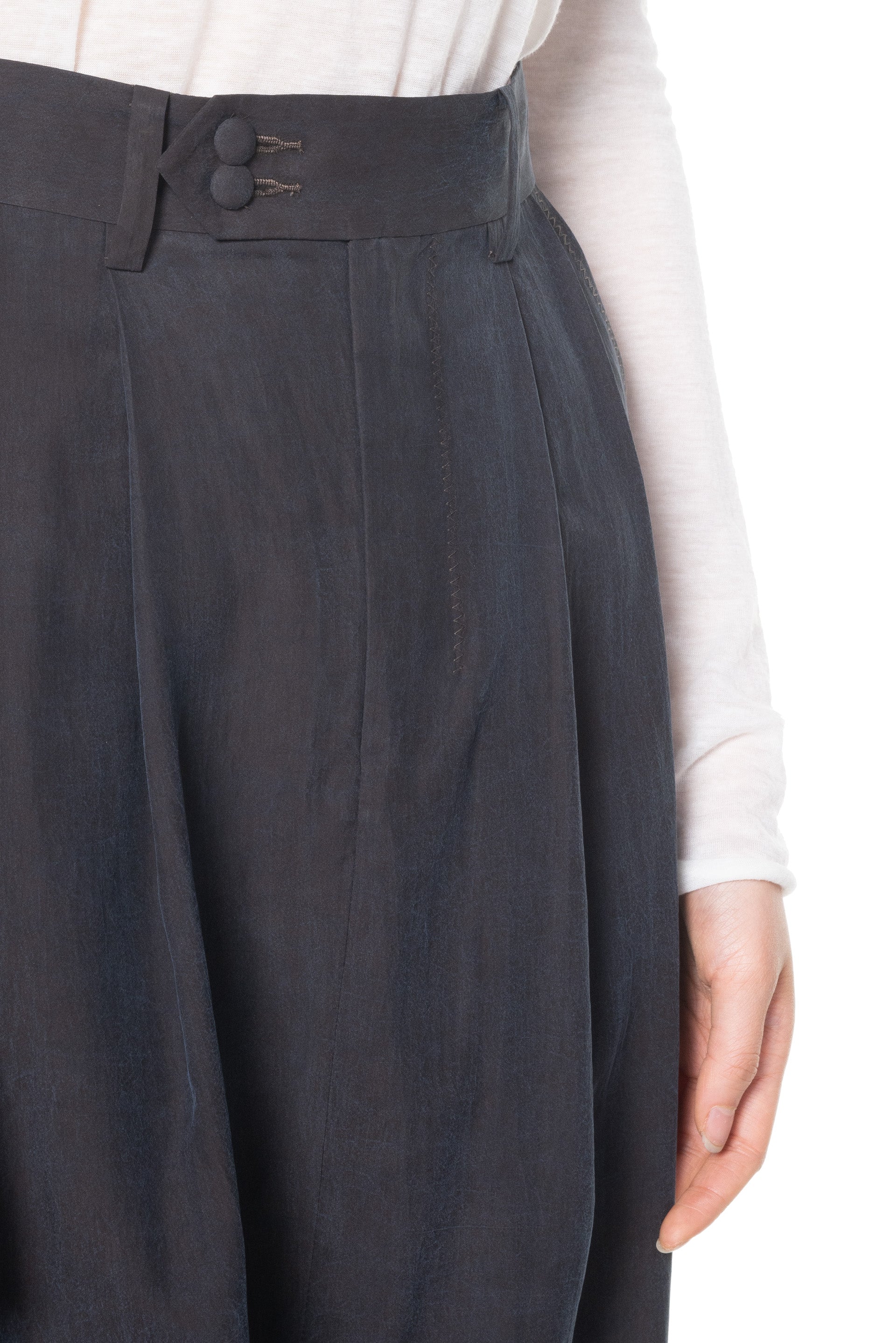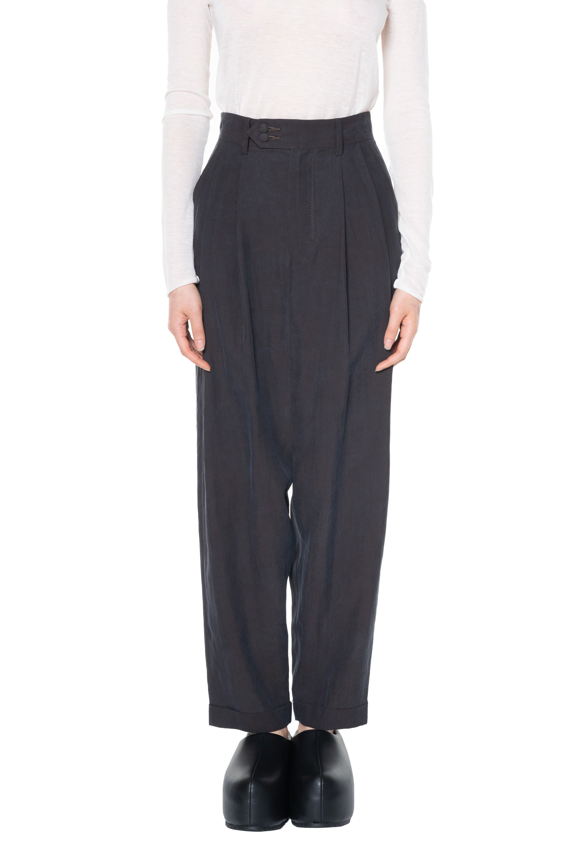 High waisted. Pleated at front. Two button closure at waist. Two side pockets. Two back pockets. Lower crotch. Beautiful soft and light fabric.