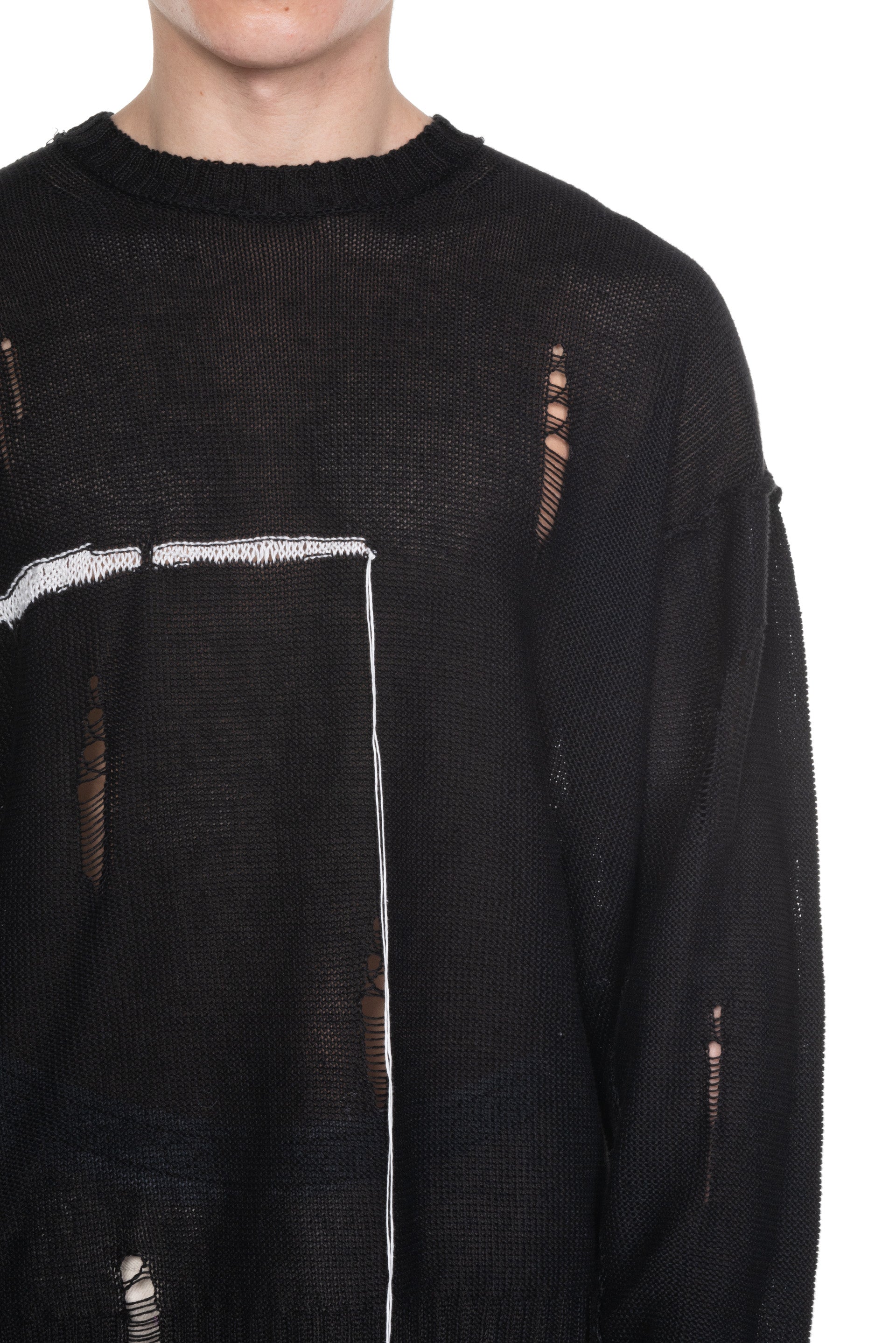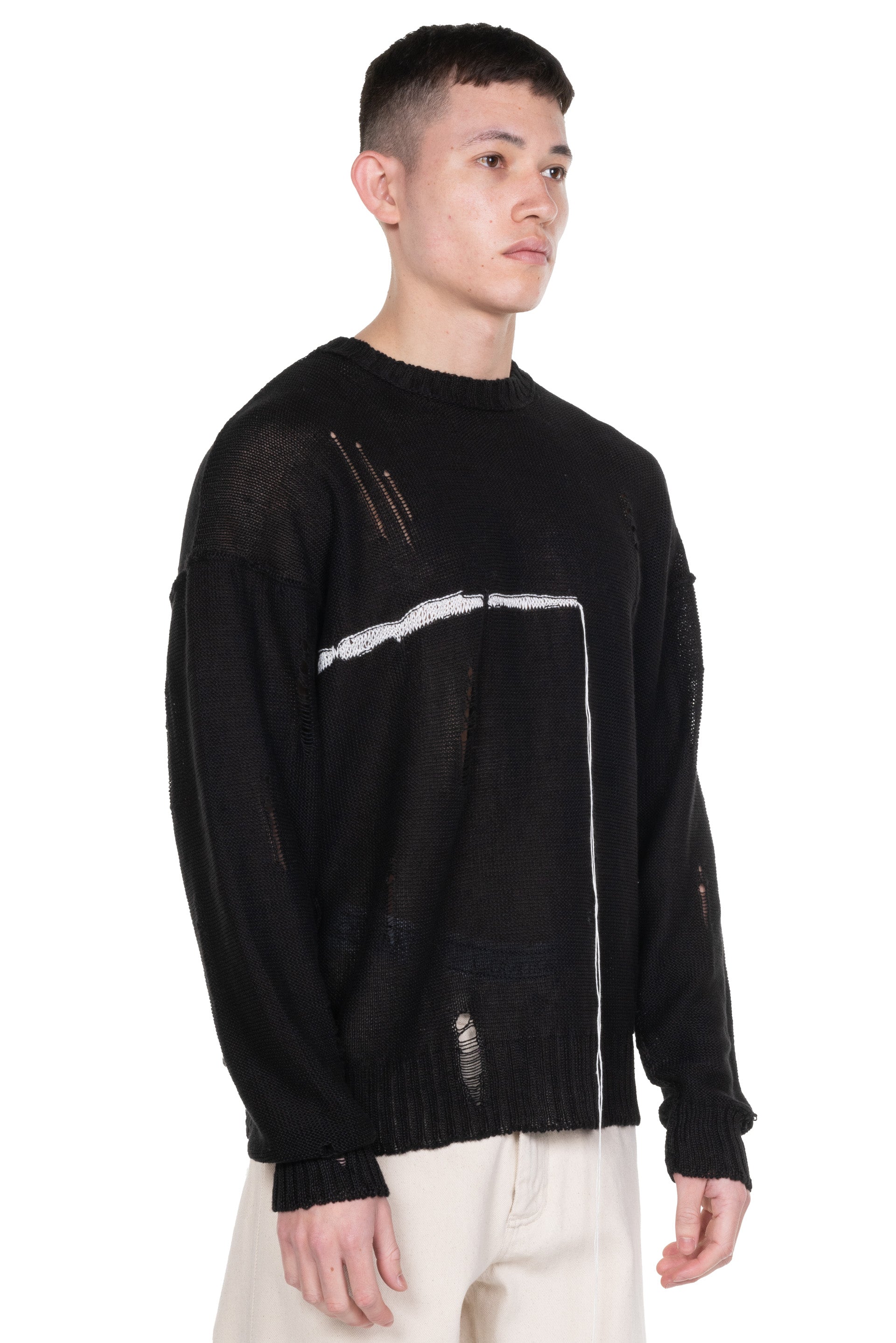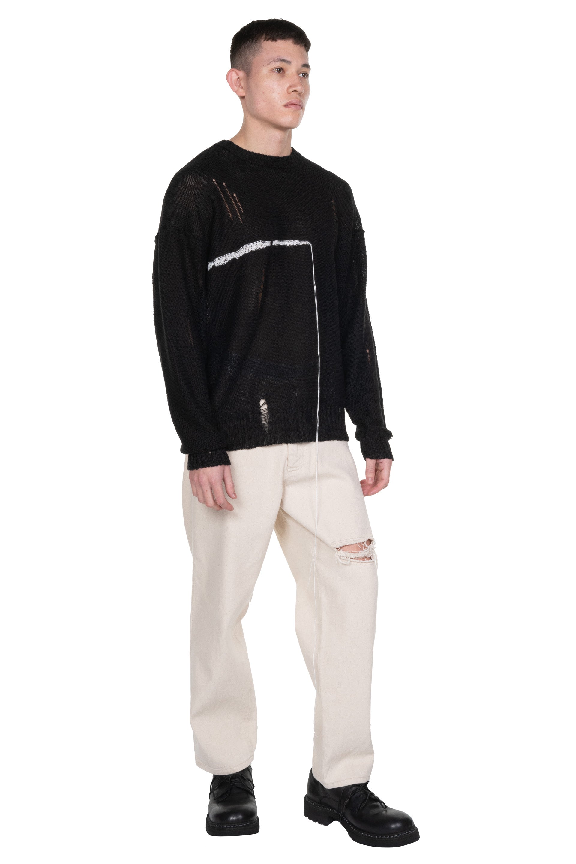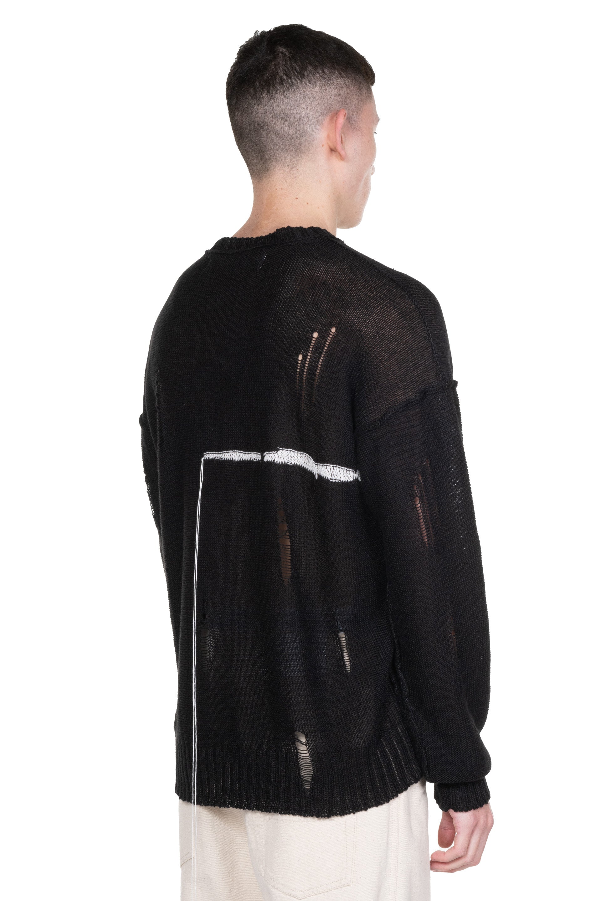 Long sleeves. Round neck. Distressed details throughout. Raw edges throughout. Signature thread details.