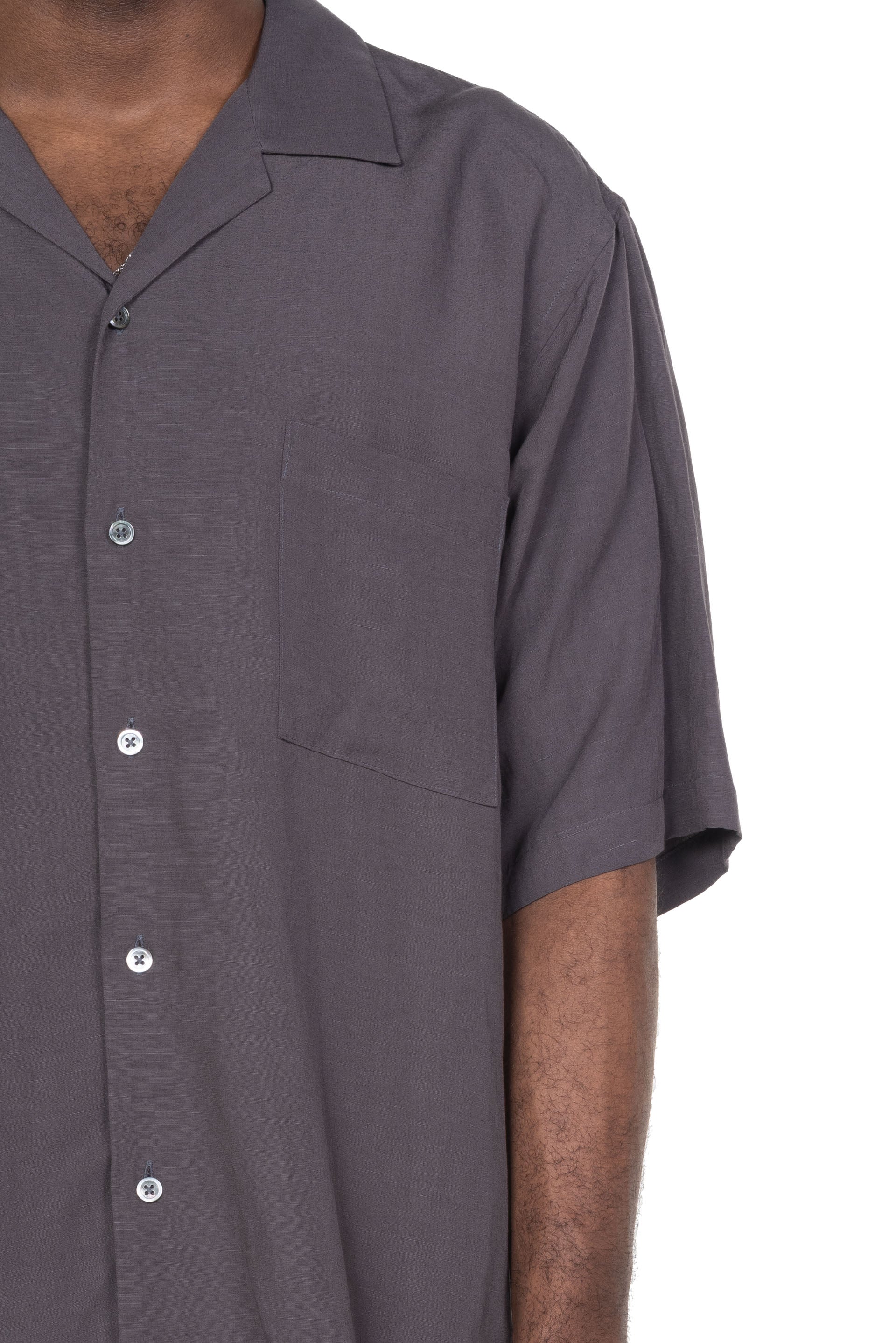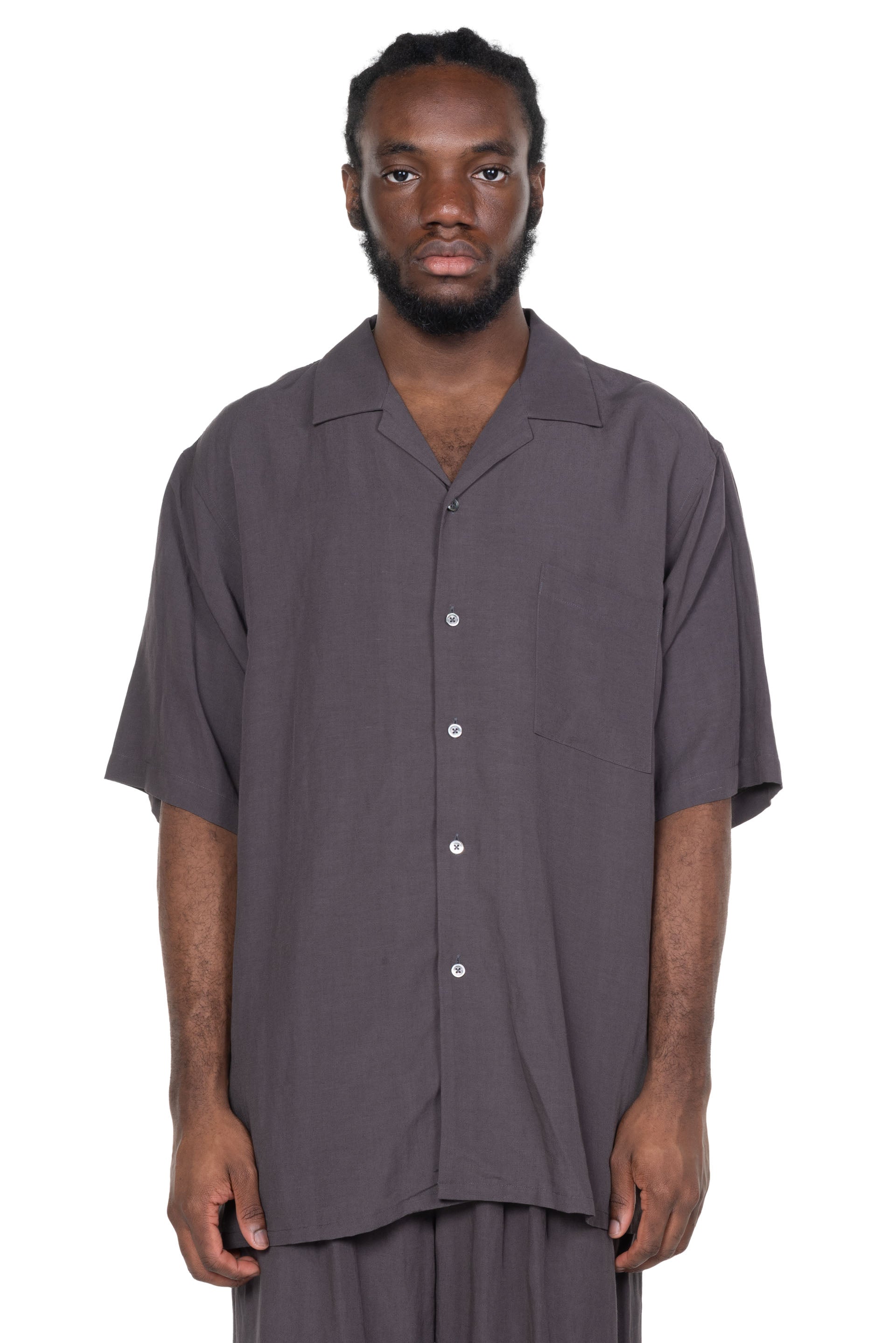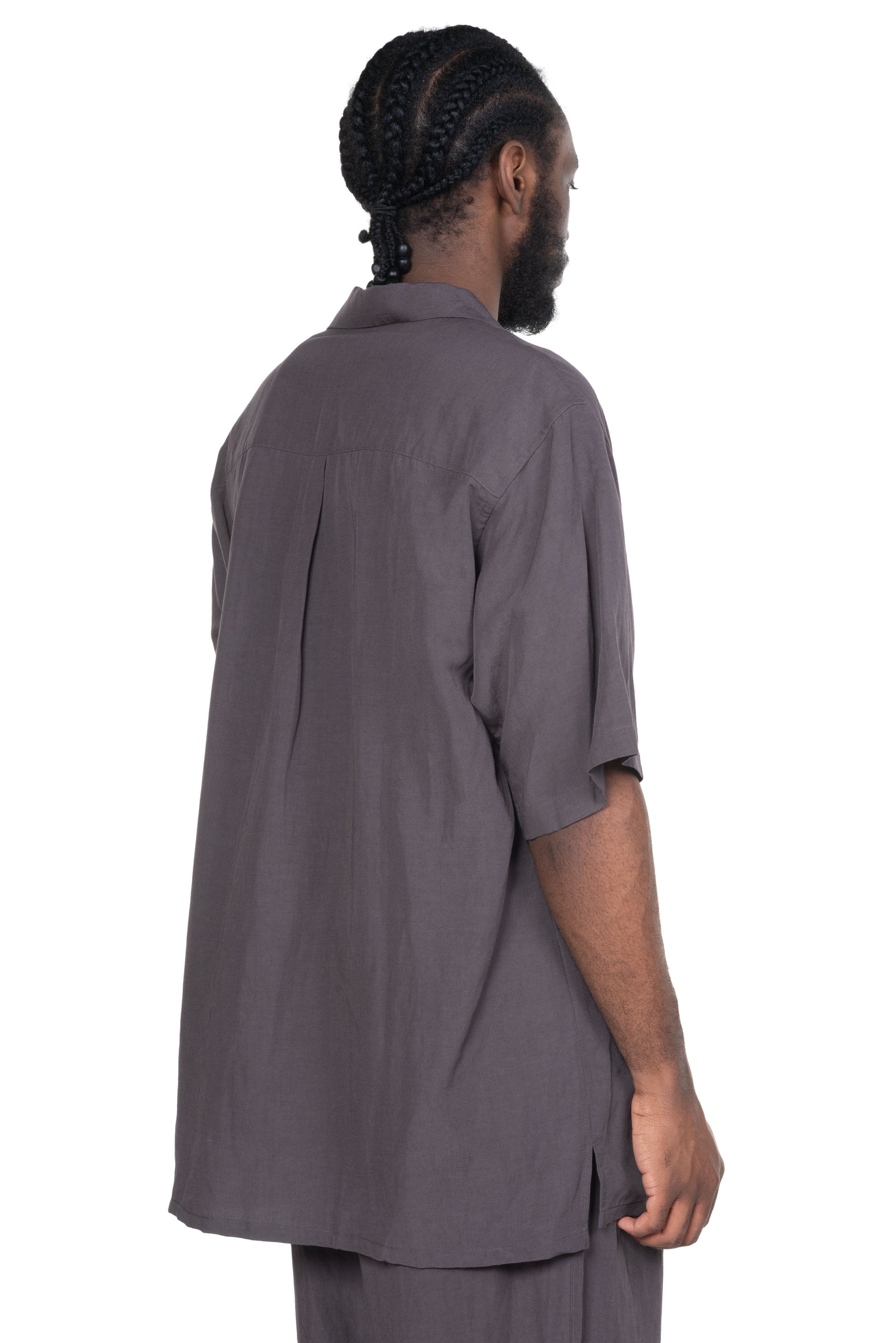 ssstein Rayon Linen Oversized Shirt in Charcoal. Short sleeves. Button closure at front. Slit at sides. Oversize fit. Pocket at chest.