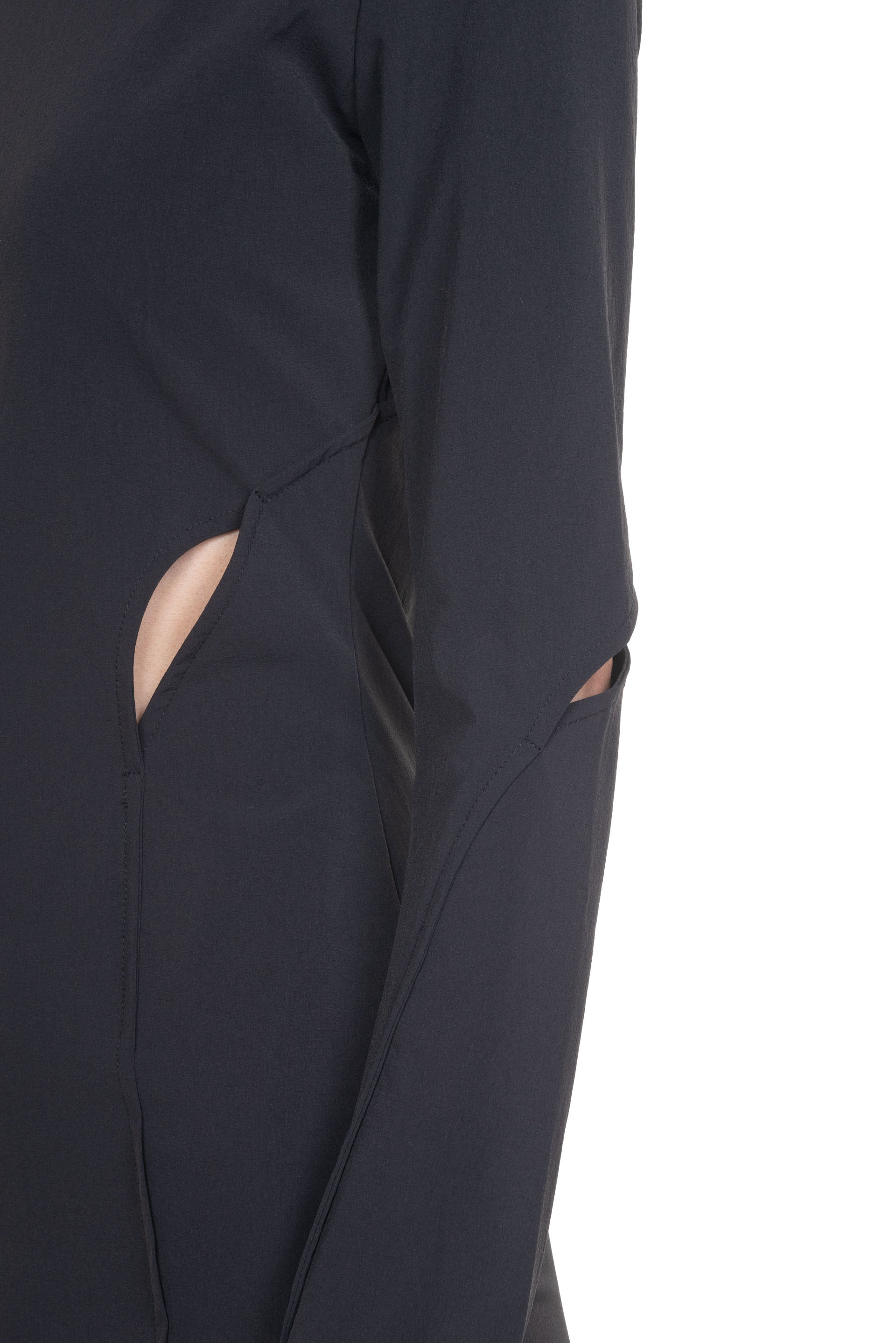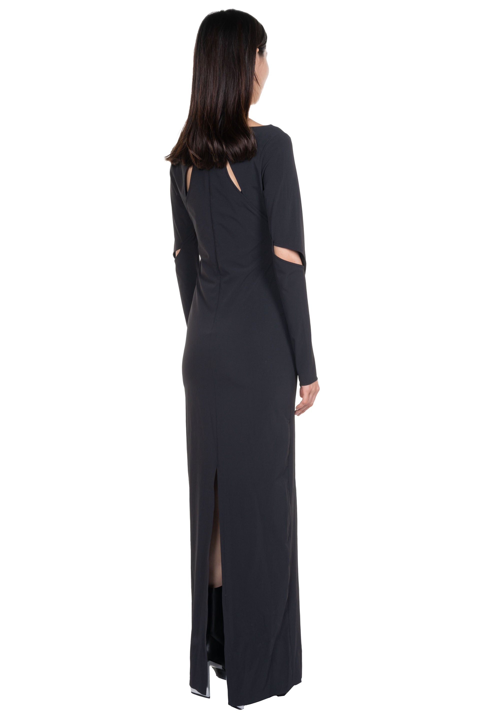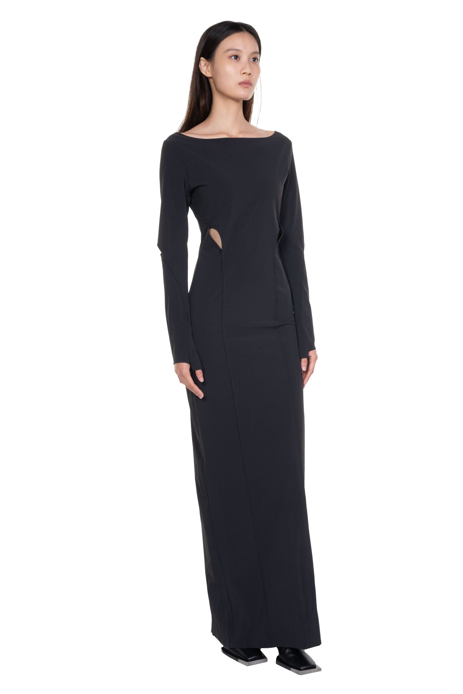 Black technical dress from Heliot Emil. Long sleeves. Wide neck. Slicing details throughout. Slit a back. Thumbhole details. Soft stretchable fabric.