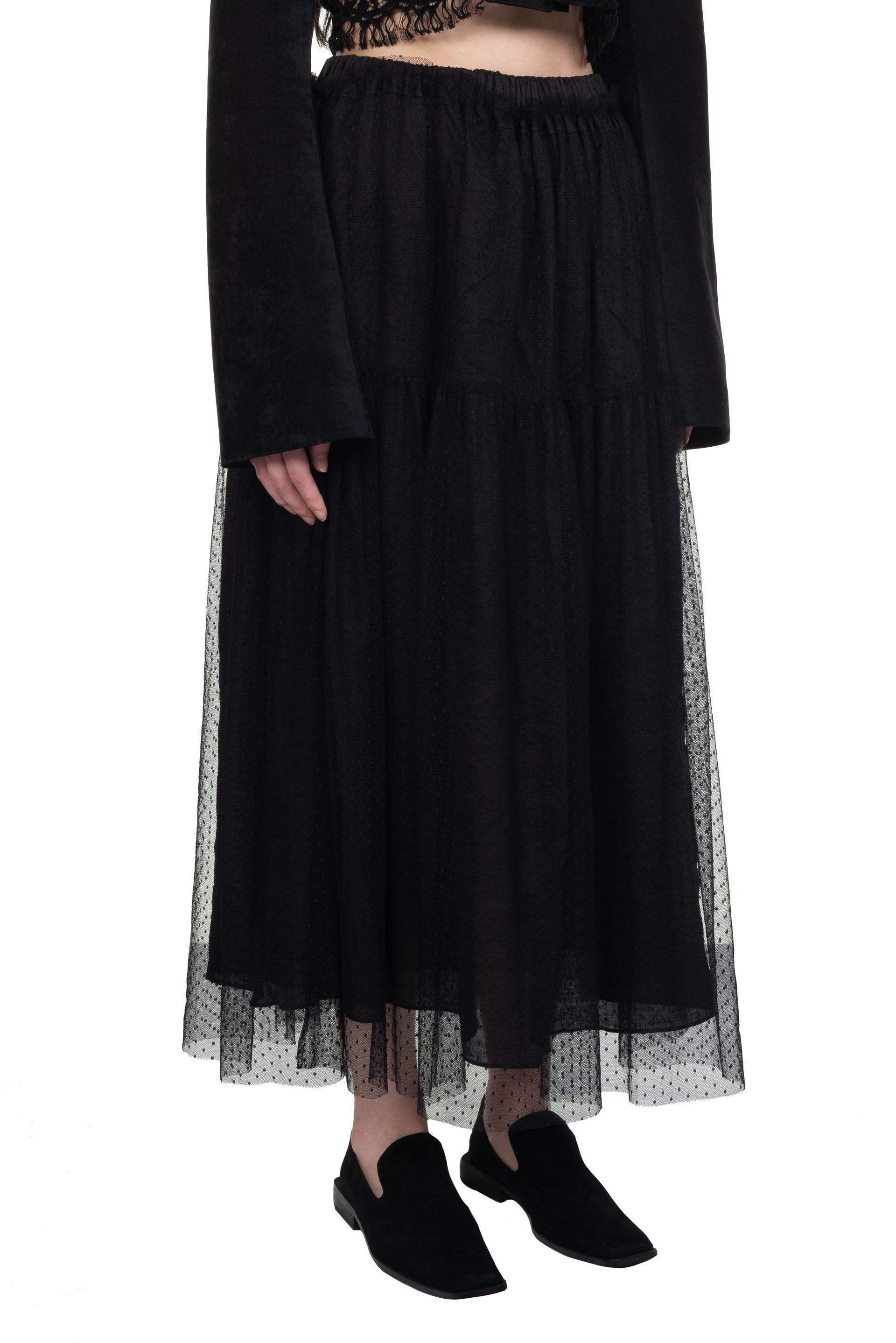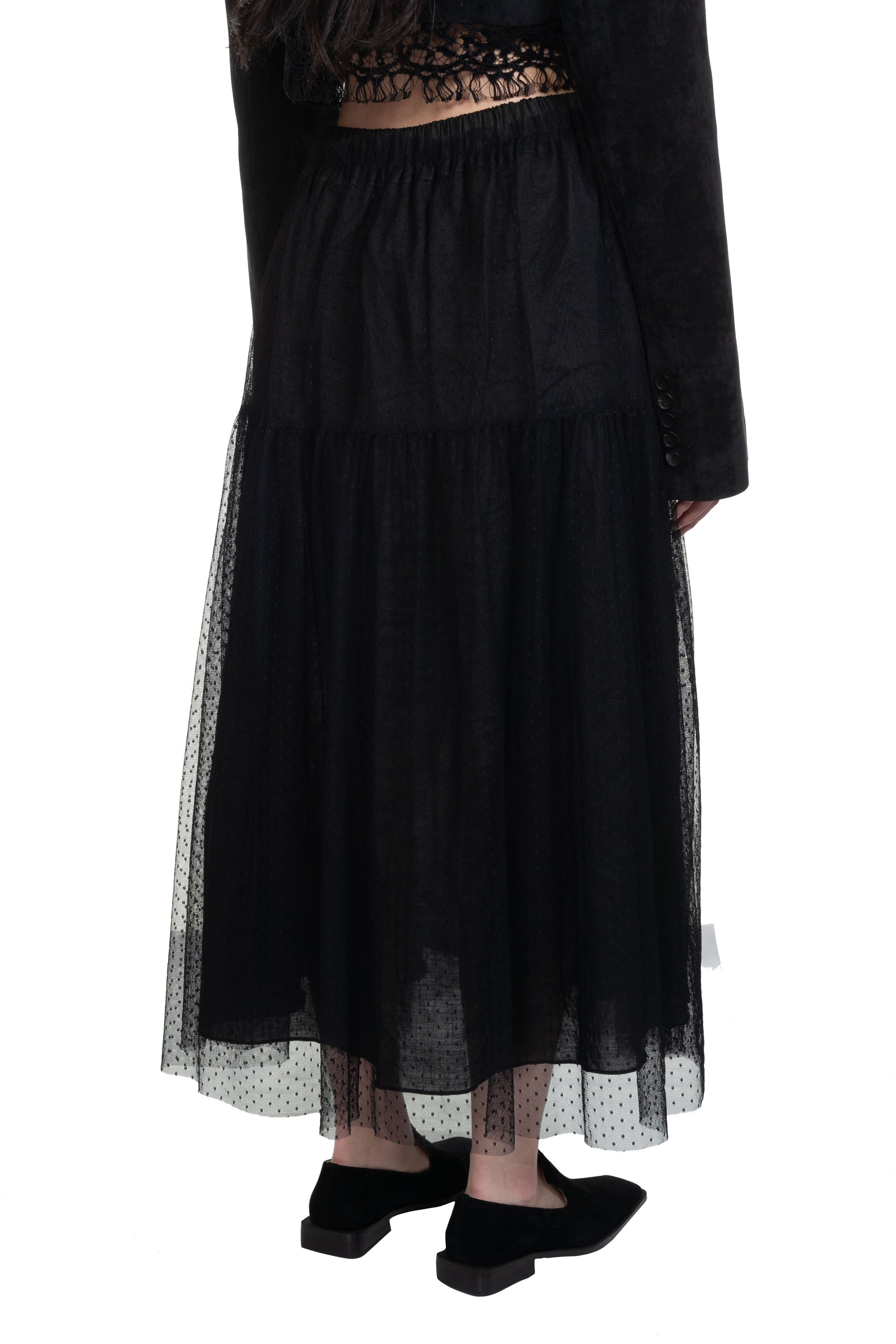 A Tentative Atelier aims to explore artistic handicraft elements and innovative forms and silhouettes on garments combining with neo-vintage effect. The label does not only focus on fashion, it is a platform to encourage and sustain the spirit and tradition in craftsmanship to create new form as seen with the Reversible Mesh Skirt.