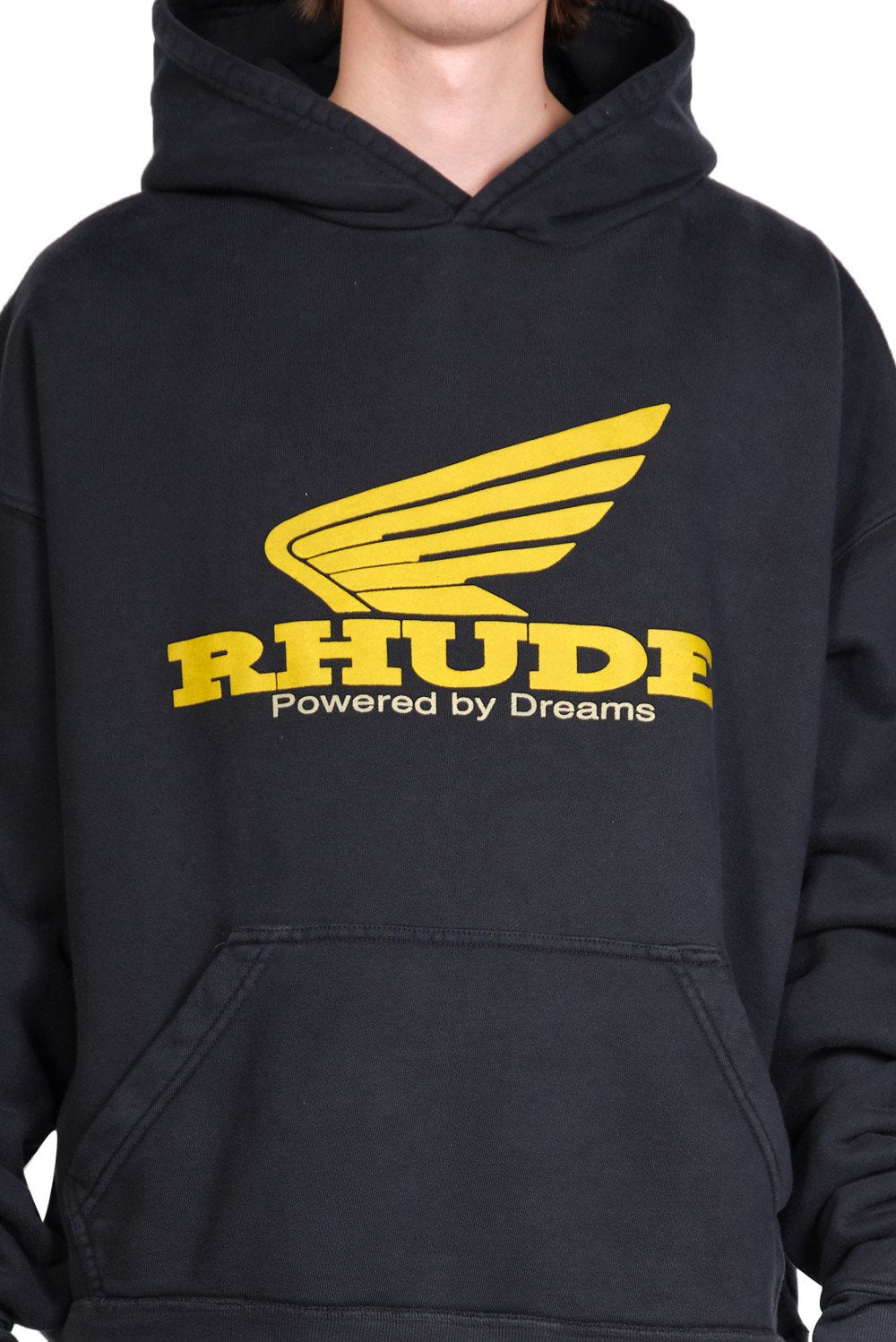 Rhude design merge disparate cultural influences, which combine streetwear style with British punk and high fashion sensibilities. With youthful energy, U.S. based production, and culture-clashed appeal, Rhude acts as a keen reflection of new inroads in men's fashion as seen in the Rhude Black Rhonda Hoodie.