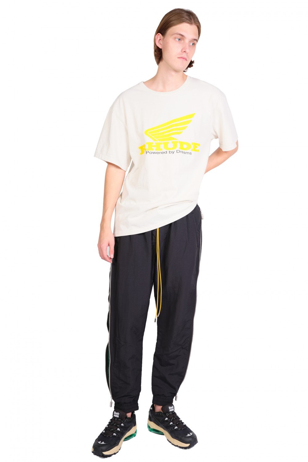Rhude design merge disparate cultural influences, which combine streetwear style with British punk and high fashion sensibilities. With youthful energy, U.S. based production, and culture-clashed appeal, Rhude acts as a keen reflection of new inroads in men's fashion as seen in the Rhude White Rhonda T-Shirt.