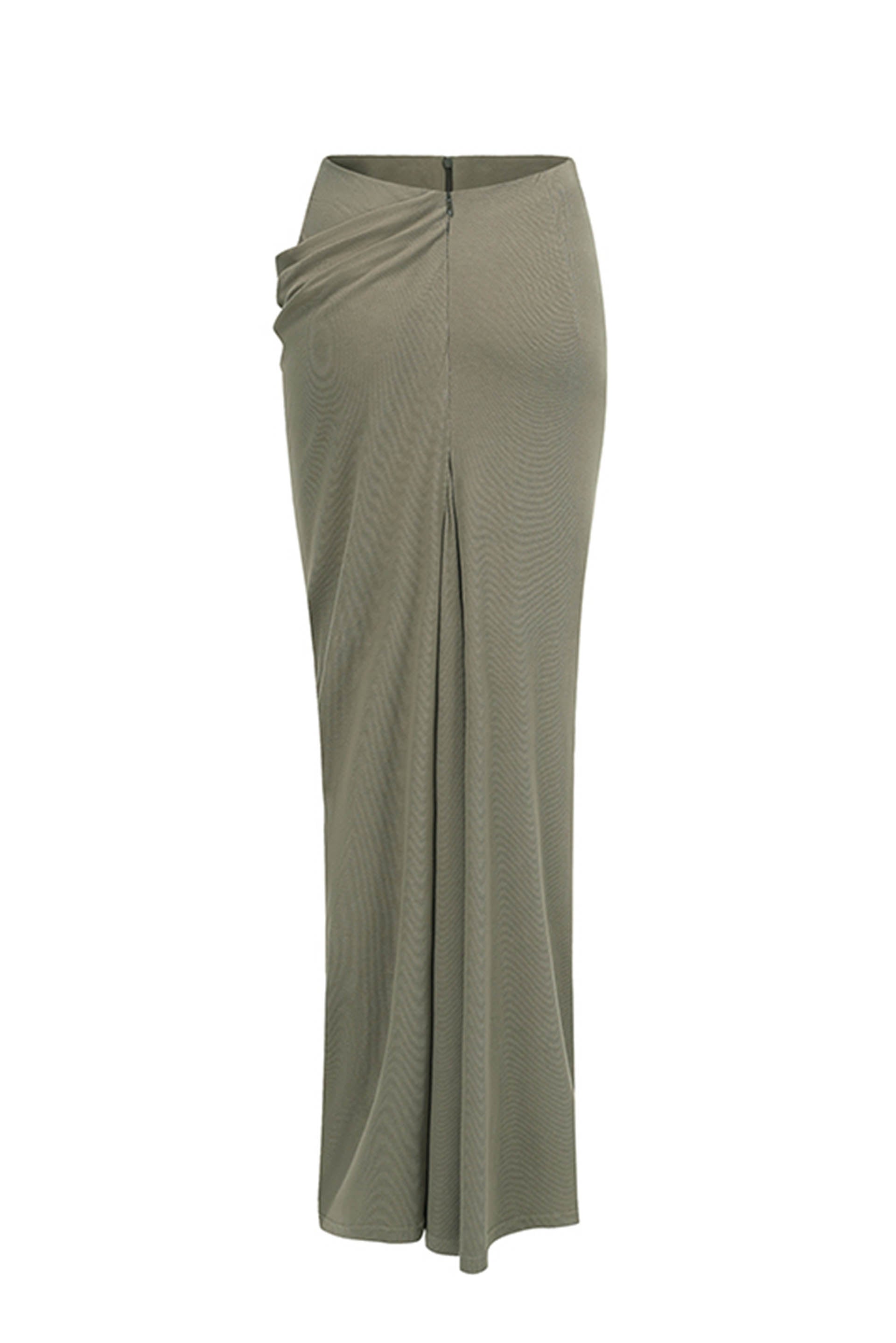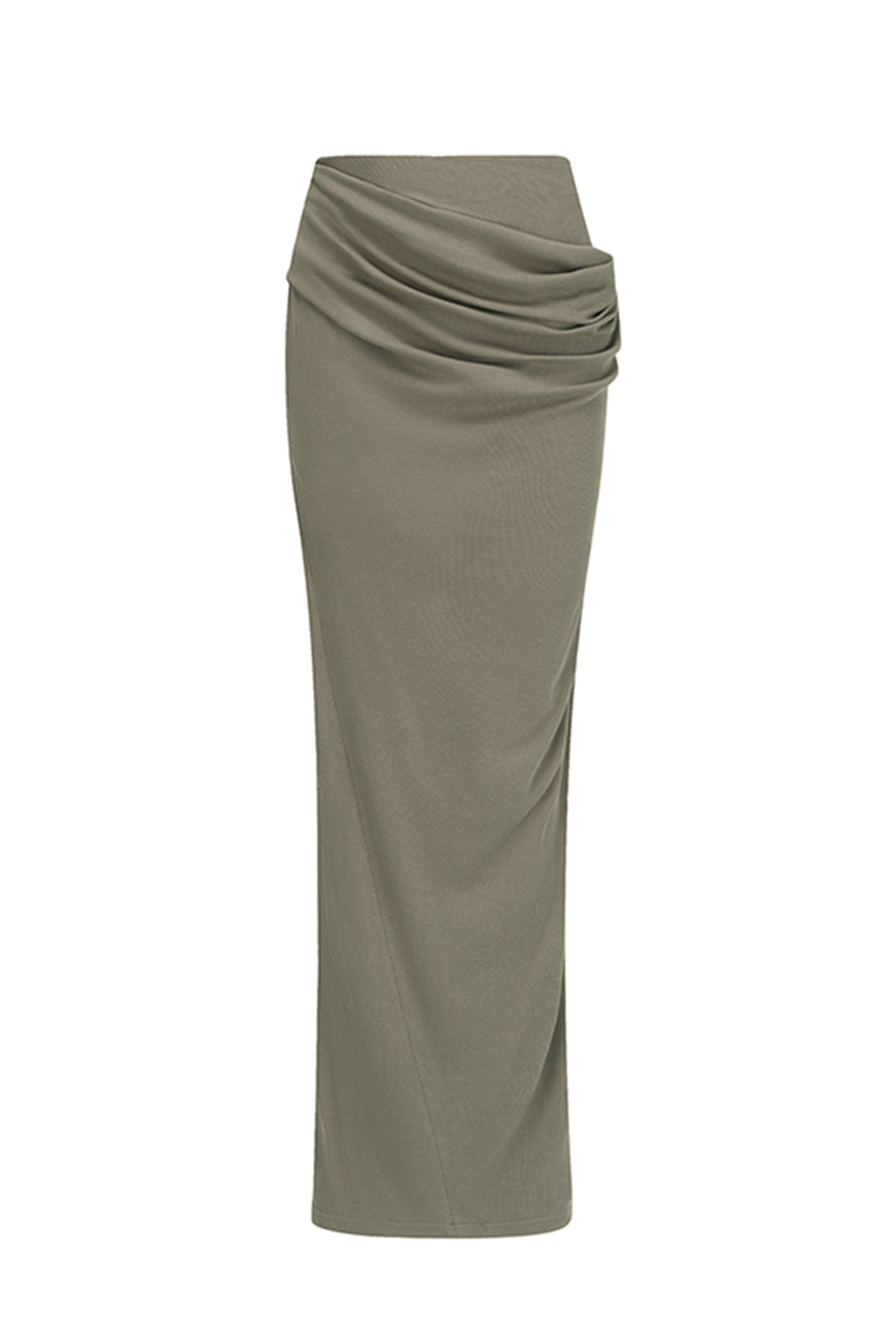 Rib skirt in Green. Draped. Slit at back. Soft and light fabric.