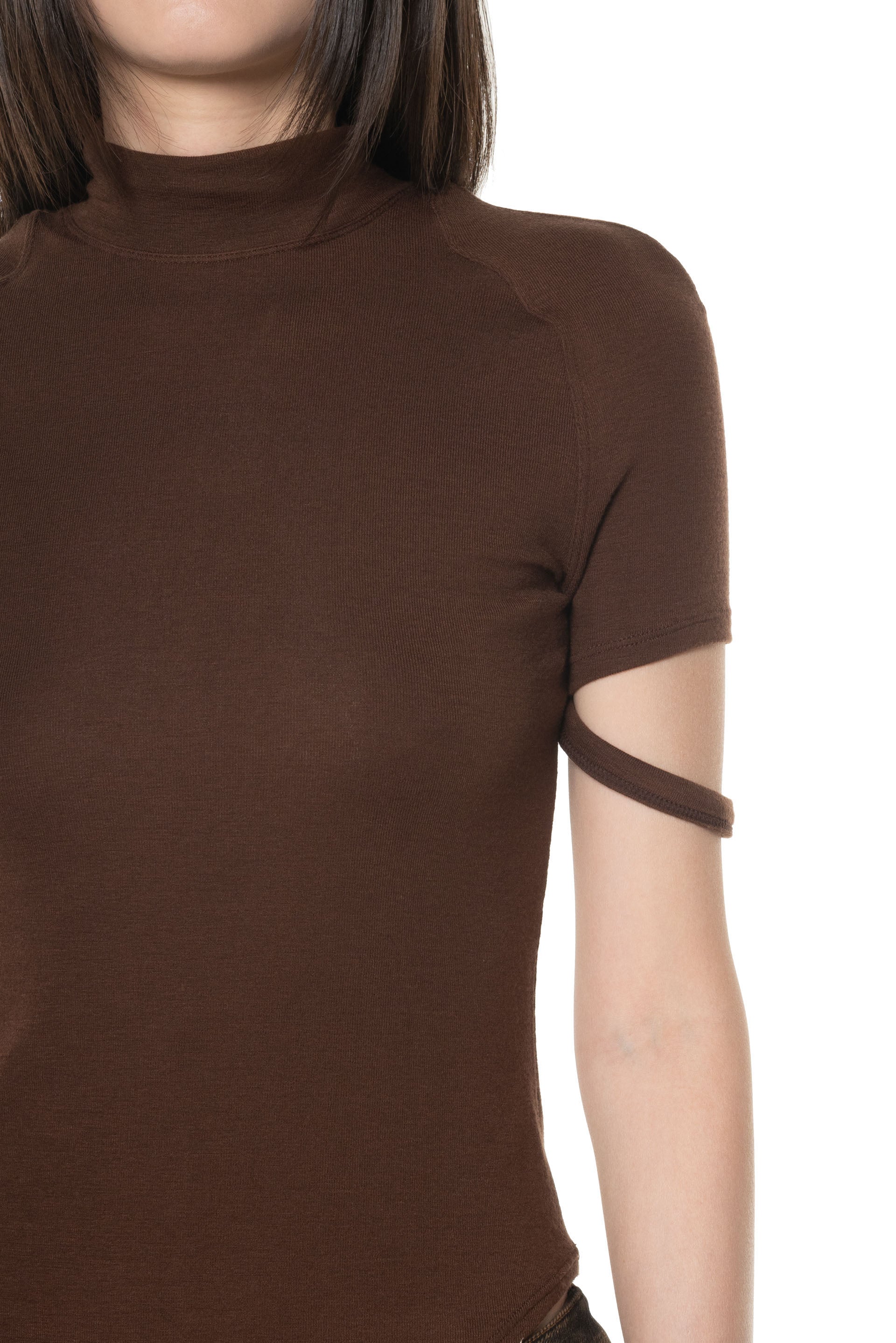 OUDE WAAG strikes a balance between Asian aesthetics and Western cutting. It is at the heart of designer’s philosophy: celebrating the power of women, yet simultaneously critiquing the ongoing objectification and idealisation of the body as you can see in the Oude Waag AW25 collection with the Ribbed Jersey Mock Neck T-Shirt Reddish Brown.