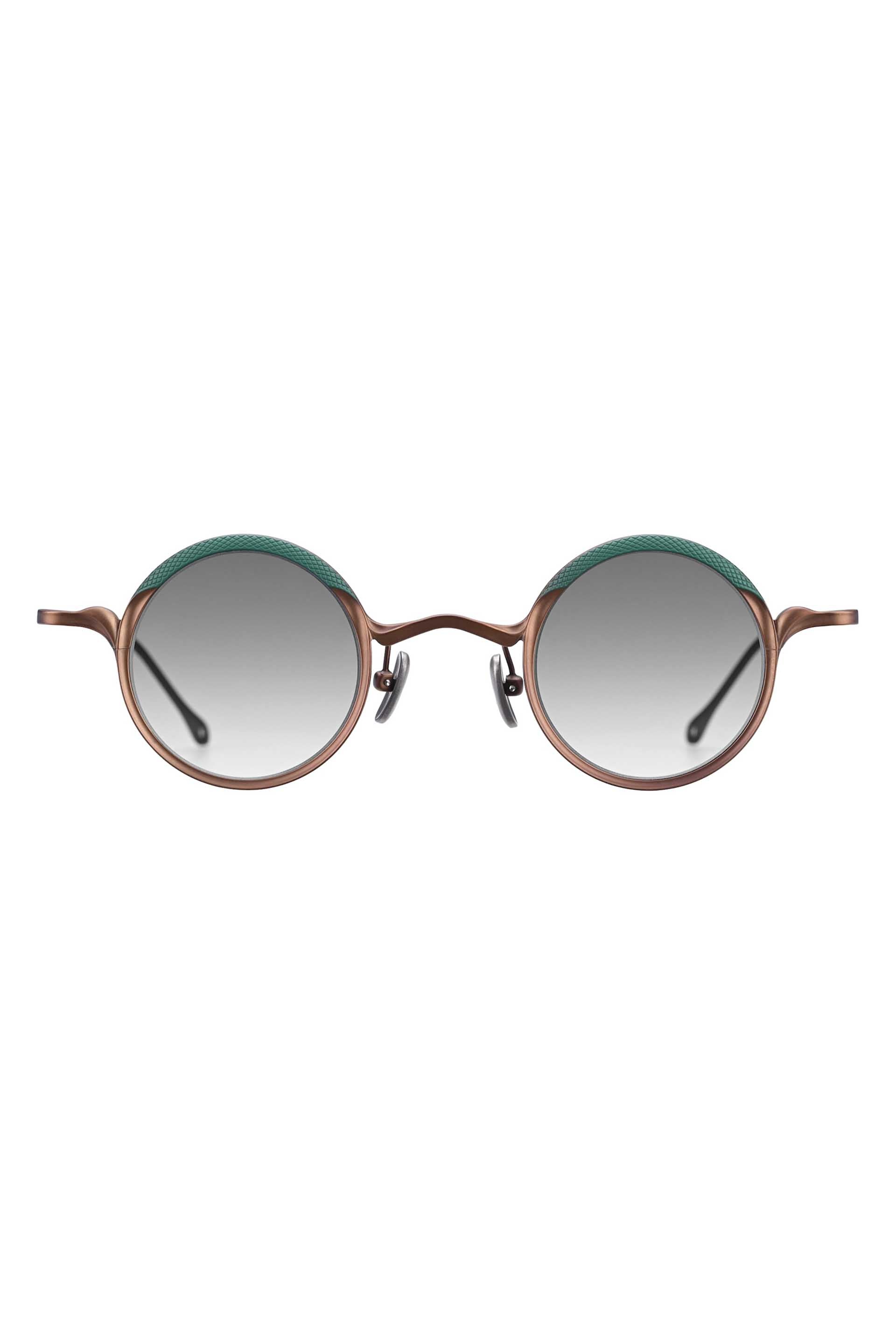 The Rigards - RG1199CU in Red Copper Semi Polished Accents is a frame made of copper and titanium with grey gradient lenses 100% UV protect. The frame is available in one size: 39 - 29 - 140 and is handmade in Hong Kong. Crafted from pure titanium, the frame's curved rounded rims feature a subtle scale pattern that taps into a fascination with serpents and dragons.