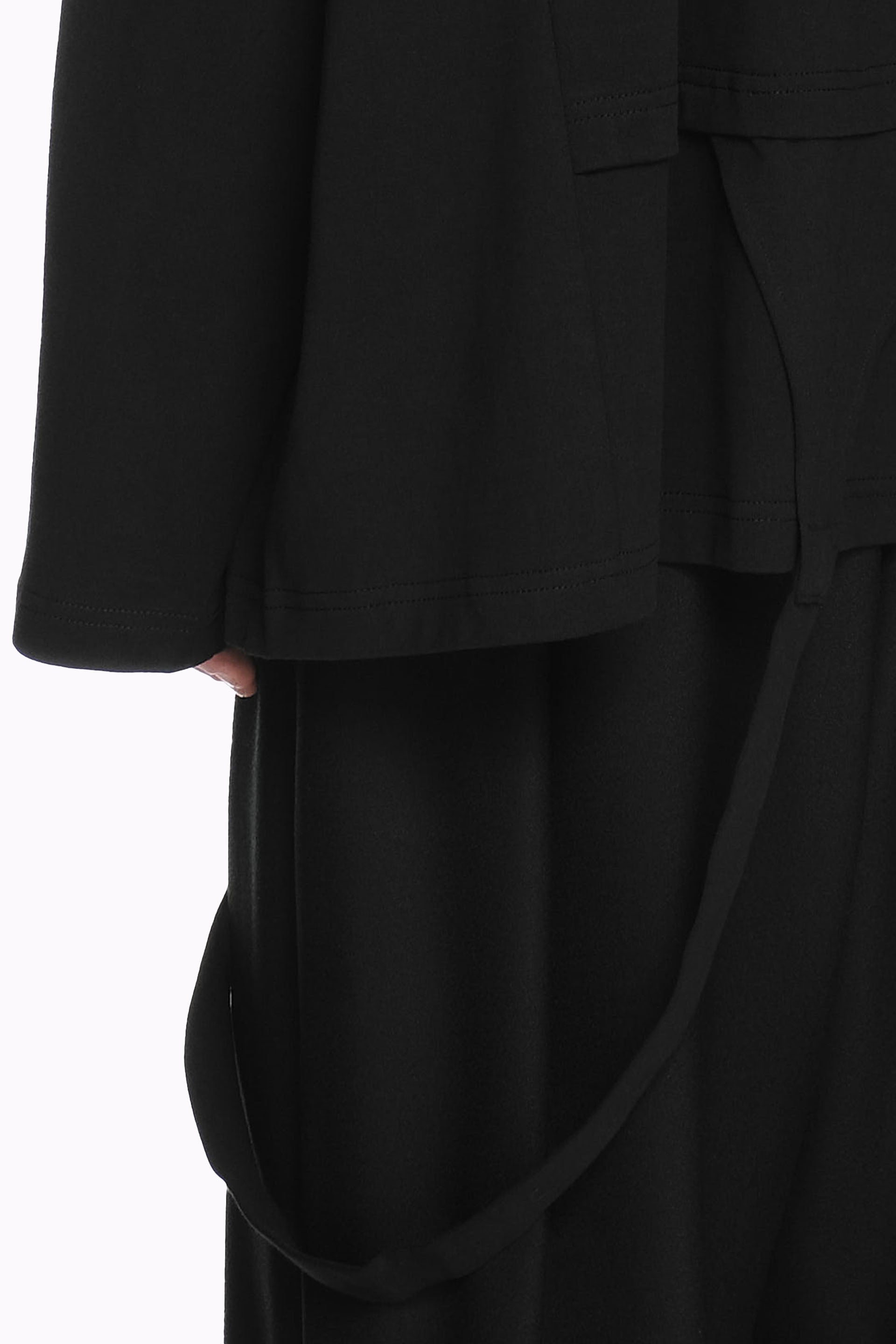 Long sleeves. Double layered. Boxy fit. String detail at bottom with belt closure.