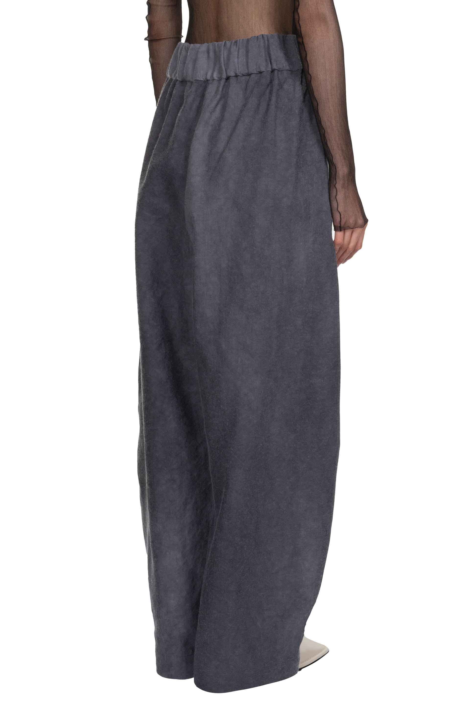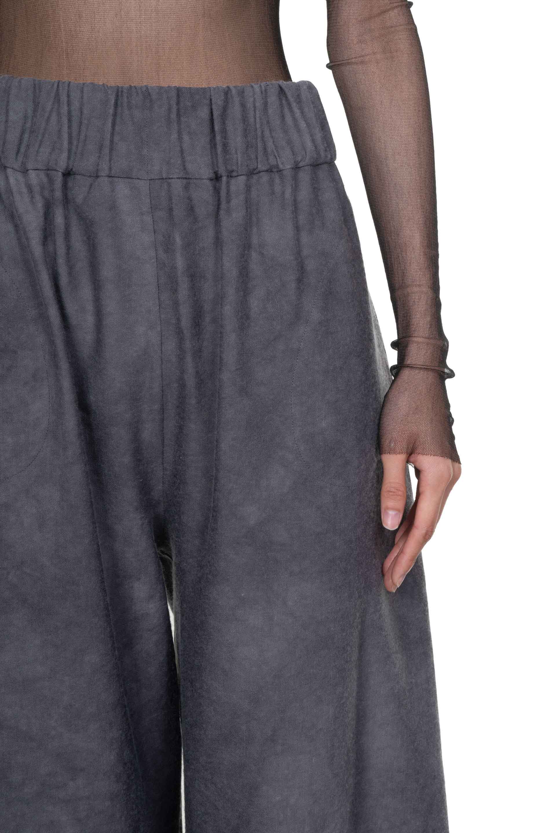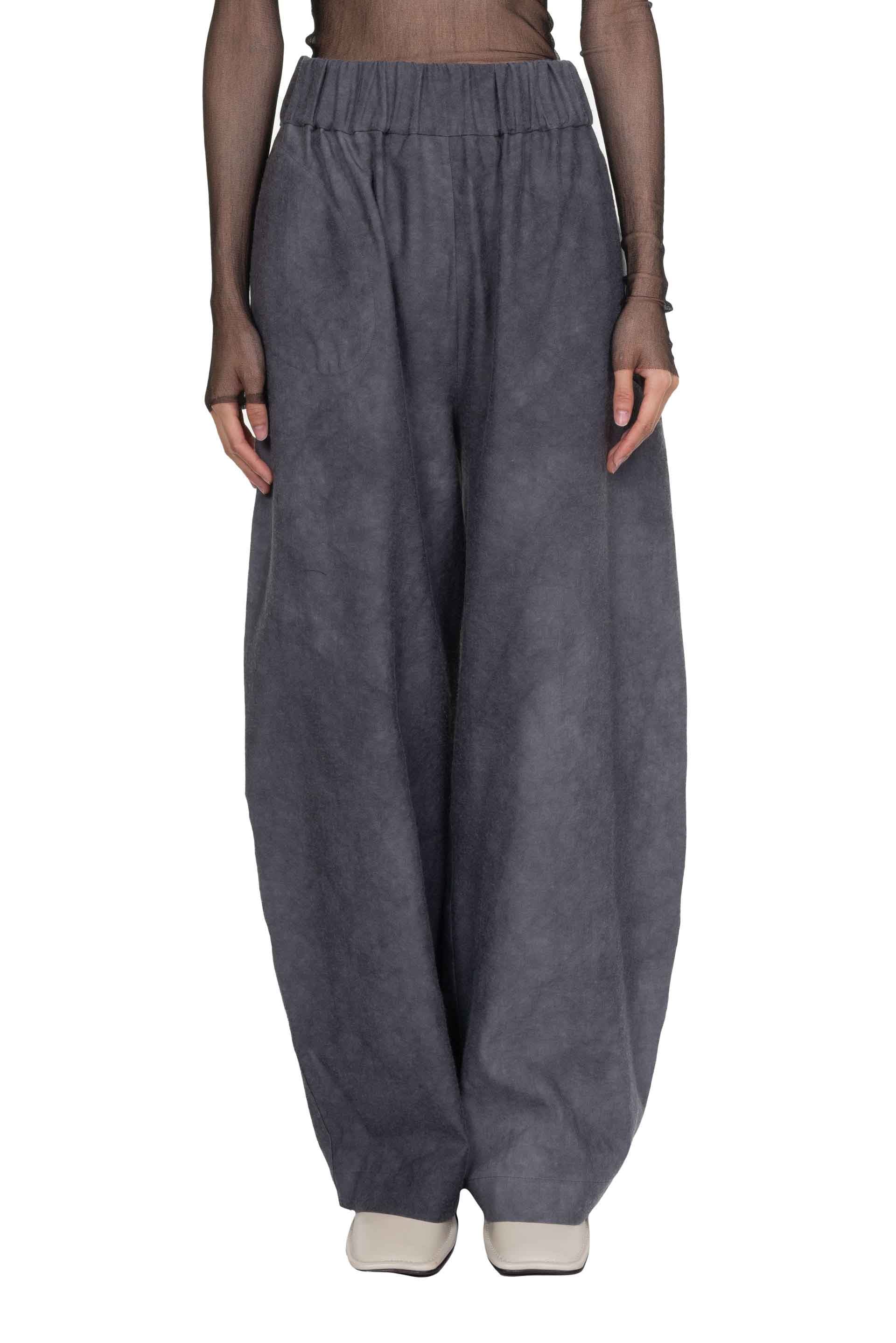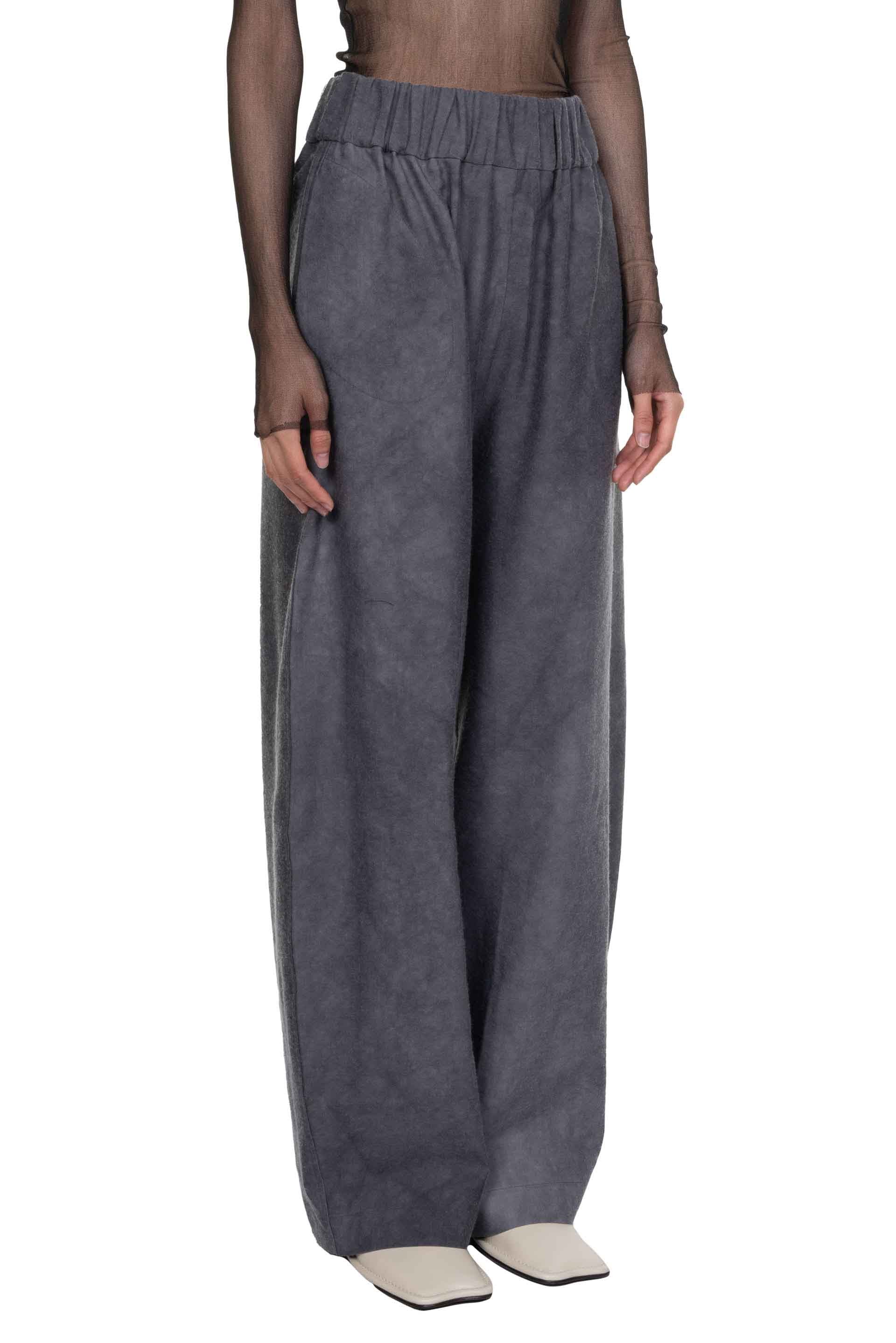 Unisex wide-leg pants made from a fabric that combines linen and virgin wool, with an elastic waist and slightly curved leg.