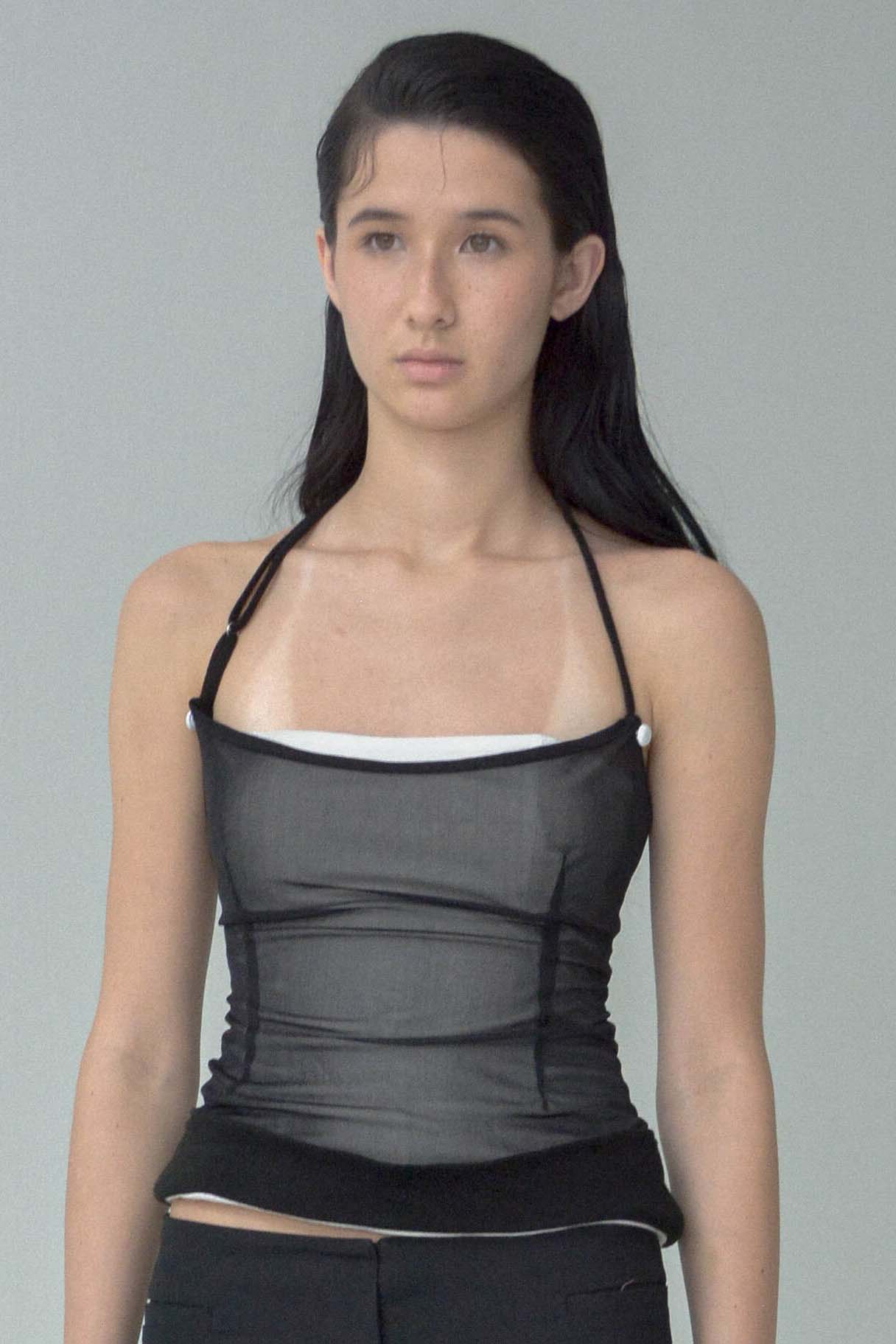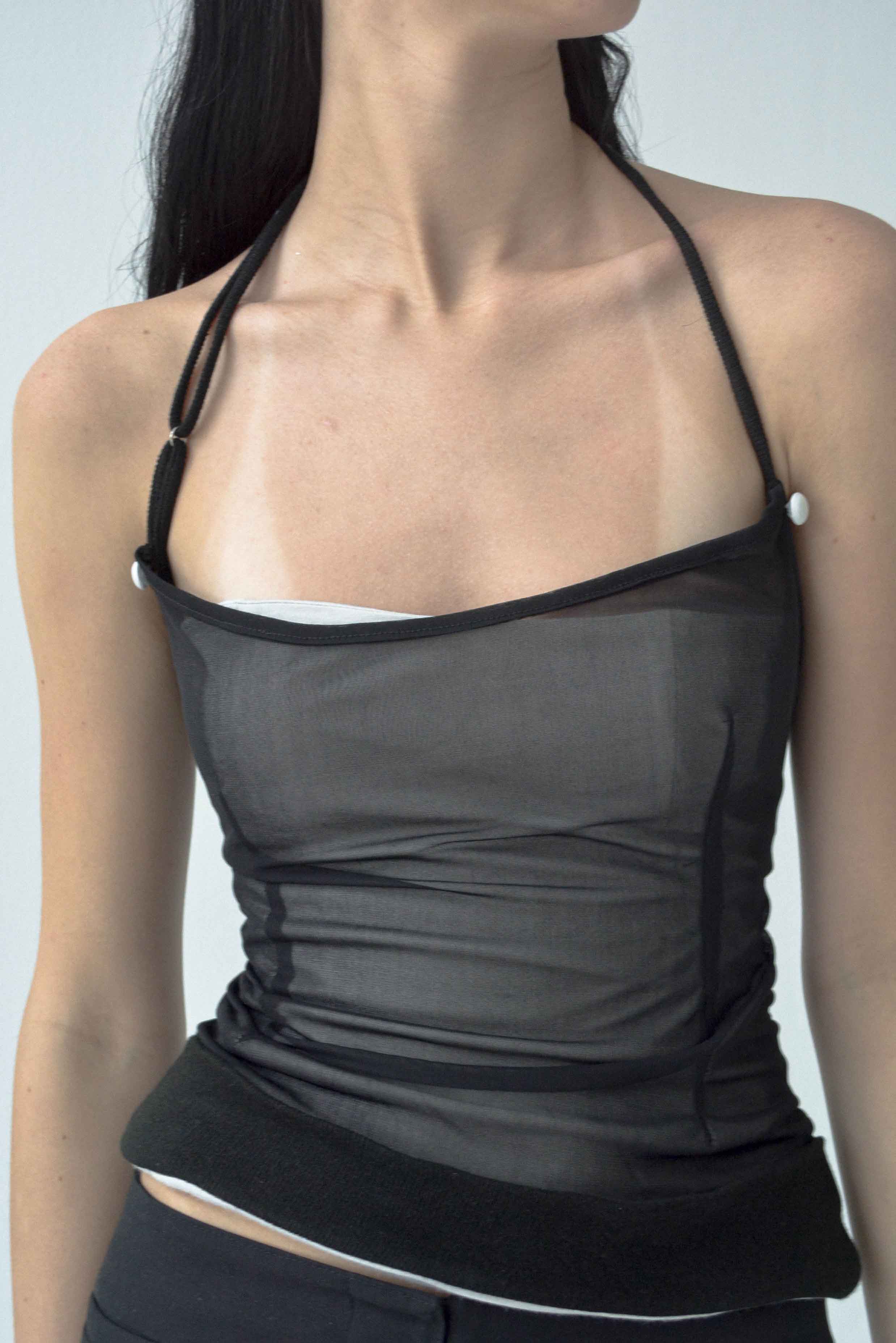 The Roth is a halter top with black tulle and light grey knitted lining in minimalist cutting. Length: 40cm for XS,S - 42cm for M,L. Tight fitted