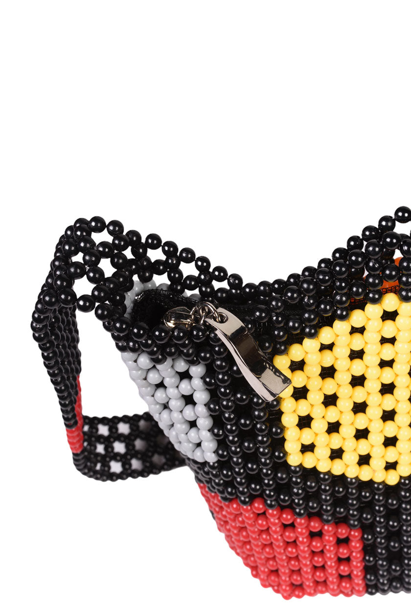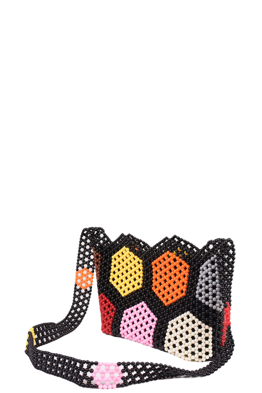 Beaded cross body travel bag. Composition 100% made from reusable plastic. Multicolour Circular logo front decorated with tasteful shimmer. 26 inch Adjustable shoulder strap. Zip with pocket compartments. Recycled waterproof lining.