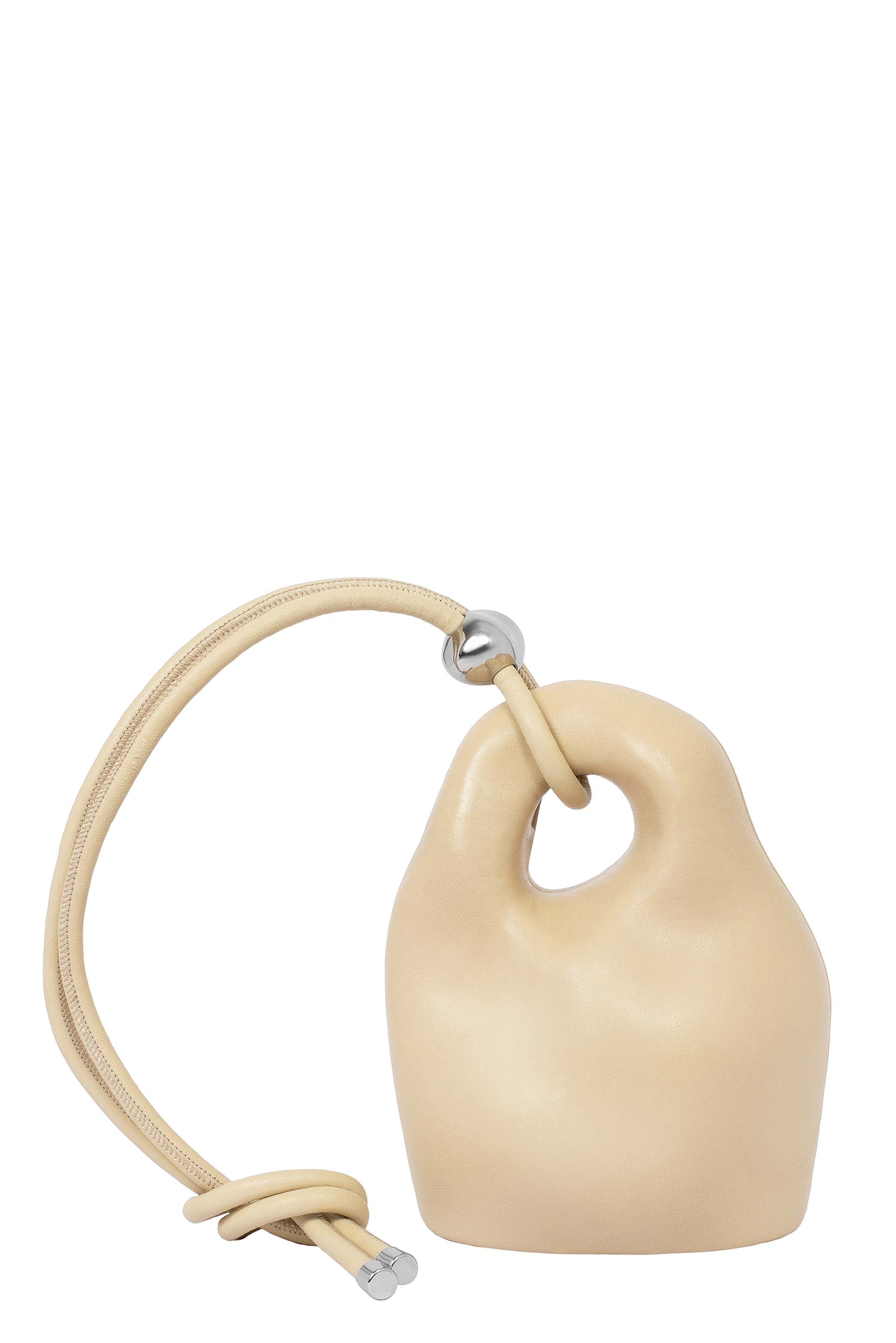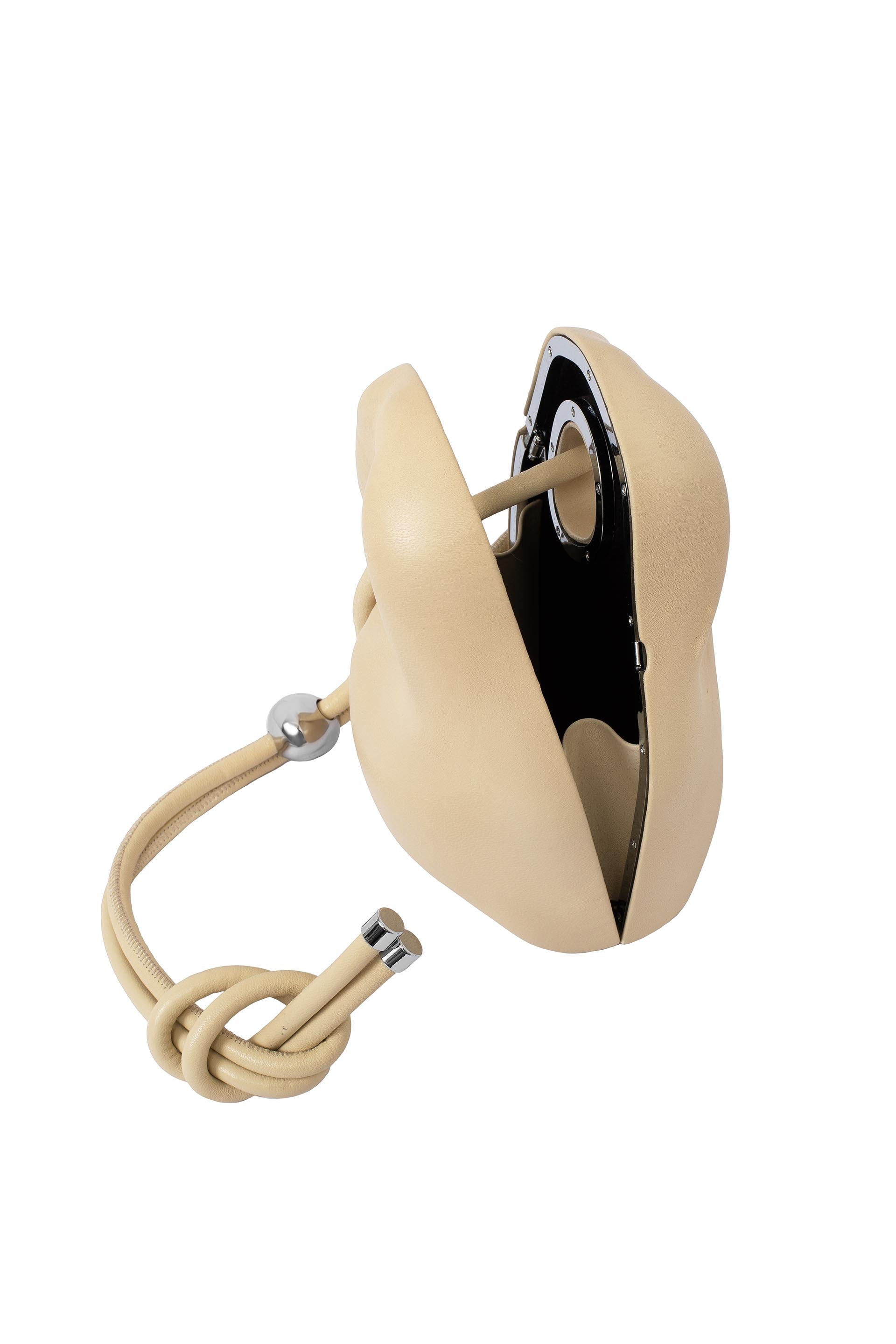 Stone shaped bag with adjustable double rope connector made out of Nappa leather. Soft flock finishing inside.