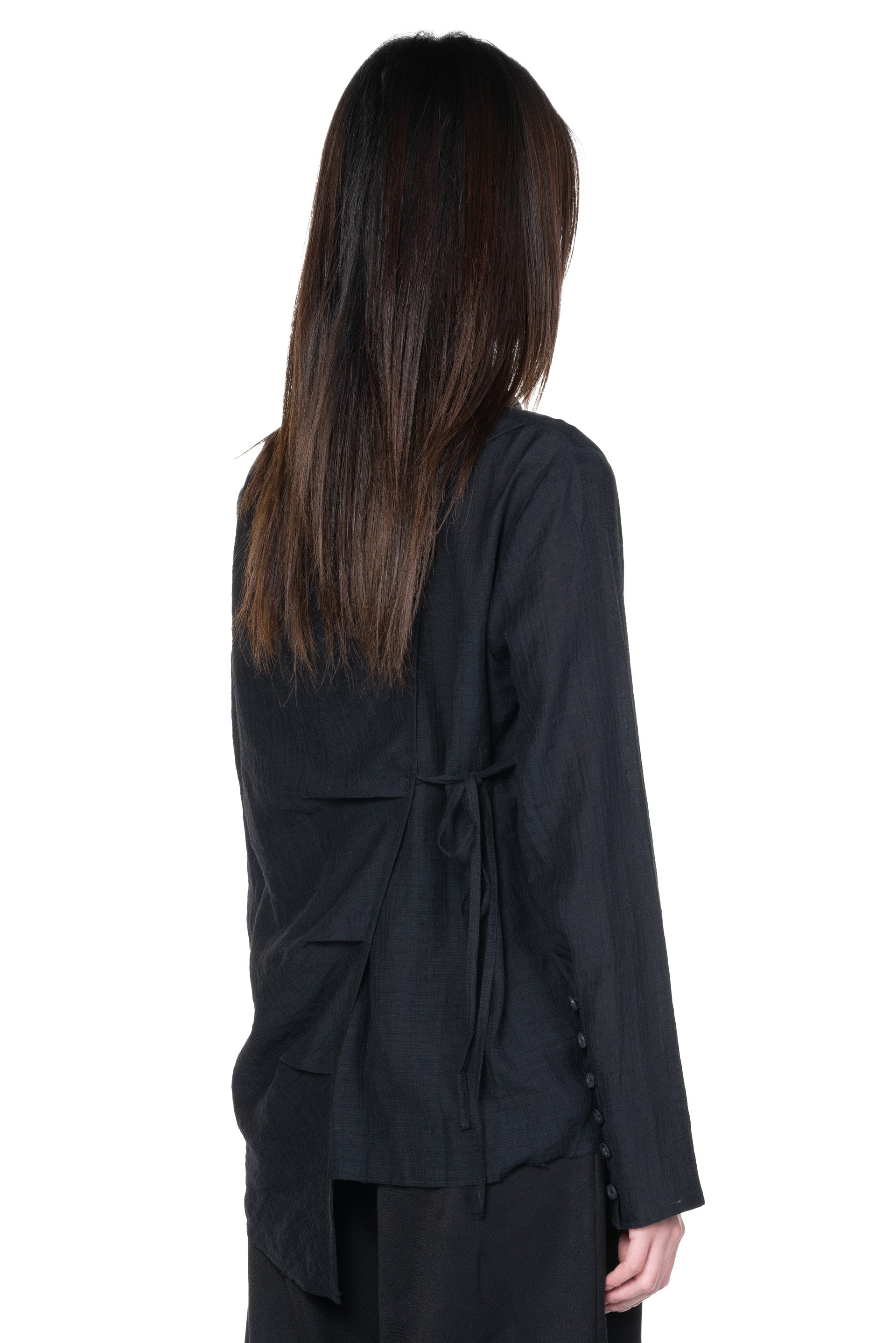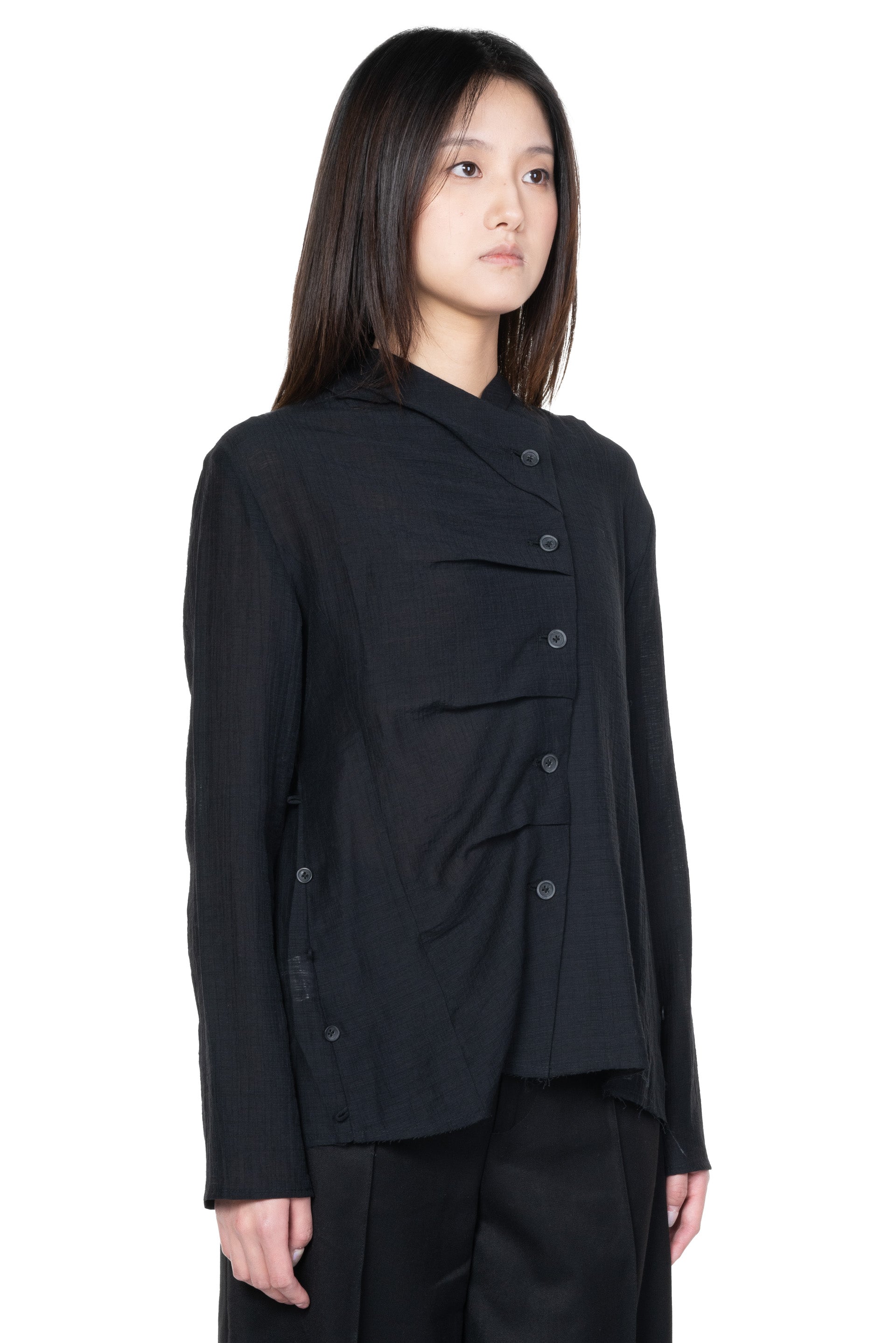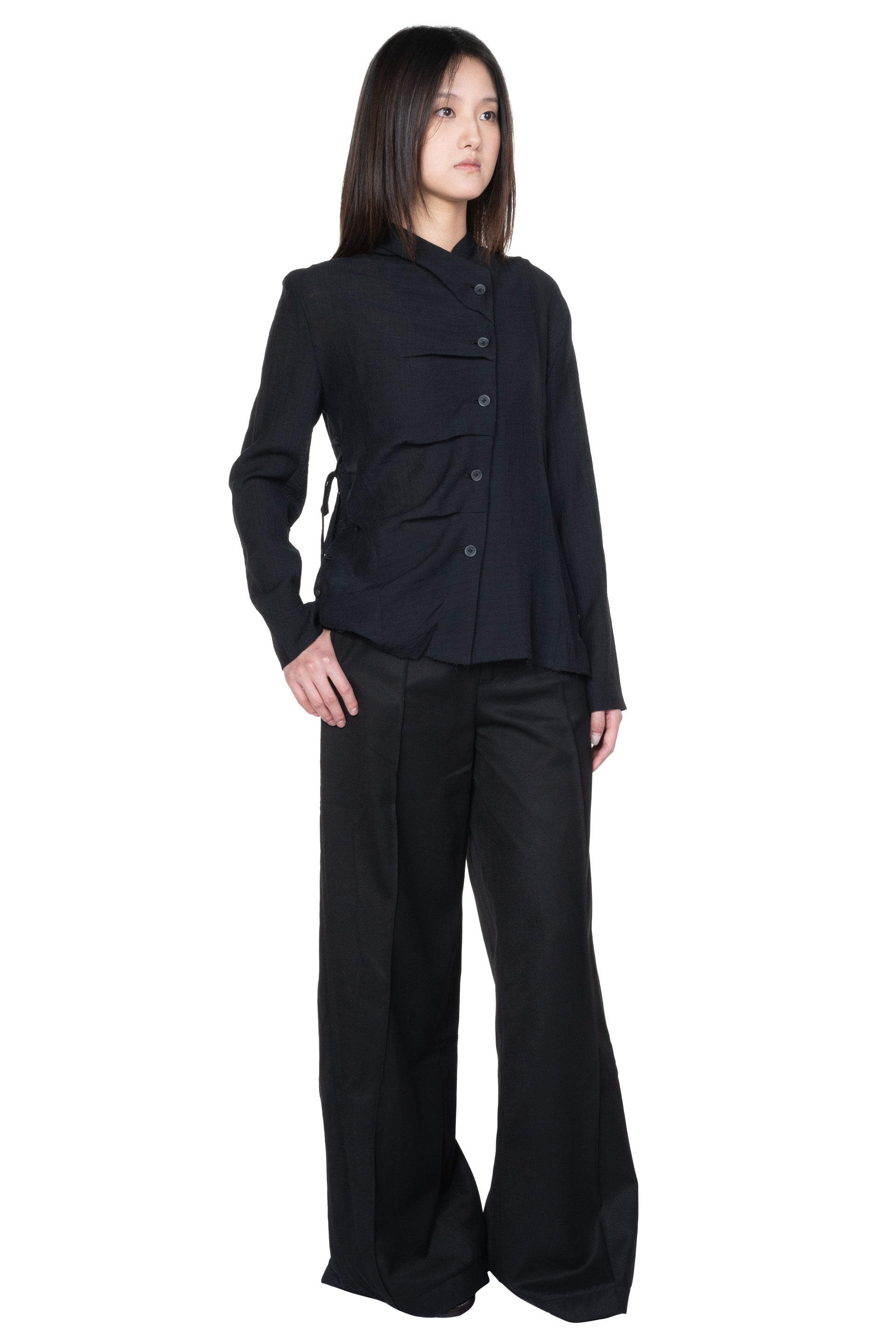 Professor. E Ruffled Shirt Black. Long sleeves. Button closure at front. Pleat details at front. Button at cuffs. Drawstring details at back.