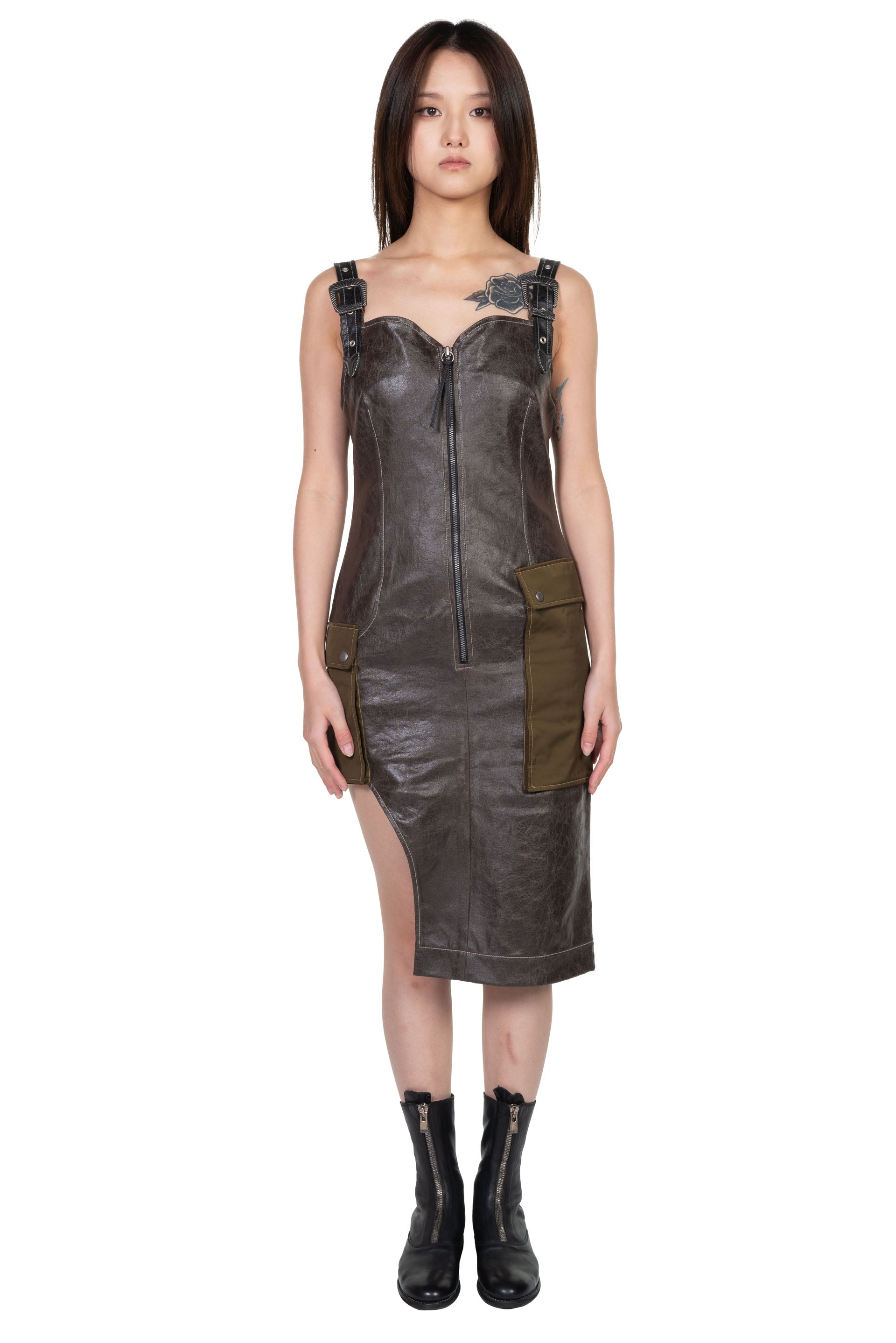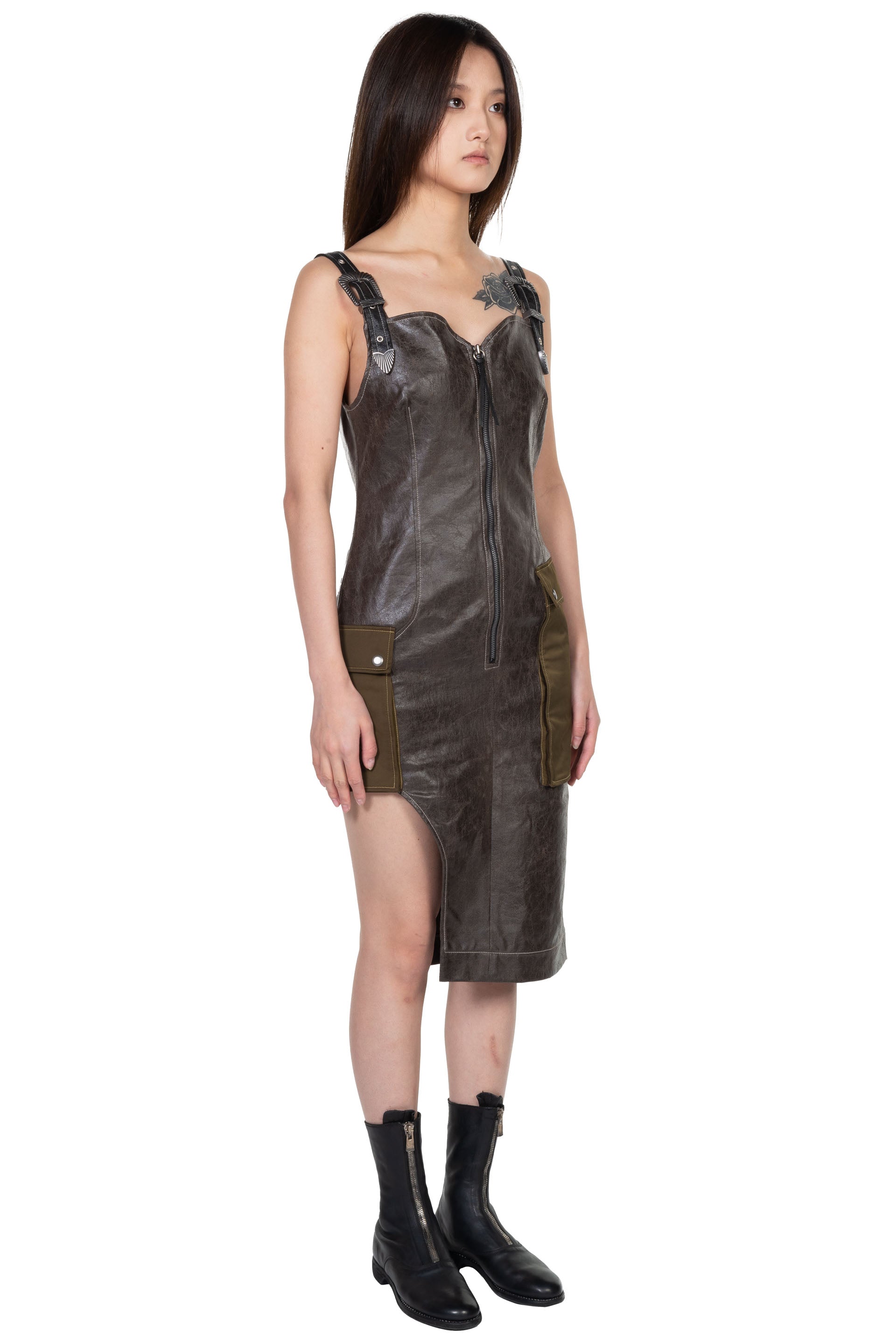 Western shoulder belted faux leather dress. Feminine bustier line. Asymmetric pockets. Cut out detail.