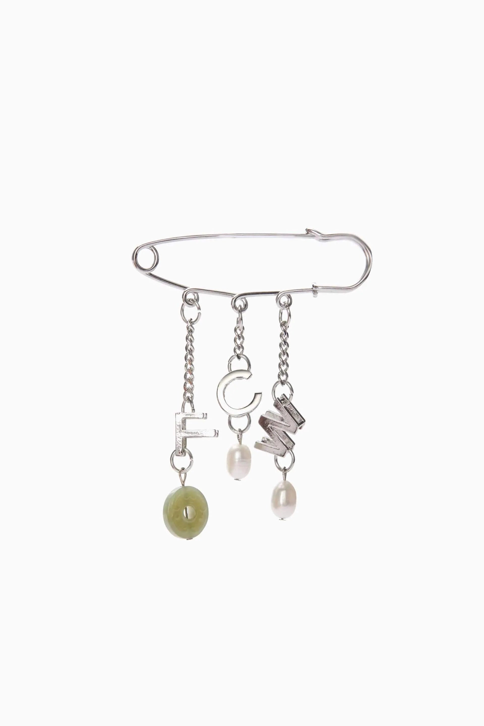 Feng Chen Wang safety pin broach with jade stones and logo letters in silver finish.