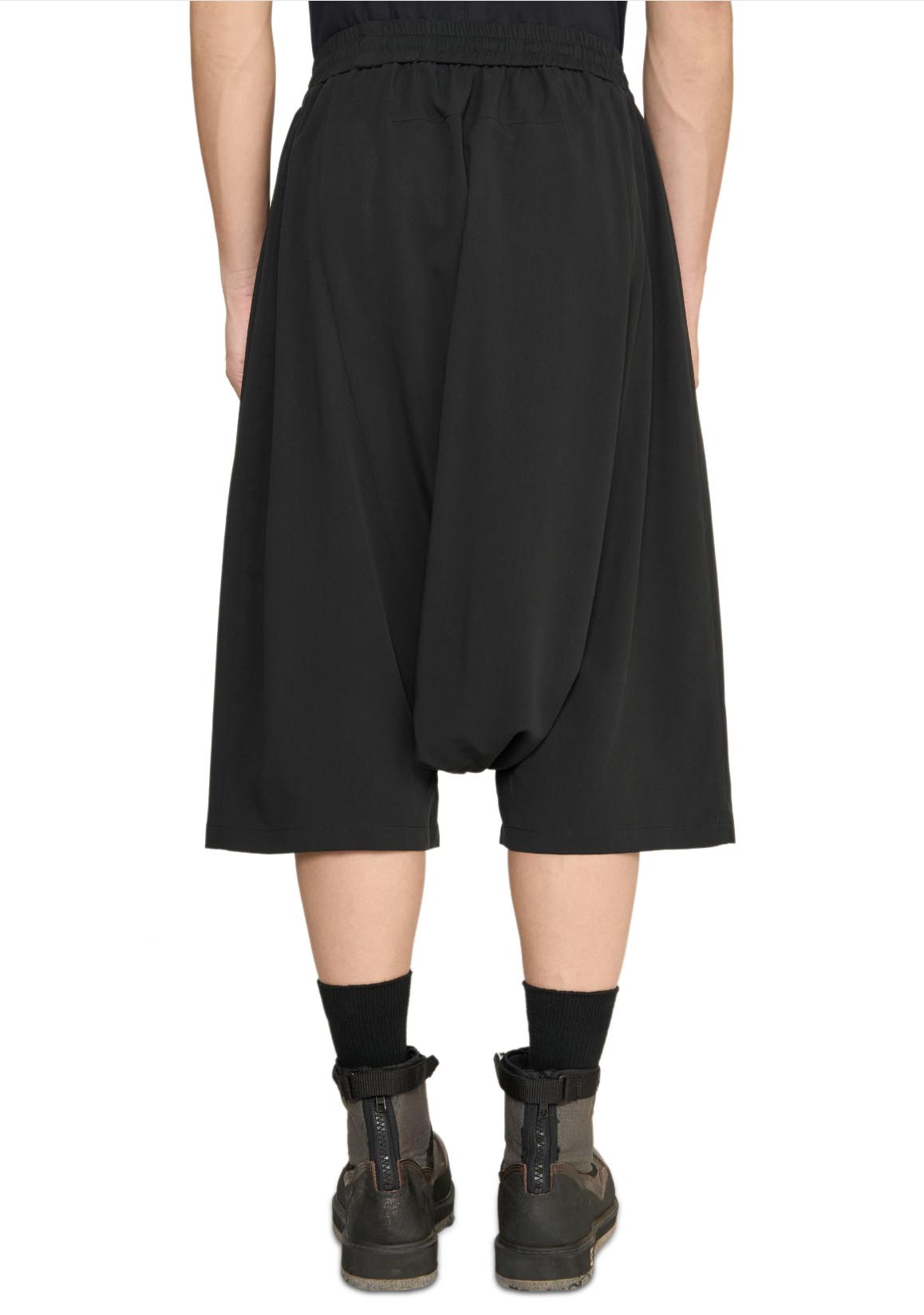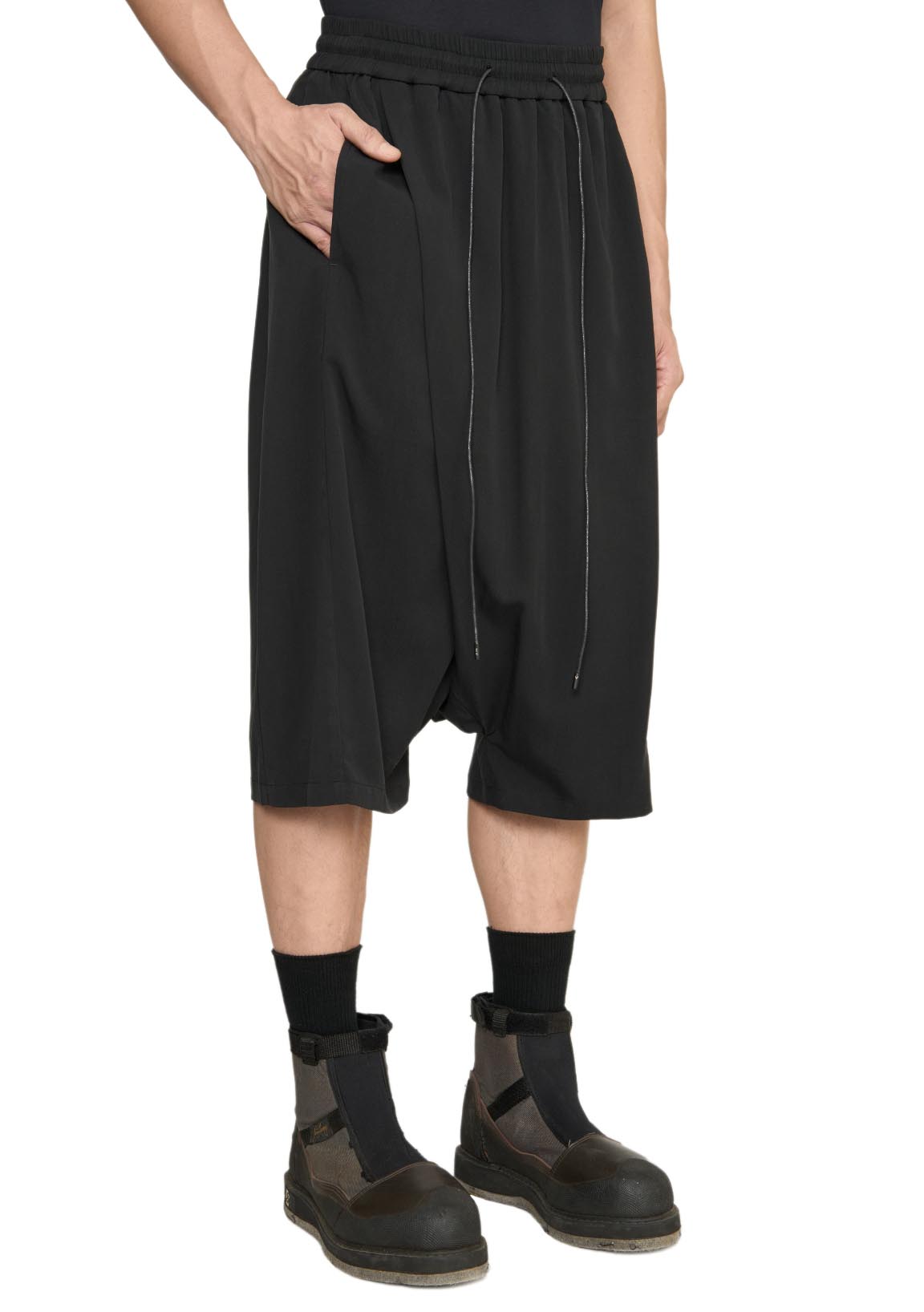 Elastic waist. Two side pockets. Low crotch. Drawstring at waist. Asymmetric details at front.