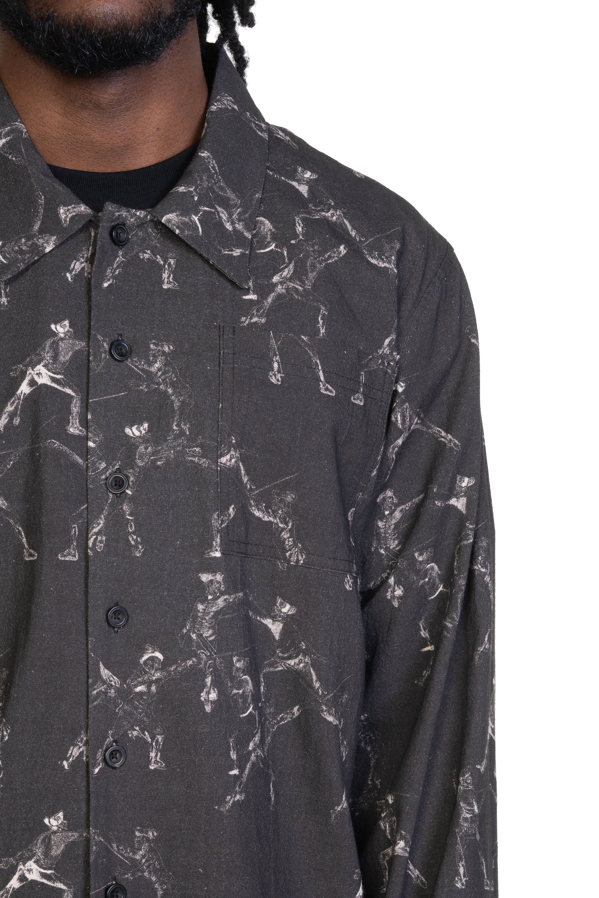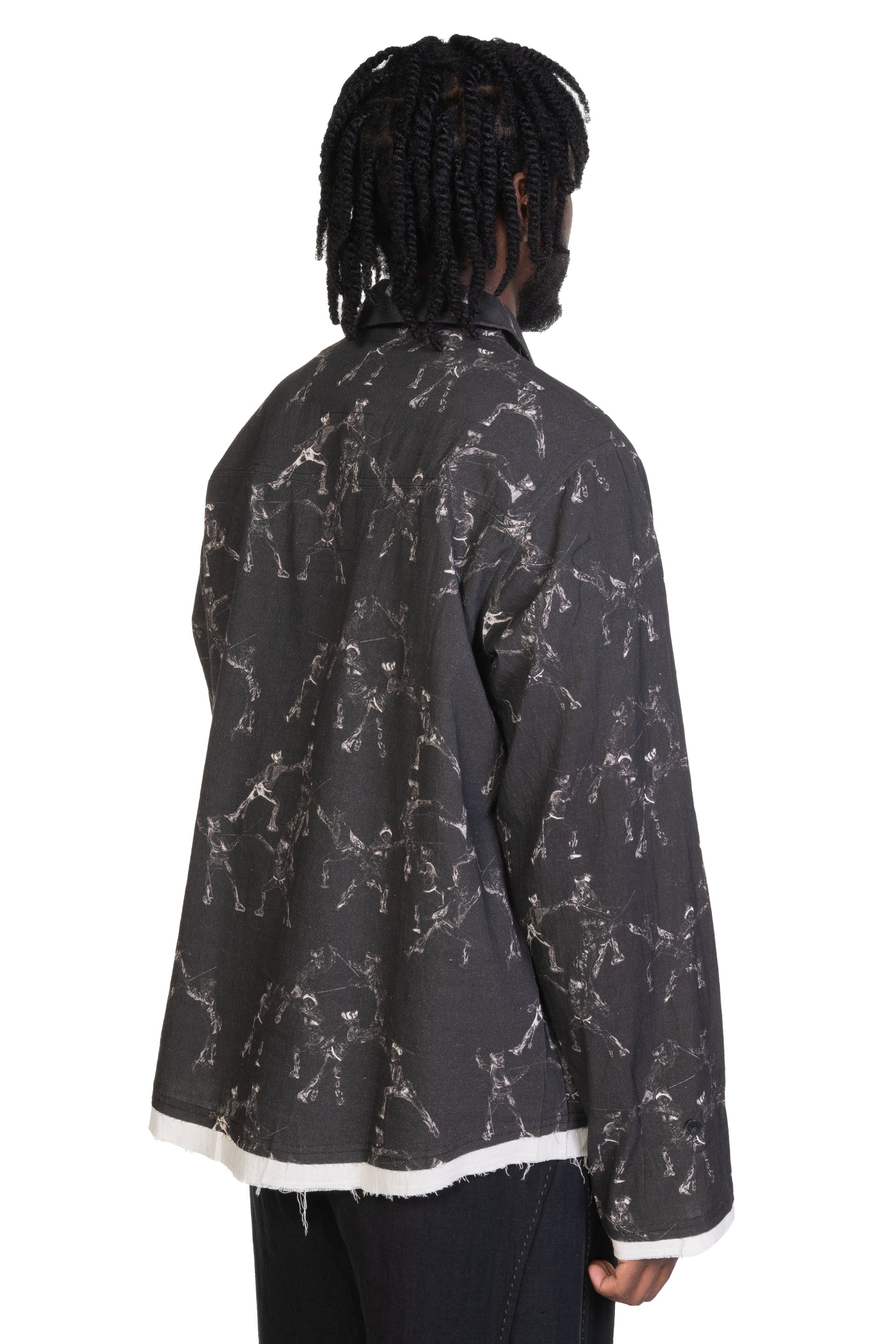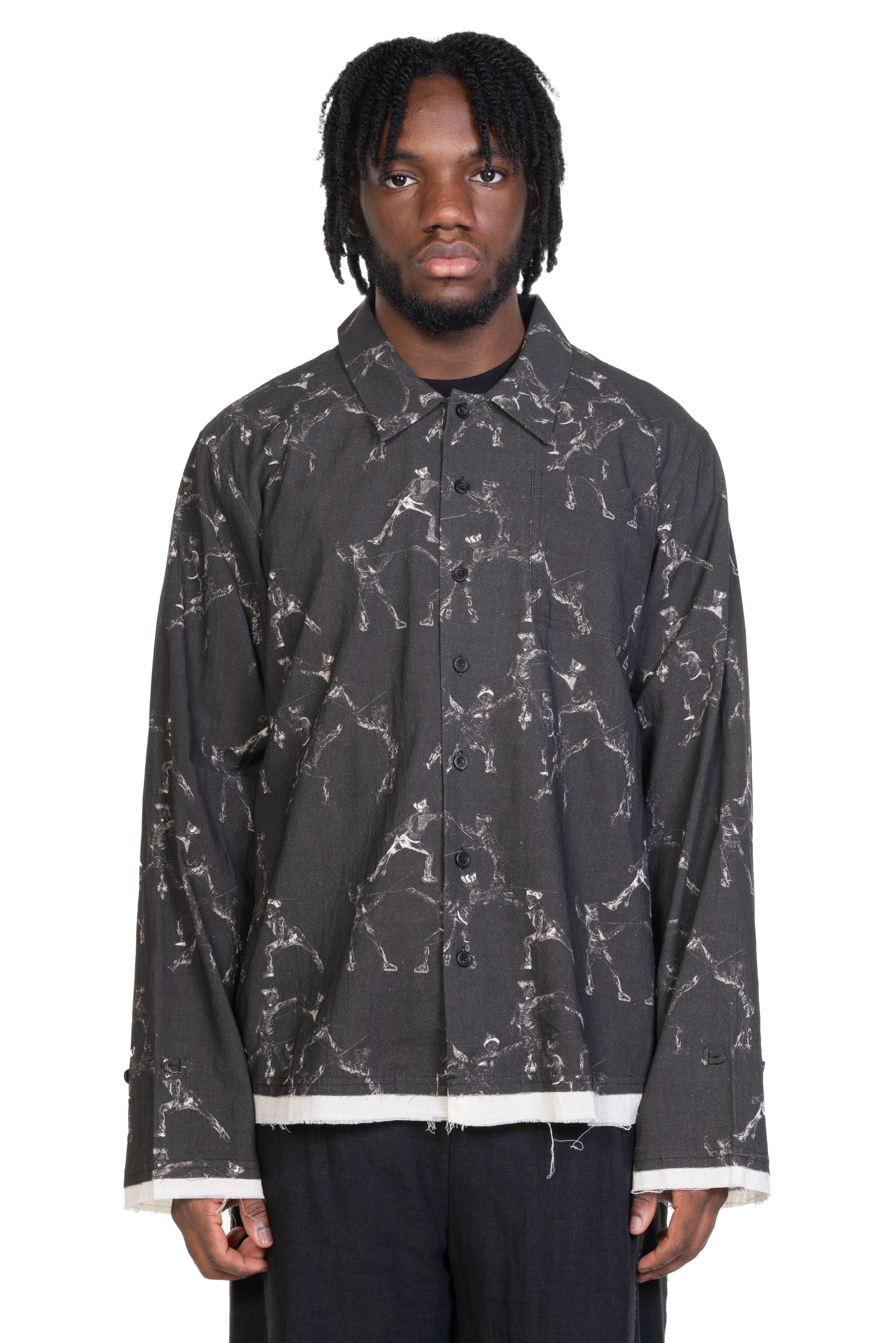 Professor. E understands the time of aesthetics from the use of cotton, hemp and wool. Fabric stitching, patching, designs without edge trimming, deconstruction, and reproduction are all Professor. E's signature elements creating classic immortal designs that can be viewed with the Seasonal Printed Shirt Black.